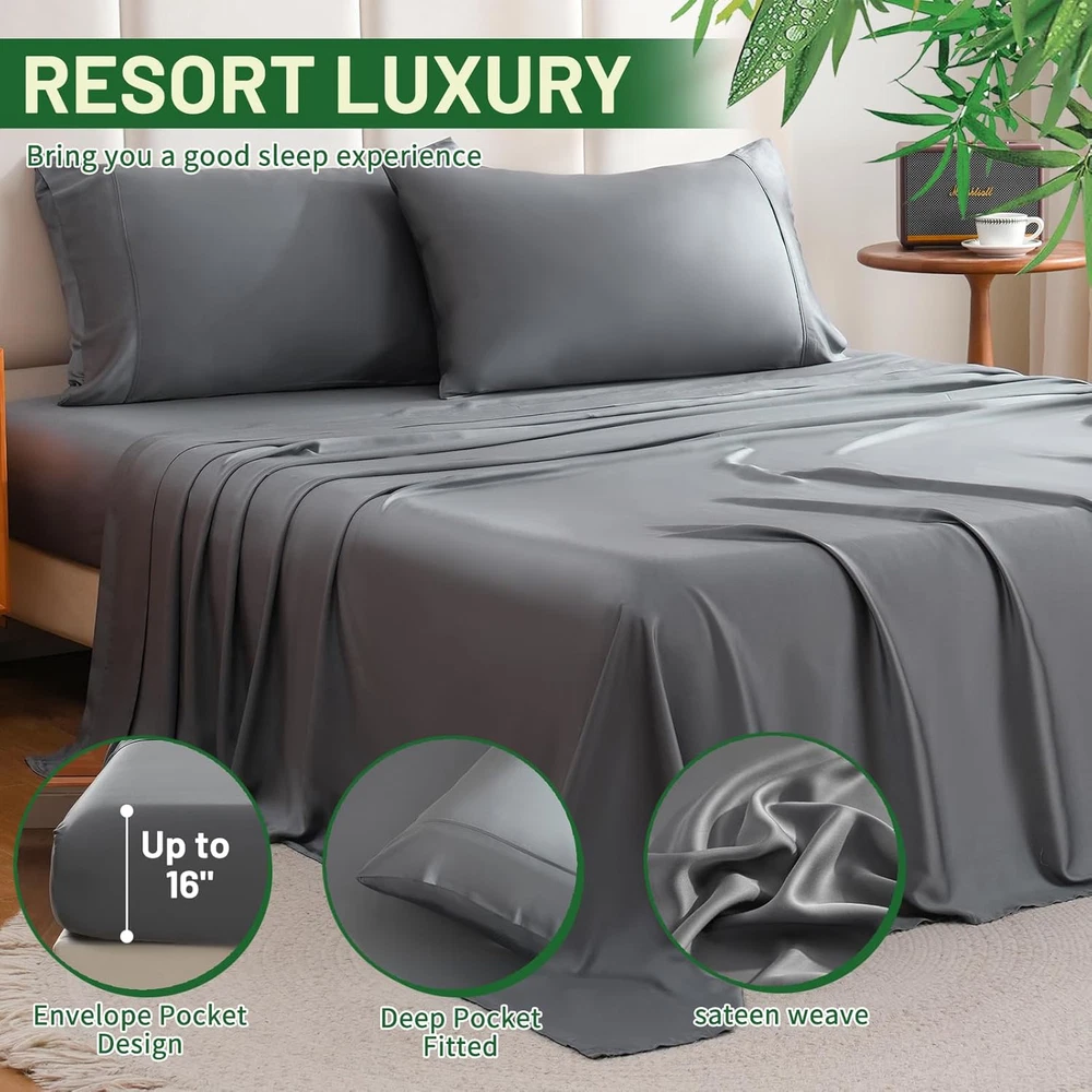 Manufacturer: Bedlifes Number of Pieces: 4 Type: Not Applicable Product Care Instructions: Machine Wash, do_not_bleach Special Feature: Cooling, Silky, Soft, Moisture Wicking, Breathable Thread Count: 400 Pattern: Solid Fitted Sheet Pocket Depth: 16 Inches Style: Modern Country of Origin: China UPC: 696573113126 Brand: Bedlifes Included Components: 2 Pillowcases 20"×30", 1 Flat Sheet 90"×102", 1 Fitted Sheet 60"× Seasons: All, Winter, Summer, Spring Weave Type: Sateen MPN: Not Applicable Color: Dark Grey Item model number: Queen Size Age Range (Description): Adult Package Dimensions: 13.5 x 10.63 x 3.07 inches Size: Queen Material: Rayon Derived from Bamboo Unit Count: 4.0 Count Item Weight: 4.64 pounds gtin13: 0696573113126 Pillowcase Quantity: 2 ISBN: Not Applicable Closure Type: Sheet Set EAN: 0696573113126