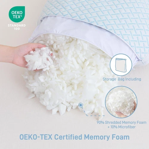 Shredded Memory Foam Cooling Soft Pillow King Size, Adjustable Hypoallergenic Hotel Quality Pillow for Side, Stomach and Back Sleeper, Bamboo Viscose Cover, Oeko-TEX Certified LuxeFusion Product Description Features [ADJUSTABLE LOFT] Customize the shredded memory foam pillow by unzipping the pillow to add or remove filling to suit your body type, shape, or sleeping position. Use the included storage bag for extra filling. It ensures maximum comfort for side, stomach, and back sleepers. [LONG-LASTING SUPPORTIVE] Our shredded memory foam pillow can contour to the natural curves of your head and neck, promoting proper alignment and comfort throughout the night. Its lasting great support helps to relieve pressure and pain, and extend deep sleep time. [COOLING PILLOW] Ideal choice for Hot Sleepers! The outer cover is double-sided, the cooling side is made of cooling ice silky fabric, and the soft side is made of breathable bamboo viscose. Enjoy the cool side in hot summer or the soft side for daily use. Wake up refreshed without sweating or overheating. [HYPOALLERGENIC PREMIUM MATERIAL] Filled with freshly made shredded memory foam, this hypoallergenic, OEKO-TEX Certified pillow ensures a healthy and safe sleep environment. No harmful substances or odors. Suitable for those with allergies or sensitivities. [CUSTOMER SUPPORT] ONLY the outer pillowcase can be washed. DO NOT wash the memory foam fill or inner pillowcase. If you encounter any issues, our customer service team is ready to offer help within 24 hours. Product Details Fill Material: 90% Shredded Memory Foam + 10% Microfiber Pillow Type: Bed Pillow Color: White Size: 1 Pack King Brand: Ankwos Shape: Rectangular Special Feature: Moisture Wicking, Breathable Pattern: Geometric Age Range (Description): Adult Number of Items: 1 Product Dimensions: 34"L x 19"W Product Care Instructions: ONLY outer pillowcase can be washed Style: Modern Item Firmness Description: Soft Model Name: 1 Pack Material Feature: Breathable Unit Count: 1.0 Count Fabric Type: Viscose Made from Bamboo, Polyester, Spandex Item Weight: 5.26 pounds Manufacturer: Ankwos Country of Origin: China Item model number: 1 Pack King 🚚 Free Shipping All orders ship free and fast to your doorstep. 🔁 Easy Returns Satisfaction guaranteed. 30-day returns, no questions asked. 💬 24/7 Support Contact us anytime; we’re here to help, day or night. Brought to you by LuxeFusion – Quality you can trust.