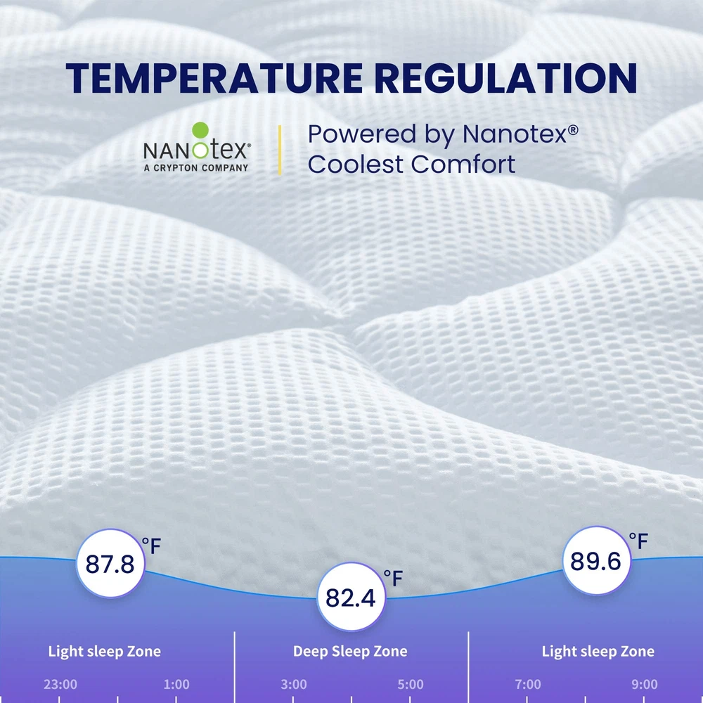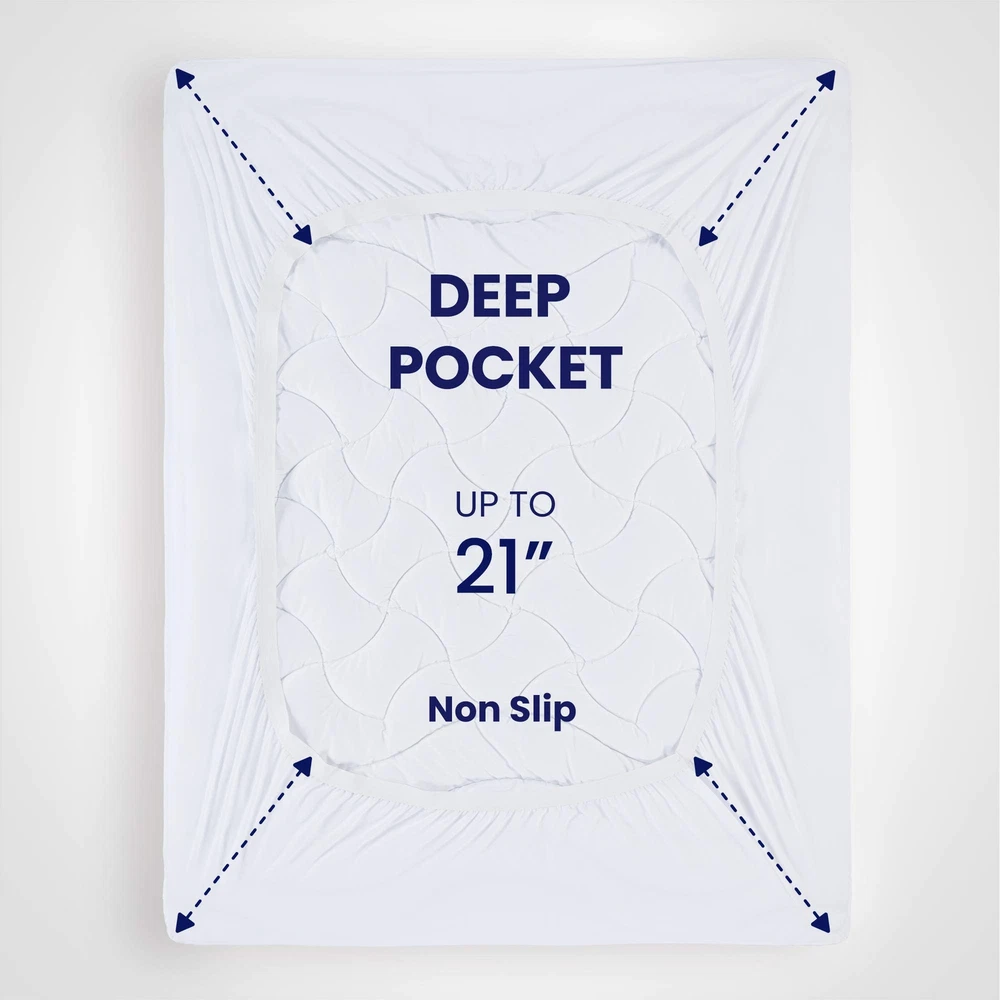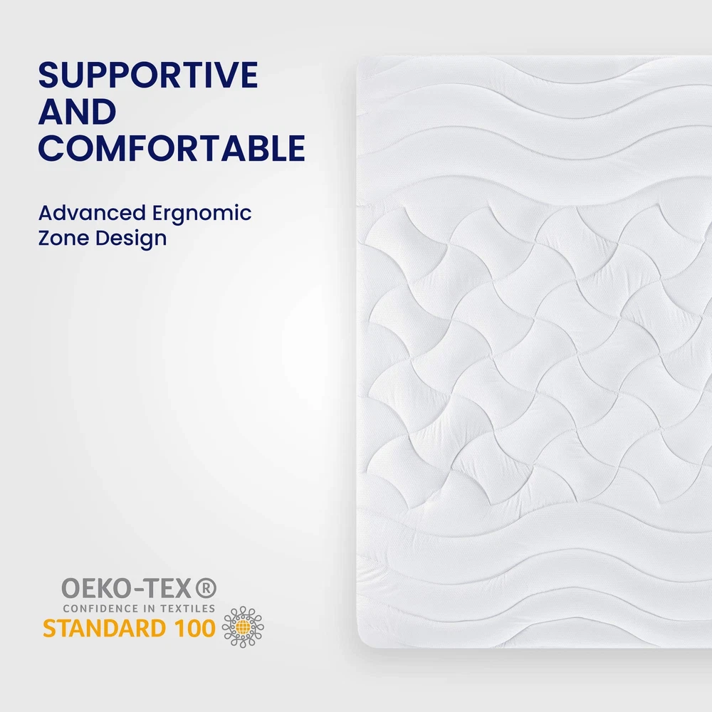 COOLING BREATHABLE - Mattress pad with new NANOTEX Coolest Comfort Technology features moisture-wicking and fast-drying to actually balance your body temperature throughout the night. The sleep surface is treated with an embossed process, which is usually applied to sports fabrics, making it more breathable and stylish than ordinary material and bringing an advanced dynamic vibe to your bedroom. ULTRA SOFT FLUFFY - We use 120gsm thick brushed microfiber as the sleep surface. Overfilled with 12oz 5D spiral fiber, thicker than most on the market. The fiberfill maintains excellent softness and resilience, making this mattress pad super fluffy. Let you enjoy the luxury hotel level of comfort at home. UNIQUE 3-ZONE DESIGN - This mattress pad is ergonomically designed with three zones. The head and foot areas use a wavy design, which can ensure the edge is not deformed. The body area in the middle uses cloud-shaped quilting design to provide a larger body supportive area that disperses the body's pressure and prevents sagging. It helps to keep your body stretched naturally for deep and relaxed sleep. DEEP POCKET EASY CARE - Quilted Stretch-to-Fit (8"-21"): knitted skirt pocket stretches up to 21 inches deep and can be easily placed on most mattresses. The 1.6-inch width of high-quality sport elastic trim securely holds your wrap in place, and its excellent elasticity makes the wrap easy to fit and remove. It ensures you get the most restful and restorative sleep. Machine wash cold, do not use bleach, tumble dry low. SATISFACTION PROMISE - has more than 40 years' experience in the design and manufacture of high-quality bedding. Our products are certified by Oeko-Tex. You can buy with confidence under our excellent product quality and customer service. If you have any inquiries or issues