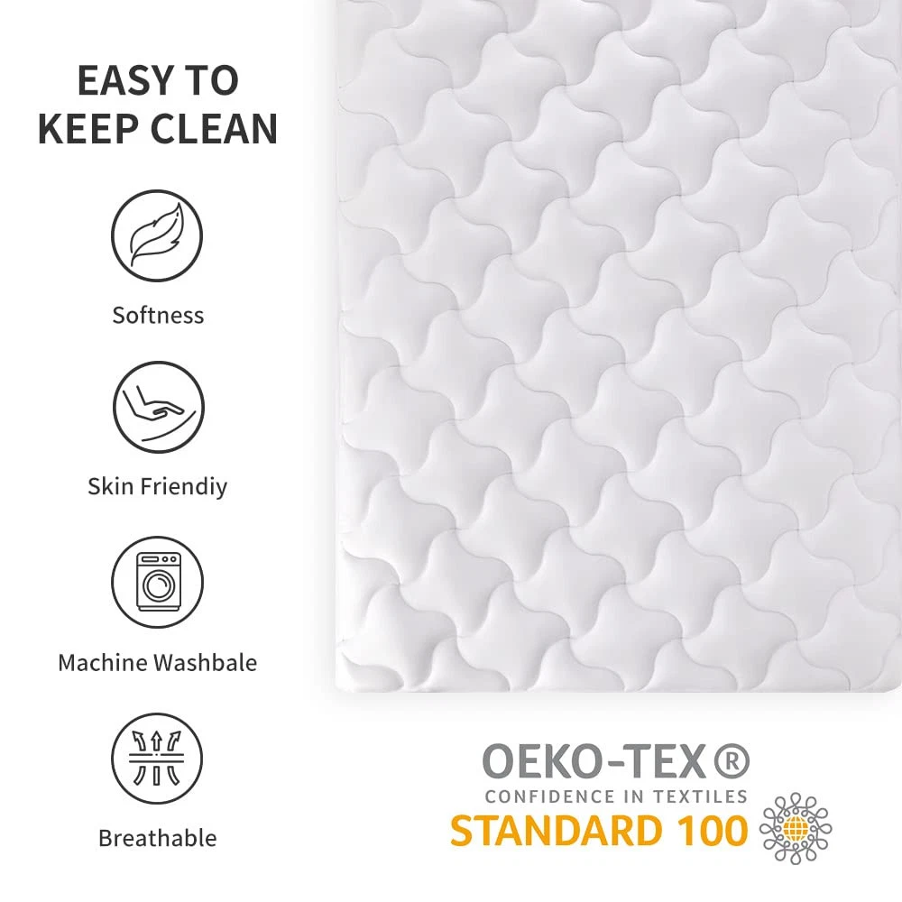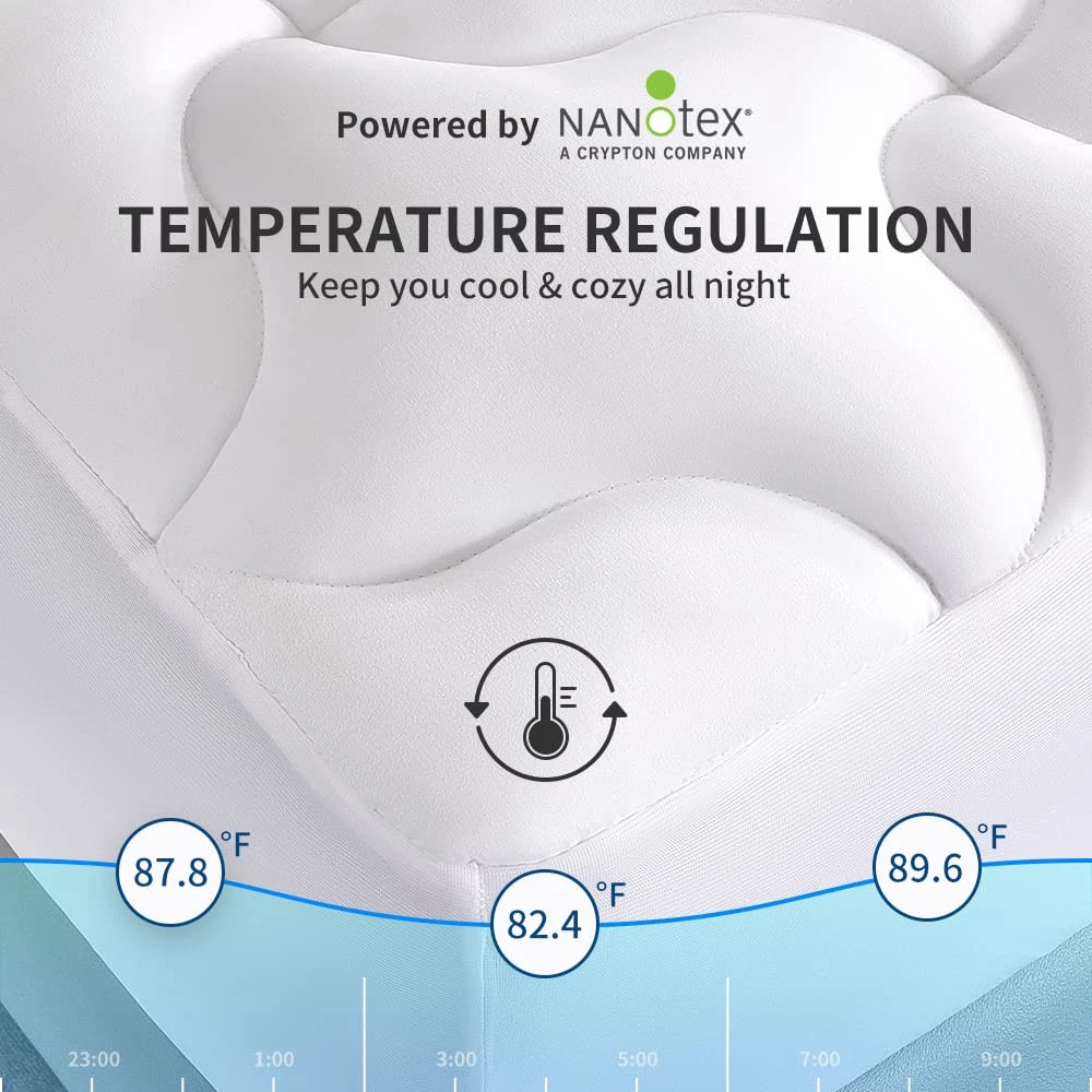 COOLING & BREATHABLE FOR HOT SLEEPERS - Mattress Pad with NANOTEX Coolest Comfort Technology actually balances your body temperature. Fabric treated with advanced moisture-wicking tech dries 100% faster than cotton can keep you cool & dry throughtout the night. You'll wake up refreshed and rejuvenated ULTRA SOFT & CLOUD FLUFFY - 120gsm over-thick brushed microfiber as the sleep surface. Overfilled with 5D spiral siliconized fiber, a state-of-the-art fiberfill that has the feel of goose down. The fiberfill maintains excellent softness and resilience, making this mattress pad super fluffy and provides an extra-ordinary level of comfort DEEP POCKET & EASY CARE - Quilted Stretch-to-Fit 8"-21", knitted skirt pocket stretches up to 21 inch deep and can be easily placed on most mattresses. High quality elastic trim can securely hold your wrap in place, and the stretchable fabric makes the wrap easy to fit and remove. Machine wash cold, do not use bleach, tumble dry low VALUE & QUALITY - We concentrated on every detail to ensure them designed perfectly. We use good quality fabrics and filling to produce our mattress pad. The nanotex cooling breathable fabric and over-thick fiberfill offer greater airflow and breathability and supportive than others to keep you cool and comfortable. It will ensure you to get the most restful and restorative night sleep SATISFACTION PROMISE - We’ve more than 40 years' experience in the design and manufacture of high-quality bedding. All our products have been certified by Oeko-Tex Standard 100 to be free of harmful chemicals, ensuring that they're safe, healthy for you and your family. We value the voice of our customers, if you have any issue with your order, please feel free to us, we'll response within 24 hours
