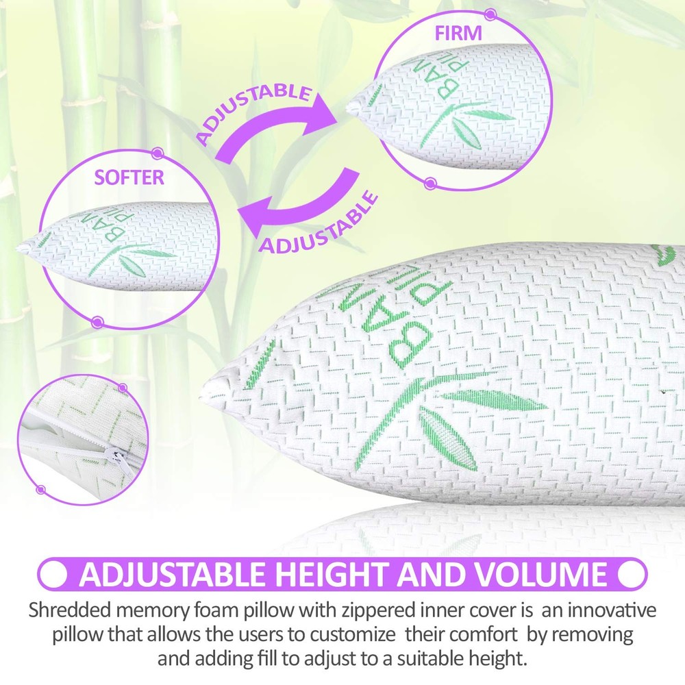 HIGH QUALITY FABRIC AND FILLING: Our pillow covers provide extreme breathability and softness. It's filled with high quality shredded memory foam as you can see on product pictures. It’s soft, conforms to your head, and rebounds quickly to retain its shape. EXCELLENT SUPPORT FOR ALL TYPES OF SLEEPING POSTURE: Our shredded memory foam pillow provides good support for your neck, shoulder, and upper back muscles throughout the night. They are supportive enough for sleepers of all styles (back, stomach and side sleepers), weights, and body types. PILLOW CASE WITH ZIPPER: Our pillow cases with zipper opening on the inner liner allow you to adjust to a suitable height and volume by removing or adding the shredded memory foam. Also with this zippered design case you can remove the pillow case to clean and wash. OEKO-TEX CERTIFIED: Oeko-Tex textiles and fabrics are certified free of harmful chemicals and are safe for human use. Oeko-Tex is a worldwide consistent, independent testing and certification system for raw, semi-finished, and finished textile products at all processing levels, as well as accessory materials used. It provides confidence in textiles. SATISFACTION GUARANTEED: We are so confident in the quality of our product that we offer a 30-day satisfaction guarantee. If you are not satisfied, just contact us to return the product for a full refund or replacement.