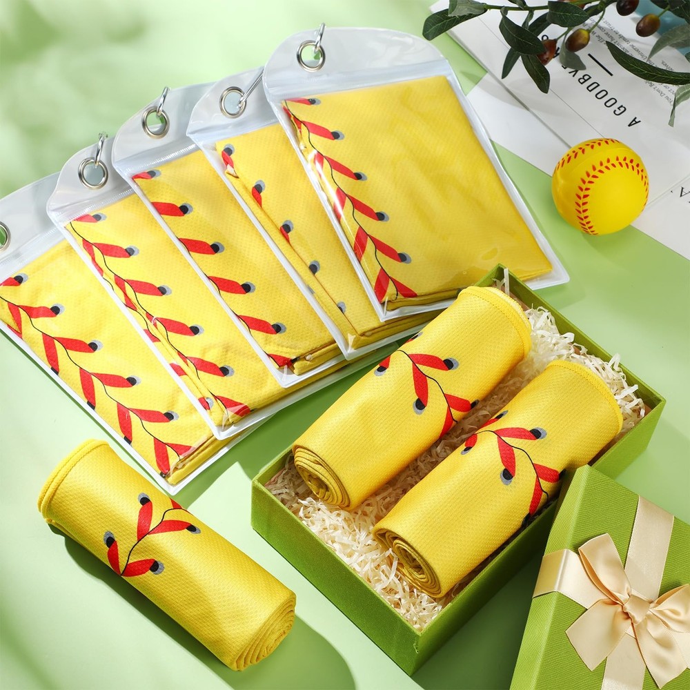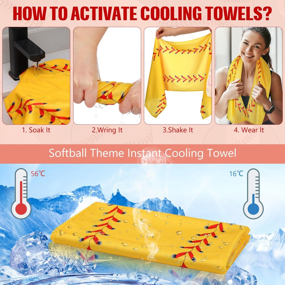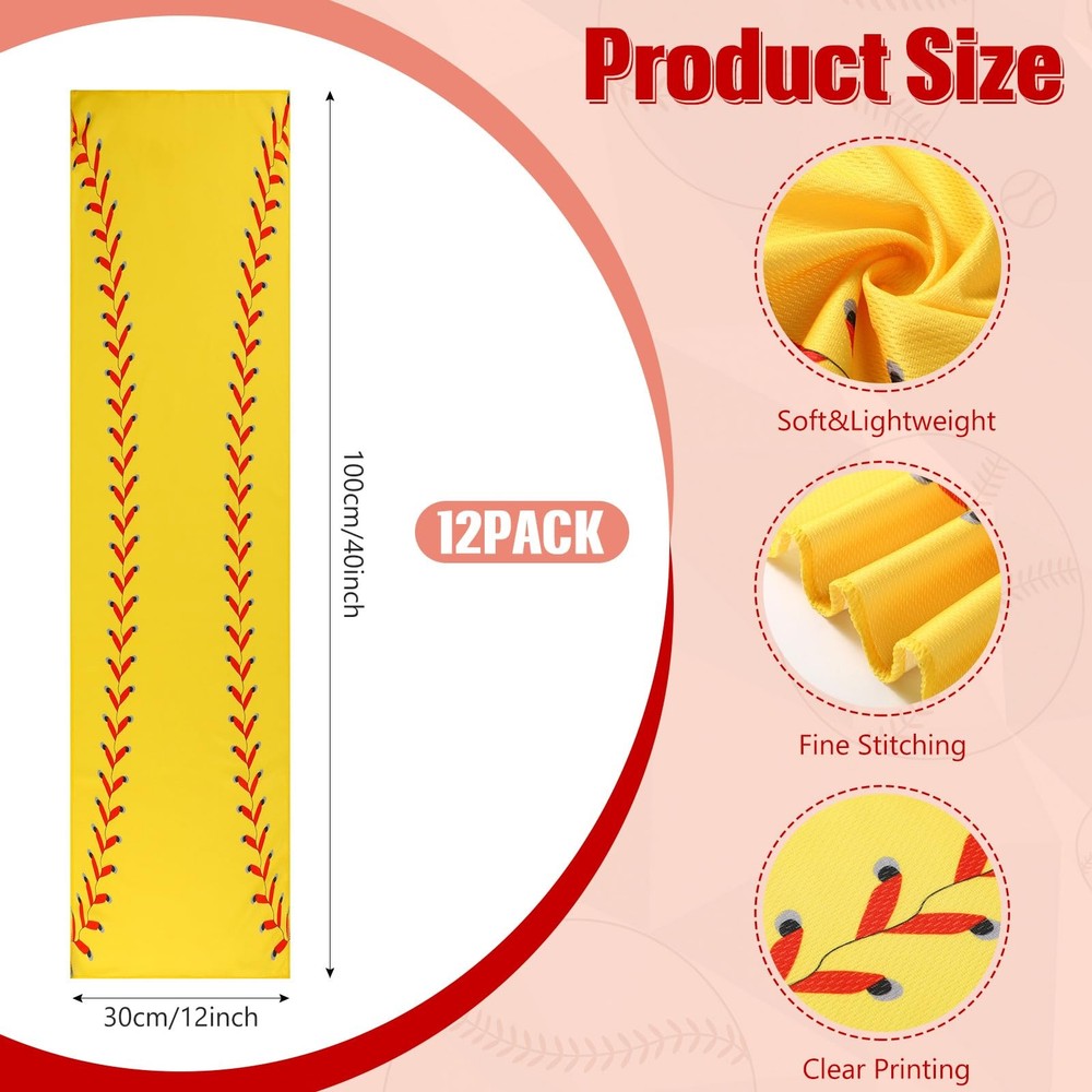 Features: The cooling exercise towel has sweat wicking properties, making them suitable for workouts, sports, or other outdoor activities. The structure of sport towel provides breathability and thereby intensifying its cooling effect, ensuring you remain comfortable and refreshed. Specifications: Material: microfiber Color: classic color Size: about 40 x 12 inch Package includes: 12 x Towels with bags Notes: Manual measurement, please allow slight errors on size. The color may exist a slight difference due to different screen displays. Convenient Package: the package includes 12 of workout towels, ensuring that you experience the comfort and coolness whenever you need; The towels also come with convenient carrying bags, helping to keep the towels easily accessible Quality Material for Cooling Effect: made from microfiber, the cooling towels bulk provides immediate relief from the heat; The use of fibers not only enhances the absorbency but also promotes quick evaporation, delivering a cooling effect that lasts for hours Proper Size for Your Needs: with a generous size of 40 x 12 inches, this softball towel provides sufficient coverage to wipe off sweat or cool down; This size is also convenient for tying around your neck or head to experience consistent cooling during intense activities Appealing Design: our gym towels come in a classic design, featuring a softball print that adds some fun and style to your workout or outdoor activities gear, ensuring you play hard and keep cool, yet look good Easy to Use: first, wet the workout sweat towels at normal temperature, twist it gently, then shake it off to achieve the cooling effect immediately; However, it should be noted that the cold sports towels are only suitable for absorbing sweat and cooling; It does not have strong water absorption capacity and cannot be applied for face washing and bathing