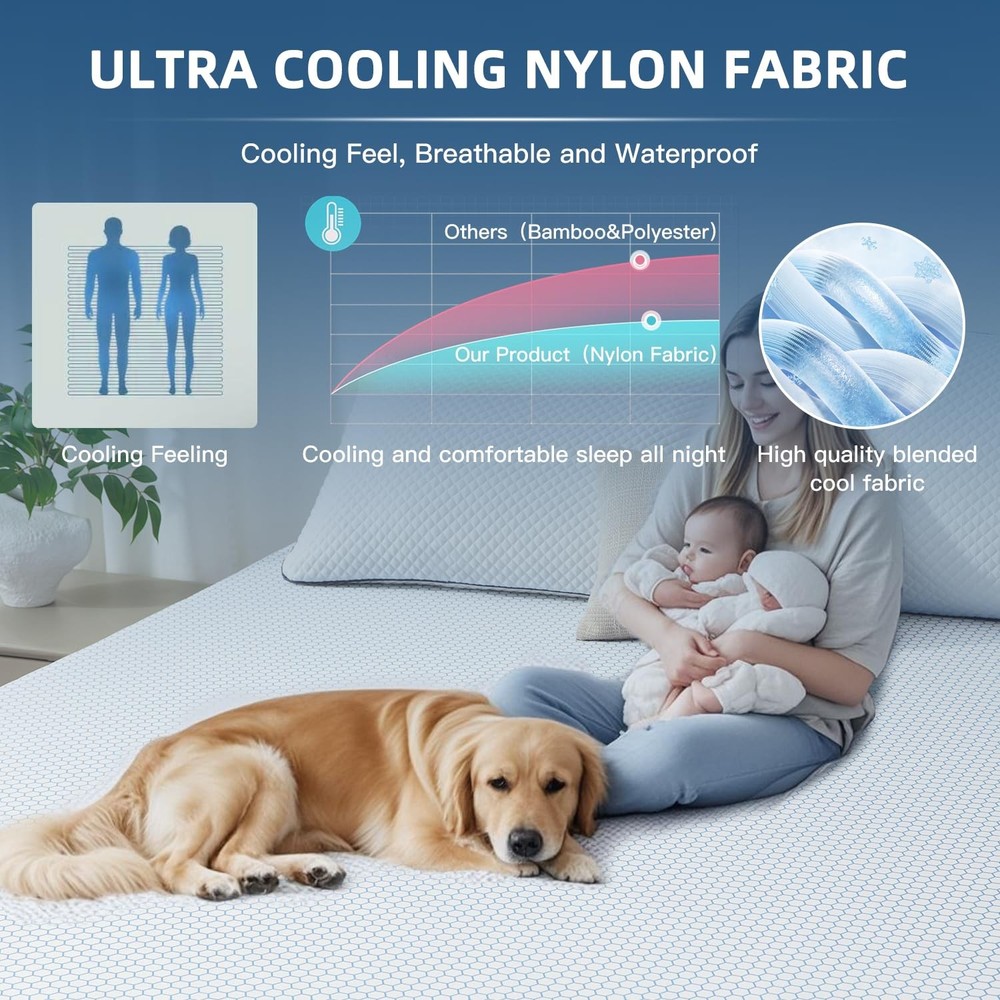 ❄️【Stronger Cooling Fabric】This mattress protector is crafted from 100% premium nylon, featuring advanced cooling technology that delivers a superior cool sensation exceeding viscose made from bamboo, combined with ultra-breathable microfibers for ultimate comfort. When used in air-conditioned rooms, it delivers an intensified cooling sensation, keeping you comfortably fresh and cool throughout the night ☔【100% Waterproof TPU Backing】: We use professional TPU waterproof backing, which is thicker than others and does not contain vinyl or polyvinyl chloride. Protects your pricey mattress against sweat, urine and other fluid spills with its exclusive membrane layer. The mattress cover will protect your mattress from damage. No need to worry about tears in the eyes or blocked nose 🛌【8"-21'' Deep Stretchable Pockets】: The cooling mattress protector features a sturdy elastic skirt and 360° full surround design, ensure fitted bed sheet perfect fit each corner of mattress, provides full protection for the top and sides of the mattress. No matter how you move on the bed,this mattress cover will stay in place all the night. And the mattress protector is easy to install and remove, fit up to 8"-21" mattresses 🤝【Best 】Strive to provide the best , If you are not satisfied with the product after receiving it and have any problems within 100 days of use, please feel free to . Our personnel will reply to you within 24 hours to provide you with the most satisfactory solution 💦【Easy Care】: The mattress protector is machine washable and can be dried at low temperatures. Please wash at water temperature below 30 ℃. Follow specific wash care instructions on the label. After washing 100 times, it can still maintain its cool touch and waterproof performance. Use mild detergent and do not iron, dry clean or bleach