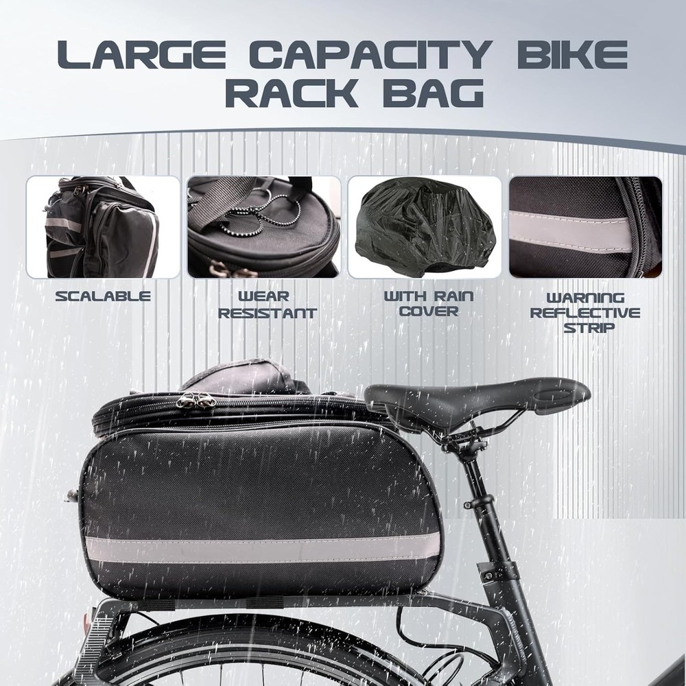 Product description Product information Technical Details Color ‎Black Size ‎27L Brand ‎Coolrunner Material ‎Oxford Vehicle Service Type ‎Bicycle, Truck Item Weight ‎0.74 Kilograms Pattern ‎Solid Mounting Type ‎Rack Mount Strap Type ‎Adjustable Capacity ‎27 Liters Handle Type ‎Strap Number of Compartments ‎2 Shell Type ‎Soft Manufacturer ‎Coolrunner Automotive Fit Type ‎Universal Fit Model ‎Bike Rack Bag Item Weight ‎1.62 pounds Package Dimensions ‎14.06 x 7.13 x 4.76 inches Item model number ‎bike rack bag