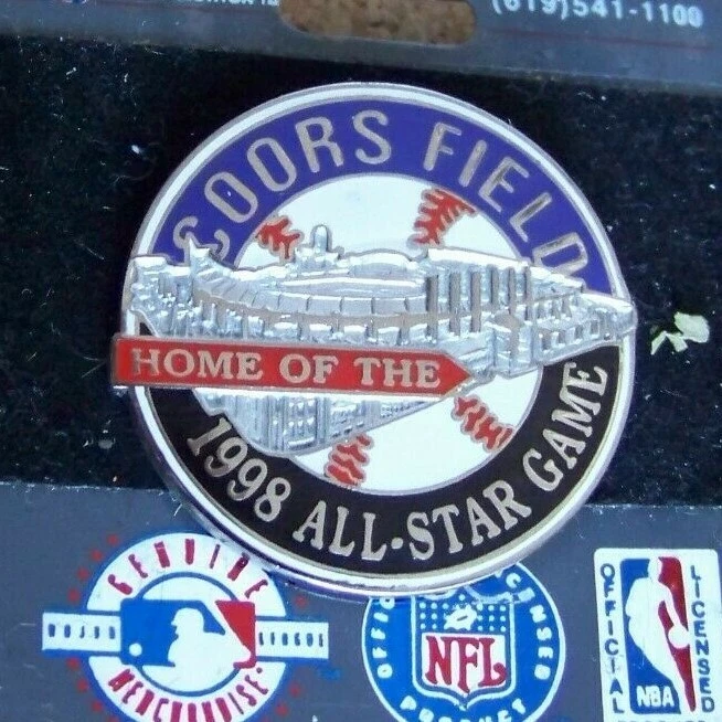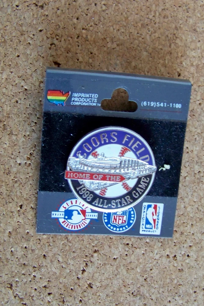 Coors Field 1998 All-Star Game lapel pin Colorado Rockies AS round This MLB licensed silver toned, post and butterfly clasp backed lapel pin measures about 1.25" wide. The First All-Star Game hosted by the Rockies. Although new, unused, there never was protective packaging, only the card so there are some minor nicks and marks. Don’t forget to click on my "Stores" link, next to my eBay name, to see other items I currently have listed for sale, or you can copy and paste this address into your browser: stores.ebay.com/highcountrycollectibles SHIPPING INFORMATION Shipping to U.S. addresses is FREE! HIGH COUNTRY COLLECTIBLES Since 1989 – A LEADER IN THE DENVER SPORTS MEMORABILIA MARKET. Check out my other auctions and listings, and keep an eye out for the different, unusual, and EXCLUSIVE items available nowhere else but from High Country Collectibles