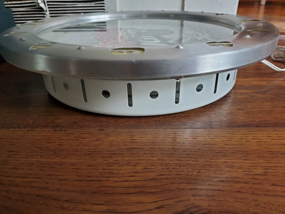 Coor, Light Wall Hanging Battery Operated Lighted Clock, approximately 15.75" wide, 3.25" tall, has a few dents, scratches & missing paint, requires 1 AA battery not included, as pictured no returns. Shipped USPS