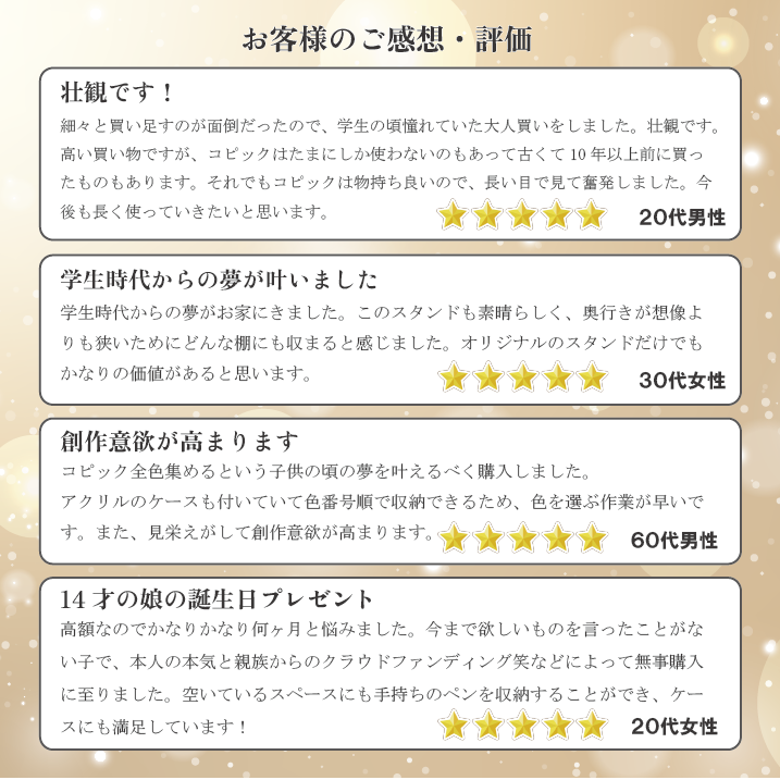 This is the Copic Sketch 358 Color Complete Set , a top-selling item on Japan's Rakuten marketplace. The set includes all 358 Copic Sketch markers along with a high-quality handmade acrylic display stand that enhances your creative workspace. The case is made from “Acrylite” by Mitsubishi Chemical , a top-tier acrylic brand widely used in Japan for its clarity, durability, and professional finish. Each display case is carefully handcrafted by a seasoned artisan with over 50 years of experience . The hand-assembled design features a slightly angled pen holder to make it easier to pick up and organize your markers. This angle is precisely adjusted during production, using a custom assembly process that allows for fine-tuned adjustments—not possible with mass production. If you would like to customize the color or size of the acrylic stand, feel free to contact us. We are happy to discuss custom orders upon request. Description Copic Sketch is Japan’s most celebrated marker system—born in Tokyo, engineered for professionals, and trusted by manga legends—offering an unrivaled 358-color palette, refill-for-life design, and a silky “Super Brush” nib that lets alcohol ink flow like watercolor.( コピック公式サイト , copic.too.com , コピック公式サイト ) Below you’ll find why creatives across 70 countries reach for Copic and why your collection (or store shelf) isn’t complete until it includes these markers. 1. The Icon of Japanese Marker Engineering Copic Sketch debuted in 1993 as the first marker with a flexible brush tip, instantly becoming the gold standard for comic and design work.( copic.too.com , copic.fandom.com ) Every marker is still manufactured in Japan by Too Corporation under rigorous quality control for consistent ink flow and color accuracy.( コピック公式サイト , copicmarkers.com ) Key specs 358 alcohol-based colors arranged in 17 harmony families for effortless blending.( コピック公式サイト ) Dual tips: the famous Super Brush plus Medium Broad chisel for lines or fills.( copic.too.com , nattosoup.blogspot.com ) Refillable & rebuildable —ink and nibs swap in seconds, so one barrel can last a lifetime.( コピック公式サイト , コピック公式サイト , copicmarkers.com ) 2. Craftsmanship You Can See Copic inks are quick-dry, low-odor, and made from premium dyes that deliver glass-smooth gradients without streaking.( アマゾン ) The brush tip is molded to mimic a paintbrush’s spring, allowing feather-light strokes or bold fills with the same nib.( コピック公式サイト , nattosoup.blogspot.com ) 3. A Palette as Big as Your Imagination From delicate BV0000 “Pale Thistle” to radiant fluorescents, every Sketch marker carries a laser-engraved cap code so artists can repeat exact mixes and share tutorials worldwide.( コピック公式サイト , copic.too.com ) Refill bottles match all 358 shades, meaning zero discontinued colors and no “missing hue” frustration.( コピック公式サイト , copicmarkers.com ) 4. Endorsed by Manga Superstars & Global Events Creator World-famous Works How they use Copic Eiichiro Oda ONE PIECE Behind-the-scenes JUMP-RYU! video footage shows Oda blending his colour spreads entirely with Copic Sketch markers. ( The One Piece Podcast , Reddit ) Hiro Mashima FAIRY TAIL , EDENS ZERO Serves as a COPIC AWARD 2025 judge and states “Nothing blends like Copic for my action scenes.” ( Copic Award , Copic Award ) CLAMP Cardcaptor Sakura , xxxHOLiC Officially curated the 24-colour “CLAMP Selection” Copic Sketch set for Sakura’s costumes. ( Chibi Yuuto's CHRoNiCLEs , Facebook ) Paru Itagaki BEASTARS COPIC AWARD 2024 judge; discusses using Copics since art-school days in the post-event interview. ( Copic Award ) Eisaku Kubonouchi Tsurumoku Bachelor Dormitory Featured in Copic’s 30th-anniversary artist interview: “Copic is my main medium every day.” ( コピック公式サイト ) Katsura Hoshino D.Gray-man Keeps the entire 358-colour line-up at home and judged the 2023 COPIC AWARD. ( コピック公式サイト ) Tite Kubo BLEACH , BURN THE WITCH German stage talk: “I colour pages with Copic markers and a touch of coloured pencil—never PC.” ( デビアントアート ) Boichi Dr.STONE , Sun-Ken Rock Live demo streams and fan Q&As show him switching between digital touch-ups and Copic Sketch for traditional finishes . ( Reddit ) 5. Sustainability Meets Smart Investment One Copic Sketch marker can be refilled dozens of times; each 12 ml bottle tops it up in seconds, slashing plastic waste and long-term costs compared with disposable rivals.( コピック公式サイト , KIRISKA ) Replace a worn nib instead of discarding the pen—good for the planet and your budget. 6. Ready to Level-Up Your Art? Full 358-color sets ship worldwide and arrive in compact Japan-made cases that keep caps visible and your desk photo-ready.( Otakufuel ) Whether you illustrate manga panels, design sneakers, or explore alcohol-ink art, Copic Sketch gives you the control, vibrancy, and prestige that cheaper markers can’t match.( アマゾン , Marker Novice ) Own the marker that defines Japanese creativity—choose Copic Sketch and color with the tools the pros trust. Shipping We always send the item with a tracking number. So please place an order without any concern on delivery. You can always track the delivery status. Shipping is only available to the address registered in ebay. If you want us to send another address, please change your address on ebay and then place an order. Shipping is available from Monday to Friday. Weekends are not available because freight companies are closed. We use shipping FedEX,DHL and Japan post. Payment We usually ship within 10 business days of receiving cleared payment. International Buyers - Please Note: Import duties, taxes and charges are not included in the item price or shipping charges. These charges are the buyer's responsibility. Please chec