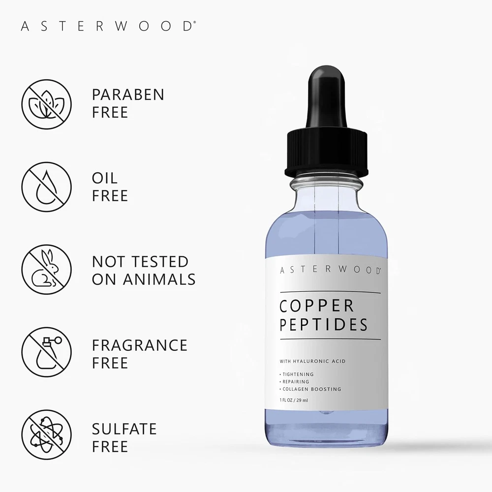 Revitalize Your Skin: Asterwood's Copper Peptides Serum with Hyaluronic Acid combines the rejuvenating power of copper peptides and the hydrating benefits of hyaluronic acid to deliver visible results. Advanced Skin Renewal: Copper Tripeptide-1 GHK-Cu is a powerful anti-aging ingredient known for promoting collagen and elastin production, which helps to improve skin firmness and reduce the appearance of fine lines and wrinkles. Intense Hydration: Hyaluronic acid, an ingredient known for its excellent hydration properties, helps reduce the appearance of fine lines and wrinkles and maintains the skin's moisture barrier, providing long-lasting moisture and plumpness. Lightweight Formula: Absorbs quickly and easily without leaving any residue, making it perfect for daily use and suitable for all skin types. Gentle, Fragrance-Free, and Vegan: Free from any fragrances or irritants, no sulfates, parabens, or phthalates, ensuring a gentle application that won’t cause irritation or dryness. Cruelty-free. Product Description HOW DOES COPPER TRIPEPTIDE-1 (GHK-CU) WORK? GHK-Cu is a powerful copper peptide complex that supports skin remodeling and enhances collagen production -- revealing visibly firmer, tighter, and smoother-looking skin. Build Your Evening Routine Complete Your Routine with Targeted Solutions Add to Cart Add to Cart Add to Cart Add to Cart Add to Cart Add to Cart Add to Cart Customer Reviews 4.3 out of 5 stars 187 4.0 out of 5 stars 190 4.3 out of 5 stars 78 4.5 out of 5 stars 166 4.5 out of 5 stars 26 4.5 out of 5 stars 26,179 4.2 out of 5 stars 290 Price $13.99 $ 13 . 99 $14.25 $ 14 . 25 $14.99 $ 14 . 99 $9.99 $ 9 . 99 $12.99 $ 12 . 99 $9.99 $ 9 . 99 $13.99 $ 13 . 99 Skin Benefits Tightens and Boosts Collagen For Plump & Hydrated Skin De-puffing and Anti-aging Gently Cleanses & Hydrates Gently Exfoliates & Smoothens Boosts Hydration & Moisturizes Anti Wrinkle, Boosts Hydration Key Ingredients Copper Peptides Hyaluronic Acid Caffeine, Peptides, HA Hyaluronic Acid, Coconut Oil Glycolic Acid, Salicylic Acid Hyaluronic Acid Bakuchiol Texture Weightless Serum Weightless Cream Weightless Serum Rich Lather Weightless Serum Weightless Serum Weightless Serum Skin Care Step Repair Hydrate Repair Cleanse Exfoliate Treat Repair When to Use For Evening Use For Morning & Evening Use For Morning and Evening Use For Morning & Evening Use For Evening Use For Morning & Evening Use For Morning & Evening Use Skin Type All Skin Types All Skin Types All Skin Types All Skin Types All Skin Types All Skin Types All Skin Types