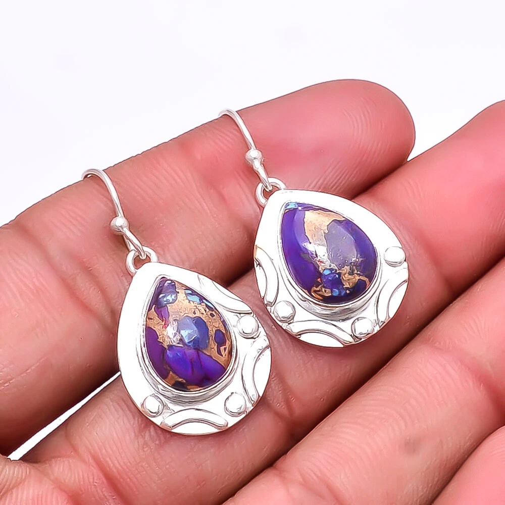 Theme Beauty Main Stone Depth As Seen in Picture Main Stone Length As Seen in Picture Main Stone Width As Seen in Picture Seller Warranty Yes Shape As Seen in Picture SKU E_9280_190_1 Main Stone Cut Type Cabochon Main Stone Size 14X10 Mm Antique Yes Handmade Yes Type Earring Style Drop/Dangle Metal Sterling Silver Metal Purity 925 Parts Per 1000 Base Metal Sterling Silver Total Carat Weight 32 Main Stone Copper Purple Turquoise Main Stone Creation Lab-Created Main Stone Shape Pear Main Stone Color Purple Main Stone Treatment Lab-Created Material Gemstone, Stone Number of Gemstones 2 Item Length 1.56 Features Engraved, Nickel-Free, Handcrafted Ear Area Lobe Brand Unbranded Country/Region of Manufacture India Country of Origin United States Color As Seen in Picture Diamond Clarity Grade Not Applicable Number of Diamonds As Seen in Picture Item Diameter As Seen in Picture Gemstone Clarity Grade Opaque Diamond Color Grade Not Applicable Customized No Colored Diamond Intensity Not Applicable Certification 100% Genuine Guaranteed Setting Style Bezel Occasion Christmas, Birthday, Anniversary, Engagement, Wedding, Valen Shipping & Handling - Charge - 1st item-5.90 And Additional item-1.90 Handling Time - 1 Days . Delivery Time - 2 TO 3 DAYS. Shipping Service - USPS First Class Package 2 -3 Days. Returns - 1.We offer a 100% Money Back Guarantee minus shipping for 30 days after receiving the Item / item's. 2..The item must not be altered or damaged in any way shape or form. 3.Upon receiving these items your payment will be refunded. 4.Email us for return instructions before sending merchandise back. 5.Please allow up to 1 business day for all returns to receive credit. 6.Sizing does not affect the return policy. Payment - We accept PayPal for Payment ,should made with in 14 days once buying or winning done , in case of late information expected .
