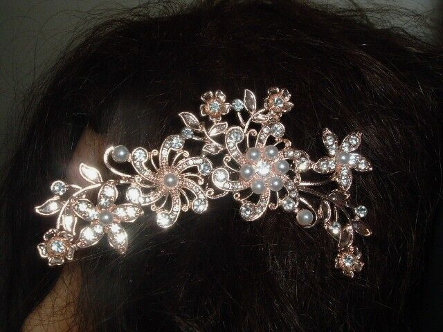Perfect for a wedding, prom, night on the town, anytime you want to be glamorous and sparkle. A 4" wide copper slide hair comb with white pearls and rhinestone flowers, never worn, condition is pristine.