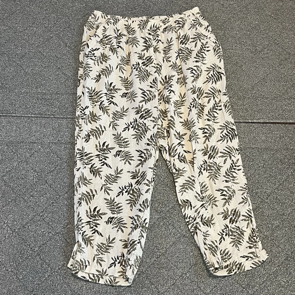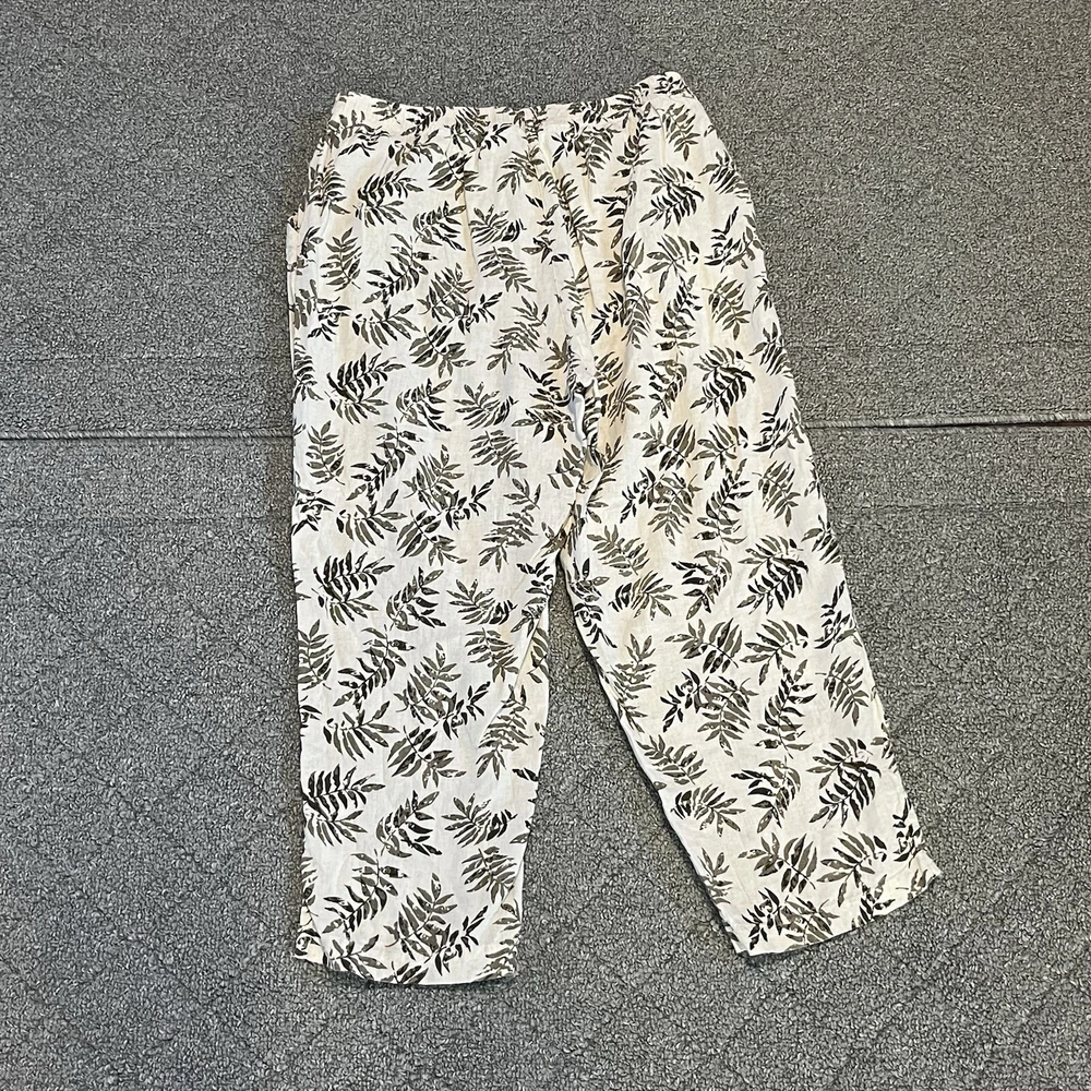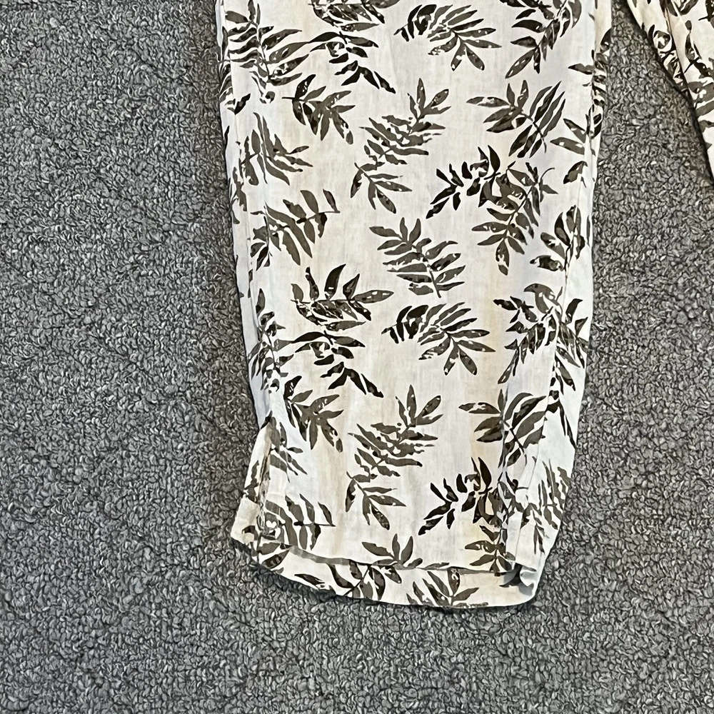 Coral Bay Pants Womens size Medium White Green Floral Cropped Tropical See measurements for accurate fit Inseam 21 inches Rise 11.5 inches Waist 13.5 inches across Measurements are done flat lay Missing drawstring
