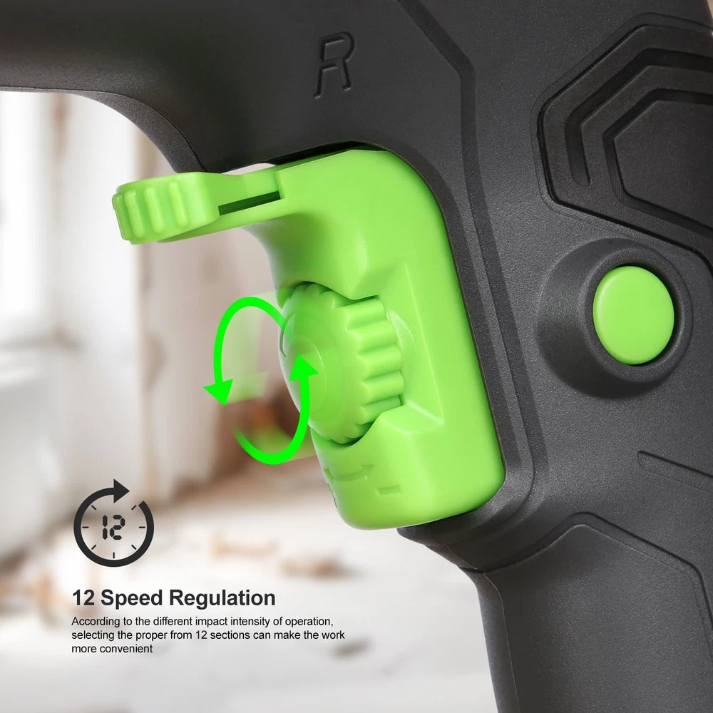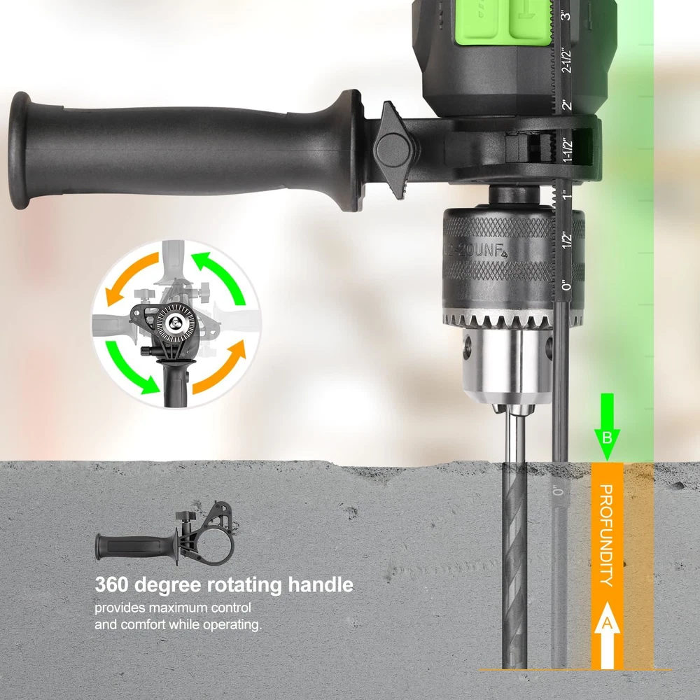 Powerful Motor: Features a 4.5 Amps copper motor which delivers a very nice performance at 3000RPM. Providing additional durability to support overload production for drilling and chipping on wood, masonry, steel, wall, concrete and other hard materials 2 Functions in 1: Equipped with a green dual-mode selector on the top, you can easily switch between hammer and drill functions by one button according to various work requirements. Twelve adjustable speeds can handle different impact intensities of operation, selecting the proper from 12 sections to make the work more convenient 1/2 Keyed Metal Chuck: Our drill has a sturdy and durable metal chuck, its maximum chuck diameter is 1/2''. A variety of replaceable drill bits can meet the needs of different drilling materials 360 ??Rotatable Handle: The ergonomic and rubberized grip offer a comfortable and pleasant working environment. The included 360 ??adjustable side handle can ensures the best possible control of the machine What you will get: 1 x impact drill, 5 x construction drill bits, 1* auxiliary handle, 1 x chuck key, 1 x manual
