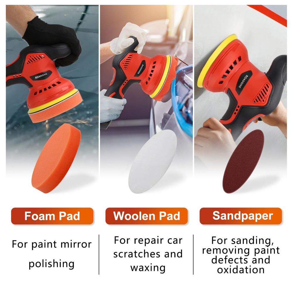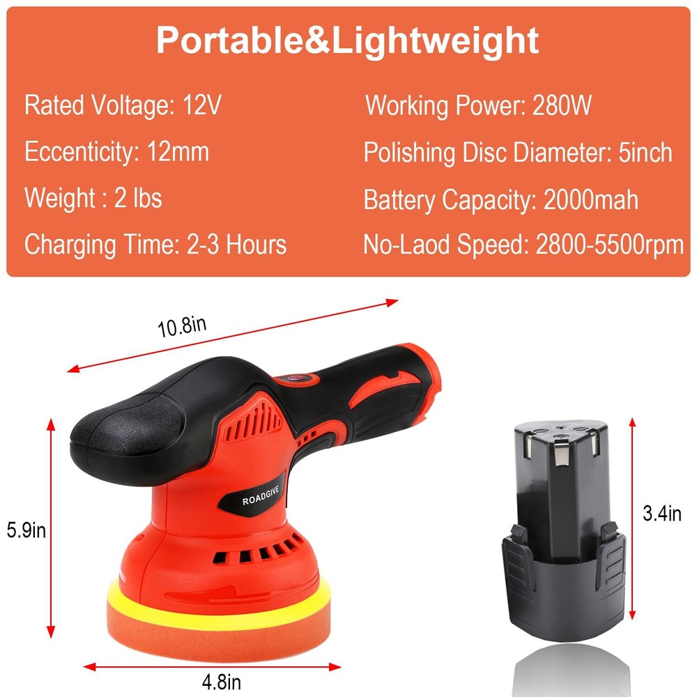 Product Parameter: 5-inch diameter (it can be replaced with a 6-inch polishing disc by using a flat 24mm opening hand wrench), 8 variable speeds, 2000mAh battery capacity, 2800-5500r/min no-load speed, 12V voltage, 280W working power, 12mm rccentric distance, 2.6 pounds weight Powerful Performance: Equipped with a mighty 2000mAh lithium battery, charging is simple and economical. This polisher ensures you have ample power to tackle the most exquisite car detailing jobs 8-Speed Control: The maximum speed can be manually adjusted to 8 levels, up to 2500-5500rpm. You can choose the appropriate speed according to different usage scenarios. It is an ideal polishing tool for polishing/waxing/buffering well, refresh your car Portable and Lightweight: Only 2.6 pounds light weight. This cordless car buffer polisher is not limited by cables, just plug in the battery and you can use it anywhere. Apart from that, the ergonomic design of the cordless car buffer provides comfortable operation, enabling you to work for long hours without discomfort What You Will Get: Buffer Polisher x1 ; Battery x2 ; Charger x1 ; Flat Sponge Pad x2 ; Wave Sponge Pad x2 ; Wool Wheel Pad x2 ; Cotton Towel Polishing Cover x5 ; Sandpaper x3 ; Waterproof Apron x1