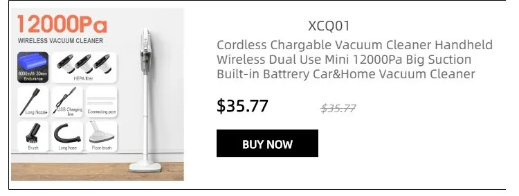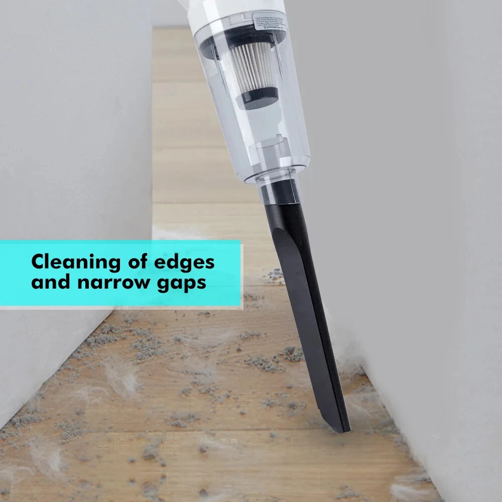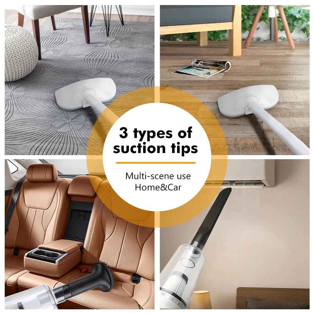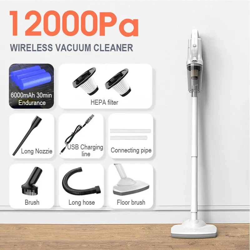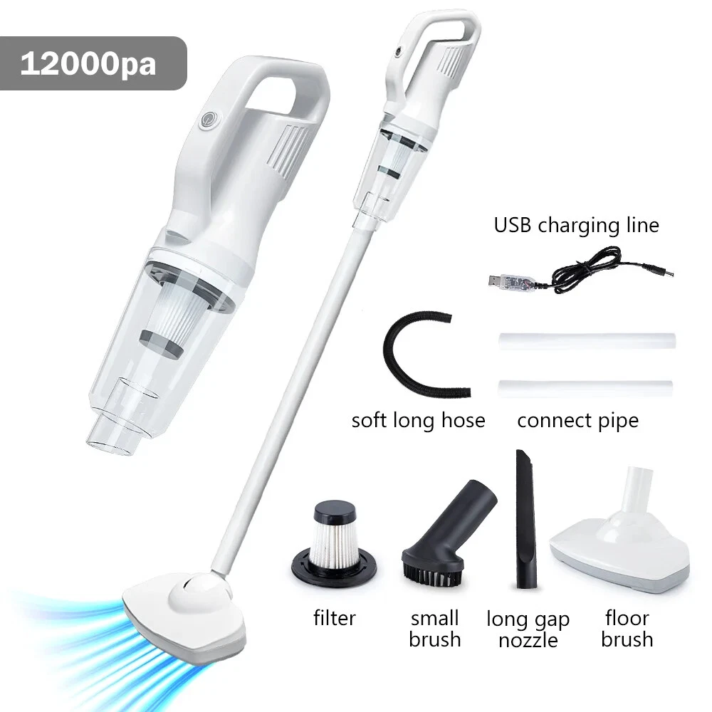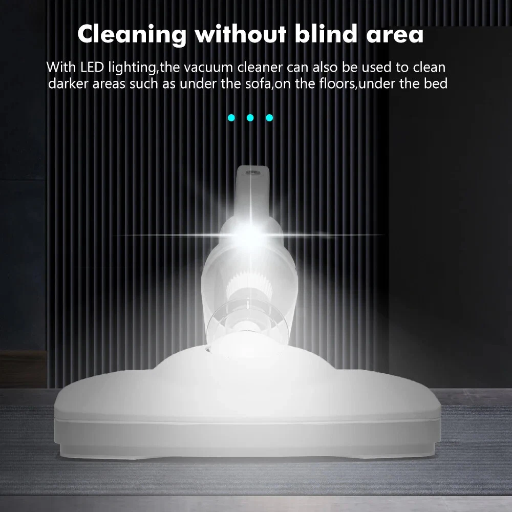 Product description Product name:Wireless vacuum cleaner Suction:12000PA Rated power:120W Rated voltage:11.1V Product size:377x120x89mm Dust cup capacity:0.53L Host Weight:600G Gross weight:1445g Battery capacity:2000mAh*3 Filter:HEPA Product color:White 12000Pa Powerful suction Suitable for cleaning blankets or any floor type Hair/bacteria/dust mites wide usage Suitable for hair and dust cleaning Suitable for oatmeal rice cleaning Suitable for coffee,milk liquid cleaning Cleaning without blind area With LED lighting,the vacuum cleaner can also be used to clean darker areas such as under the sofa,on the floors,under the bed Cleaning of edges and narrow gaps Cordless Household Vacuum Cleaner 120W Power rating Powerful power support, effective and fast vacuuming, long-lasting suction power without recession or heat. 3 types of suction tips Home&Car 3 in 1 clean heads