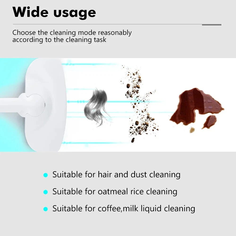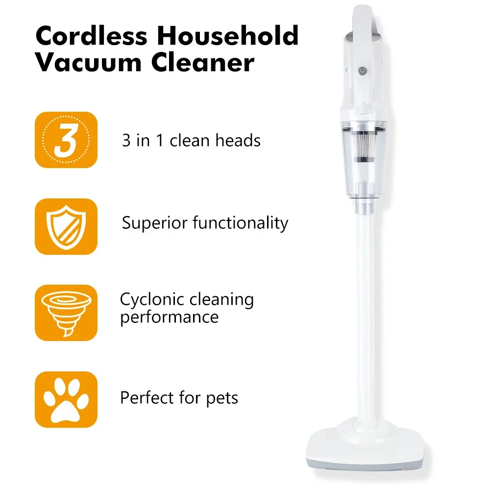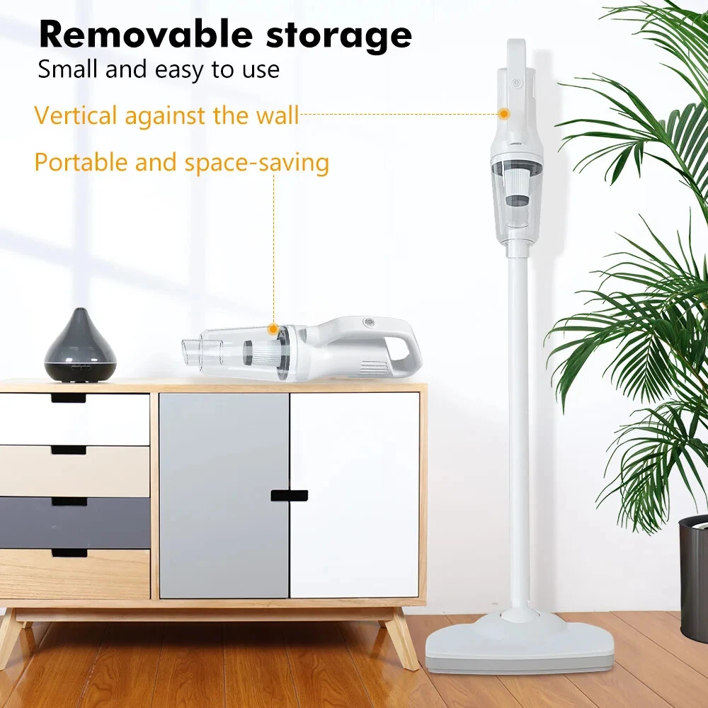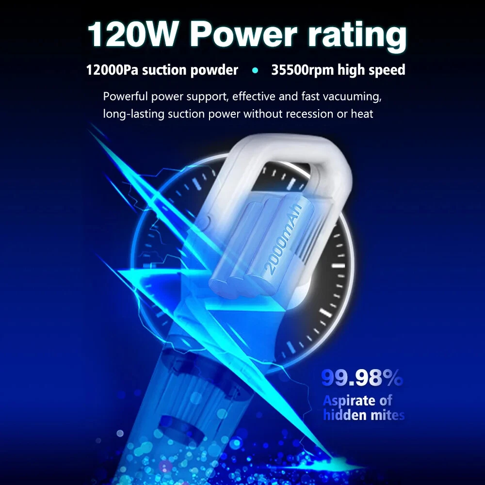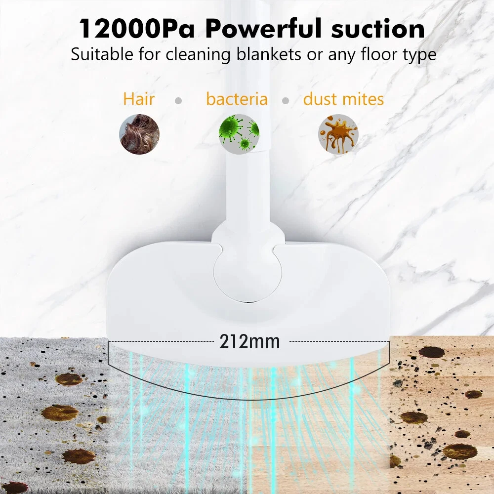 Product description Product name:Wireless vacuum cleaner Suction:12000PA Rated power:120W Rated voltage:11.1V Product size:377x120x89mm Dust cup capacity:0.53L Host Weight:600G Gross weight:1445g Battery capacity:2000mAh*3 Filter:HEPA Product color:White 12000Pa Powerful suction Suitable for cleaning blankets or any floor type Hair/bacteria/dust mites wide usage Suitable for hair and dust cleaning Suitable for oatmeal rice cleaning Suitable for coffee,milk liquid cleaning Cleaning without blind area With LED lighting,the vacuum cleaner can also be used to clean darker areas such as under the sofa,on the floors,under the bed Cleaning of edges and narrow gaps Cordless Household Vacuum Cleaner 120W Power rating Powerful power support, effective and fast vacuuming, long-lasting suction power without recession or heat. 3 types of suction tips Home&Car 3 in 1 clean heads