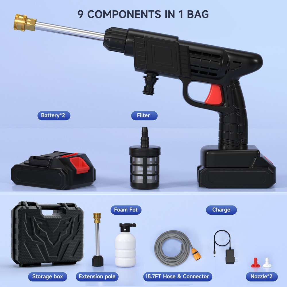 Product Description Description: With this cordless electric car pressure washer, you can clean furniture, cars, gardens, stairs and pool dirt in minutes. Made of high-quality materials, the electric pressure washer can help you wash off those hard to clean surfaces and dirt. With a cordless design that gets rid of cords for a better look, you don't need to worry about getting tangled in cords or relying on your garden hose for water. Freeing you from the inconvenience of a corded pressure washer. It can be used not only for cleaning cars, bikes, motorcycles, etc., but also for cleaning balconies, windows, decks, exterior walls, floors, fences, gardens, etc. Feature: -Powerful motor : This cordless car high-pressure washer is equipped with a pure copper motor. Unlike the traditional motor, the all-copper motor drives the commercial structure pump, substantially increasing the water pressure by 86%, ensuring that the machine is more efficient, stable and durable. -Different water spray modes : Different spray patterns can be selected. High-pressure direct spray mode for powerful cleaning of hard-to-remove dirt; fan spray mode expands the rinsing area. You can choose according to your needs. -Portable cordless design : The battery-powered pressure washer features a cordless design that gets rid of cords for a better looking. Assembly takes only a few minutes and the high capacity battery provides removable power for outdoor applications. The self-priming feature allows water to be drawn from taps, rivers and buckets.- Easy to assemble : The portable handheld pressure washer is easy to assemble and it takes only a few minutes to finish. A carrying box is included. You can put it into the plastic carrying box which is easier and more convenient for you to carry. -Multiple application : It is lightweight and portable. Suitable to be used not only for cleaning cars, bikes, motorcycles, etc., but also for cleaning balconies, windows, decks, exterior walls, floors, fences, gardens, etc., or the places that are difficult to clean manually. Specification: Type: Water Pressure Washer Color: Black Power Source: Battery Battery voltage: 24VF Rated pressure: 26Bar Battery capacity: 6mah Per 1 Battery Water pressure: 26Bar Water hose length: 4.8m/189inches Shooting range: 4-6m/157.48-236.22inches Number of batteries: 2 Material: ABS Plastic Include: 1*Host 2*Batteries 1*Tool Box 1*Inlet Hose 1*Foam Kettle 1*Charger 1*Extension Rod 1*0°Outlet Nozzle 1*40°Outlet Nozzle 1*Inlet Filter 1*Instruction Shipping Returns Warranty Feedback About US ✔ Same business day free shipping within United States ✔ Delivery Time: 3-5 business days (continental U.S.). ✔ Order Processing: Ships within 3 business day (Mon-Fri, excludes holidays). ✔ Tracking Info: Provided automatically via eBay. ✔ All orders will be shipped through USPS First Class, UPS and Fedex depends on the weight of the items. ✔ Shipping notification will be emailed to you once package has been shipped Fast & Reliable Shipping – Your order is our priority! We package all items with care to ensure safe arrival! Tracking number emailed as soon as your order ships! 🌍 Ships from U.S. Warehouse – No long waits! 📦 Standard Shipping (Free): 3-5 business days (U.S. only). ULTRA-FAST SHIPPING – Because you shouldn't wait! We guarantee on-time delivery or your shipping fee back! 60-Day Hassle-Free Return Policy We offer 60-day free returns for your peace of mind. To ensure a smooth process, please contact us first before opening a return request—we'll gladly help resolve any issues! ⭐ Return Requirements: ✅ Unused & in original packaging ✅ Contact us immediately if the item is defective/damaged (photos/video required) ✅ Repack securely to prevent shipping damage ⚠️ Important Notes: • If returning due to change of mind, please select: "Changed mind" or "Didn't like item" Defective/damaged items? Contact us immediately with photos/video proof • Incorrect return reasons (e.g., falsely claiming "defective") may result in a refused refun d. ⭐ Return Process: • Contact us → We'll provide return instructions. • Ship the item back with tracking (recommended). • We inspect returns within 3-5 business days. Approved refunds are issued to your original payment method (processing time varies by bank). ⭐ Need Help? Message Us First! We're happy to offer alternative solutions, including replacements or discounts, before you proceed with a return. Your satisfaction is our top priority! No-Questions-Asked Warranty ⭐ HASSLE-FREE WARRANTY • 90-365 Day Coverage (varies by product - see listing details) • No Return Required for claims under $50 - we ship replacements immediately ✖ Exclusions: • Physical damage (drops/accidents) • Installation errors (YouTube tutorial links provided) • Modified/tuned vehicles Professional Installer Warranty ⭐ CERTIFIED INSTALLATION WARRANTY ✔ installed by licensed mechanics ✔ Free Technical Consultation before installation ⭐ Feedback & Satisfaction Policy Your 5-Star Reviews Help Us Grow! We're committed to your complete satisfaction. When you receive your item and are happy : ✅ Please consider leaving positive feedback about your experience ✅ Share what you loved (fast shipping? great packaging? accurate description?) Our Promise to You: ✔ 100% satisfaction guarantee - we stand behind our products ✔ Open, honest, and timely communication ✔ Always respond within 24 hours to any concerns Before Leaving Feedback: ⭐ Contact us first if anything is less than perfect ⭐ Allow us to make it right (replacement/refund/store credit) ⭐ Negative feedback won't solve issues - but we will! Important Notes: • Feedback about shipping carriers should go to their official channels • eBay cases opened without contacting us first void satisfaction guarantees We value your voice - let's work together for a great eBay experience! Our company [Amotopart] begins our business in 