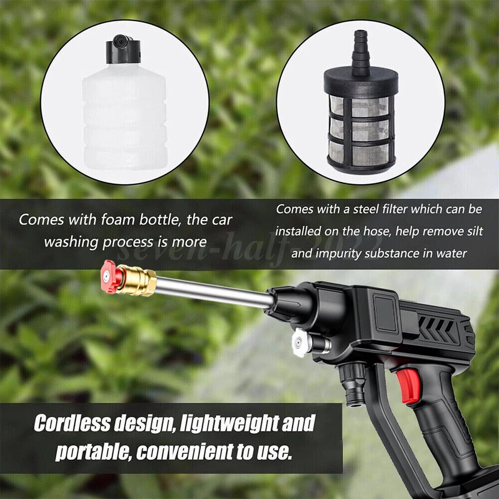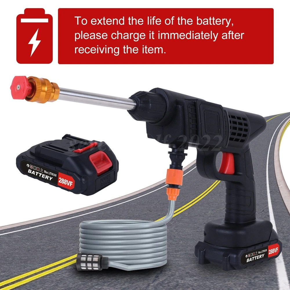 Cordless Electric High Pressure Water Spray Gun Portable Car Washer Cleaner Tool Description: With this cordless electric car pressure washer, you can clean furniture, cars, gardens, stairs and pool dirt in minutes. Made of high-quality materials, the electric pressure washer can help you wash off those hard to clean surfaces and dirt. With a cordless design that gets rid of cords for a better look, you don't need to worry about getting tangled in cords or relying on your garden hose for water. Freeing you from the inconvenience of a corded pressure washer. It can be used not only for cleaning cars, bikes, motorcycles, etc., but also for cleaning balconies, windows, decks, exterior walls, floors, fences, gardens, etc. Specification: Type: Water Pressure Washer Color: Black Power Source: Battery Battery voltage: 288VF Peak power: 450w Rated pressure: 26bar Battery capacity: 1200mah Per 1 Battery Water pressure: 26bar Water hose length: 5m/196.85inches Shooting range: 4-6m/157.48-236.22inches Number of batteries: 2 Material: ABS Plastic Feature: -Powerful motor: This cordless car high-pressure washer is equipped with a pure copper motor. Unlike the traditional motor, the all-copper motor drives the commercial structure pump, substantially increasing the water pressure by 86%, ensuring that the machine is more efficient, stable and durable. -Different water spray modes: Different spray patterns can be selected. High-pressure direct spray mode for powerful cleaning of hard-to-remove dirt; fan spray mode expands the rinsing area. You can choose according to your needs. -Portable cordless design: The battery-powered pressure washer features a cordless design that gets rid of cords for a better looking. Assembly takes only a few minutes and the high capacity battery provides removable power for outdoor applications. The self-priming feature allows water to be drawn from taps, rivers and buckets. -Easy to assemble: The portable handheld pressure washer is easy to assemble and it takes only a few minutes to finish. A carrying box is included. You can put it into the plastic carrying box which is easier and more convenient for you to carry. -Multiple application: It is lightweight and portable. Suitable to be used not only for cleaning cars, bikes, motorcycles, etc., but also for cleaning balconies, windows, decks, exterior walls, floors, fences, gardens, etc., or the places that are difficult to clean manually. Package Contents: 1*Host 2*Batteries 1*Inlet Hose 1*Foam Kettle 1*Charger 1*Extension Rod 1*0°Outlet Nozzle 1*40°Outlet Nozzle 1*Inlet Filter 1*Coke Bottle Interface 1*Instruction 1*Tool Box Note: 1. Please allow minor differs due to manual measurement. 2. The picture may be a little different from that of real item due to the different display and different light. 3. Due to different producing batches, product details might be a little different. If you mind the difference, please buy with caution. Thank you for your understanding. 4. If you have any questions about the product, please contact us. On May 19, 2025 at 08:06:35 PDT, seller added the following information:
