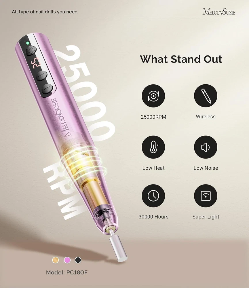 PC180F Cordless & Recharge: Cordless design, compact and lightweight, only 0.15 lbs, easy to use and carry.Fully charges in just 1 hour and can be used for up to 6 hours. Let your nail art is not limited to any place and time.5V/2A charger is recommended, higher power chargers will shorten the battery life. 25 Adjustable Speeds, Reversible Direction: Features 25 adjustable speeds 6000-25,000rpm, pause function and F/R direction function for right or left handed use. Suitable for professionals and beginners, cut your time in half. LED Digital Display & Easy to Use: Intelligent LED digital display, can display the working status, speed, direction and power status, the operation is more simple to use more convenient. Enjoy salon quality professional nail drill set at home. New Technology for More Comfort: Made of powerful and quiet new motor with intelligent heat dissipation function, the machine keeps low heat, low noise and low vibration while in use, bringing more comfortable using experience. Multi-functional Manicure and Pedicure: Comes with 25,000RPM powerful rotary motor and 11 kinds of 3/32” mental nail drill bits, this electric nail file can be used for all-around shaping, buffing, grinding, polishing, removing for acrylic nails, poly gel nails, artificial extension nails, thick nails, builder gel, dip powder, fake nails, natural nails, and cuticle dead skin. Product Description 1 Rechargeable 2 Carbon Brush Motor 3 Bits 4 Bits