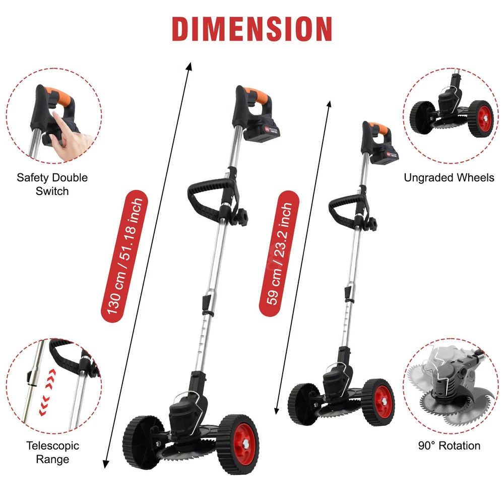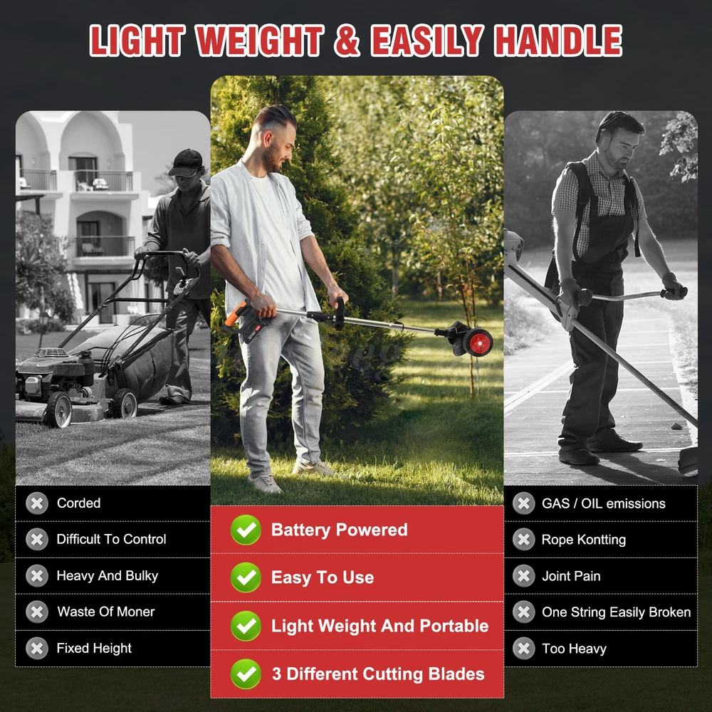 s Description: Our new cordless weeder incorporates cutting-edge technology for an unparalleled pruning experience. The large capacity battery gives it lasting power, coupled with high-speed motor, no-load speed up to 18,000 RPM, easy to meet various pruning challenges. The telescopic rod design is flexible and can be up to 50 inches in length to meet the needs of users of different heights and make trimming more comfortable. The rotating baffle effectively prevents the spray of weeds and ensures a clean and orderly pruning process. This mower is equipped with three blade types, grass rope, flat blade, manganese steel circular saw blade, easily respond to different lawn and plant pruning needs. Whether it is a small garden or a villa lawn, this cordless weeder can easily perform. Choose a new cordless lawn mower to refresh your lawn and open a new chapter in green life! Specification: Type: Lawn Mower Material :ABS + metal Color: Red + black Battery: Lithium battery, 24V, 2000mAh(inclusive) Power: 650W Speed :18000 RPM Blade diameter :150mm Straight side diameter :146 mm Each run time is 45 minutes, and two batteries are 90 minutes Charging time: about 120 minutes Features: -💪 【Strong power, long-lasting battery life】 This new cordless weeder is equipped with a large-capacity battery, which makes your cutting work more powerful and longer-lasting. Professional-grade power motors and drives, with no-load speeds up to 18,000RPM, can easily cope with a variety of lawn mowing needs, so that your lawn will always be clean and beautiful. The telescopic stem of this weeder is longer than that of the Weed Wacker in the general market, and the entire length can reach 50 inches after stretching, so even tall people can easily use it, no need to bend over, and enjoy a more comfortable mowing experience. -💪 【Rotate the baffle to prevent splashing】 During the pruning process, weed splashing is a problem that many people will encounter. This weed mower is equipped with a swivel baffle design that effectively prevents weeds from splashing and makes your mowing work more tidy. At the same time, the machine head can also be adjusted freely from 0 to 90°to ensure that it can adapt to the most complex working environment, making your pruning work more convenient. -💪 【Three kinds of blades, to meet different needs】 In order to meet the pruning needs of different users, we provide three types of metal blades: weeding rope is suitable for mowing soft grass; Flat blades are suitable for pruning fine branches, weeds, and small shrubs; Manganese circular saw blades are suitable for pruning thicker shrub branches. With a simple blade change, you can handle a variety of pruning needs and keep your garden neat and organized. -💪 【Applicable to multiple occasions】 This cordless weeder is not only powerful, but also easy to operate. It is suitable for small gardens, villas, and other scenes, making your pruning work more convenient and quick. With the time saved, you can enjoy the beautiful garden time with your family and feel the beauty of life. Package Contents: 1* Lawn mower 2* Saw blades 5* White plastic blades 4* Metal blades 1* Handle 2* Batteries 2* Wheels 1* US charger 1* Goggles 1* User manual Note: 1. Please allow slight differences due to manual measurement. 2. Due to different monitors and lighting, the picture may slightly differ from the actual product. 3. Product details may vary due to different production batches. If you mind the difference, please purchase with caution. Thank you for your understanding. 4. If you have any questions about the product, please contact us. On Jul 18, 2025 at 06:06:27 PDT, seller added the following information: