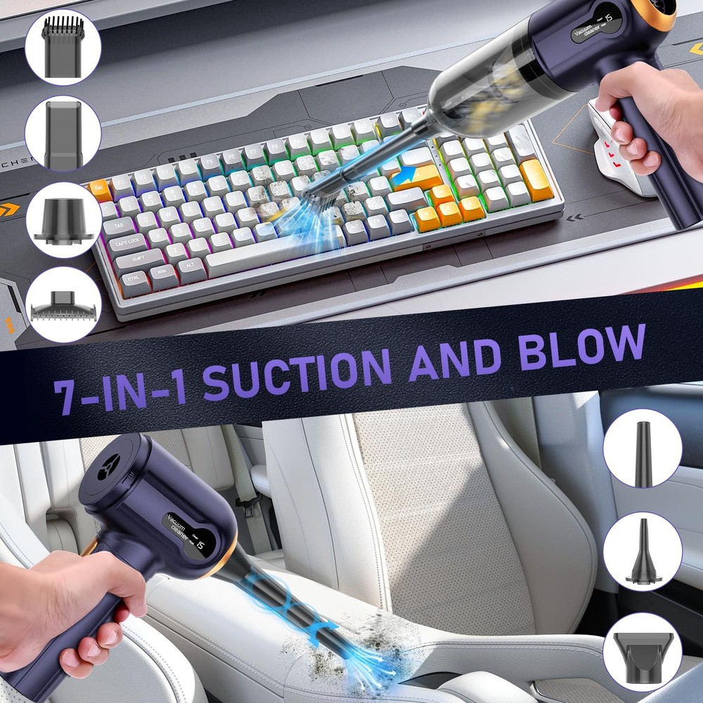 Handheld Car Vacum Cleaner 💜【Multifunctional Vacuum & 4 Modes】The car vacuum cleaner high power is used with 7 accessories to get 4 modes for different scenarios of use: regular vacuum mode, regular blowing mode, pet cleaning mode, and inflation mode, which can deal with all kinds of cleaning and multi-scenario use needs easily. Equipped with LED light can allow you to clean normally in a dim environment without light limitation. Please note: Batteries are not sold separately 💜【15000PA Suction & Blowing Power】The 120W powerful motor provides 3 adjustable suction and blowing power, you can adjust the mini car vacuum cleaner gears according to your cleaning needs. 1-Gear 11KPA, which is suitable for daily cleaning work. 2-Gear 13KPA, can meet the requirements of efficient cleaning. 3-Gear 15KPA, suitable for comprehensive deep cleaning use 💜【7 Multi-Purpose Accessories】Multi accessories for all of your needs. Long nozzle, brush and long nozzle make it easy to clean all kinds of dust and garbage. Hair dryer nozzle provides powerful airflow to quickly dry damp clothes or hair. Suction nozzles can suction and inflate organizers to make organizing easier. Pet care brush can suck away hair while brushing your pet. Inflatable nozzles can inflate balloons, swimming rings and so on 💜【Digital Display & Fast Charging】The handheld vacuum cordless cleaner is equipped with a digital display, you can clearly see the current number of gears used and the suction power level, which can help you better control the cleaning progress. 4000mAh large capacity battery can be fully charged in only 2.5 hours, and it can be a run for 20-30min under full charge 💜【Cordless & Lightweight】The cordless design of portable vacuum for car cleaner allows you to get rid of tether and have the freedom to clean anywhere in your home and car. Our vacuum cleaner is compact, only 0.66LB, doesn't take up much space, allowing you to store it easily when not in use. Note: Please do not use the suction nozzle and inflatable nozzle for cleaning work to avoid dust entering the motor and causing damage to the vacuum cleaner 💜【High-Efficiency Washable HEPA Filter】The car vacuum portable cordless cleaner comes with a HEPA filter that is washable and reusable and is able to effectively filter out 98% of the microscopic dust. The large-capacity visible dust cup makes you don't need to clean it frequently, and it is easy to disassemble and simpler to clean. Note: The machine body is not washable 💜NOTE: Please check that the filter is installed correctly before use. Leave it for a period of time after use and charge it after the body cools down. When it is not used for a long time, charge it regularly with a 5V-2A adapter to prevent self-discharge and over-discharge of the battery