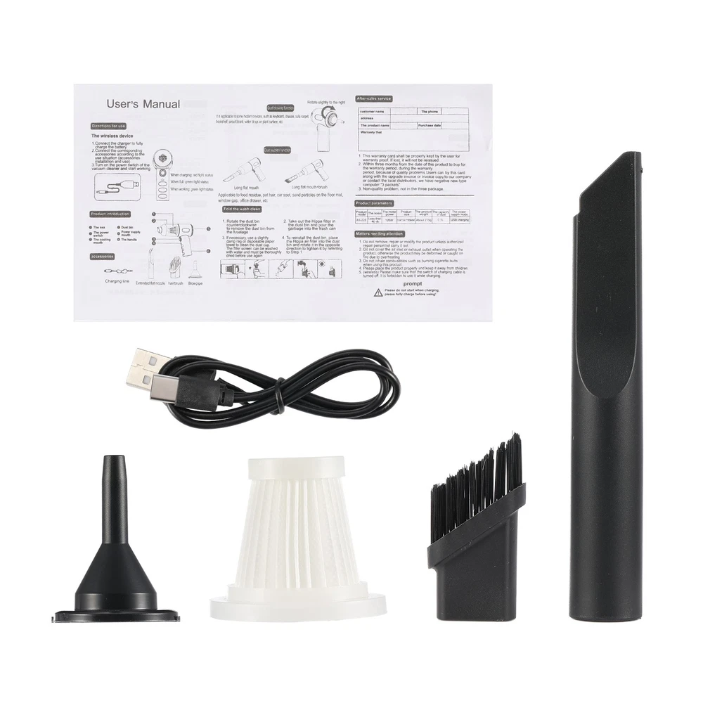 Specifications: Size: 30x8.5x5.5cm Color: White&Black Material: Plastic + Electronic components Weight: 430g Input voltage: 12V Power: 120W Product Name: Car Vacuum Cleaner Use range: Car and Home use Noise: Below 50 Decibels Use scenario: Wet and Dry Type: Handheld Features: CORDLESS DESIGN: This hand vacuum cleaner is cord-free and hassle-free which can free your movement for cleaning your stairs, kitchen, car or hard-to-reach corners. The handheld vacuum cleaner is also lightweight and portable for home and car cleaning. IMPROVED HEPA FILTER: Our hand vacuum cleaner features enhanced HEPA filters with premium filter wrap which is designed to further extend the lifetime and effectively avoid clog of filters while ensuring suction in perfect condition. QUICK CHARGE: Adopted the latest fast charge technology and the latest generation of rechargeable batteries, this small vacuum can be full charged in 2hours and run for about 30 minutes. HIGH POWER SUCTION: This upgraded car vacuum cleaner has a much stronger suction power. With a 120 watt motor and a strong suction power of 5500 Pa, it can effectively suck up pet hair, food residue, and grit. Packing List: 1 x Vacuum Cleaner