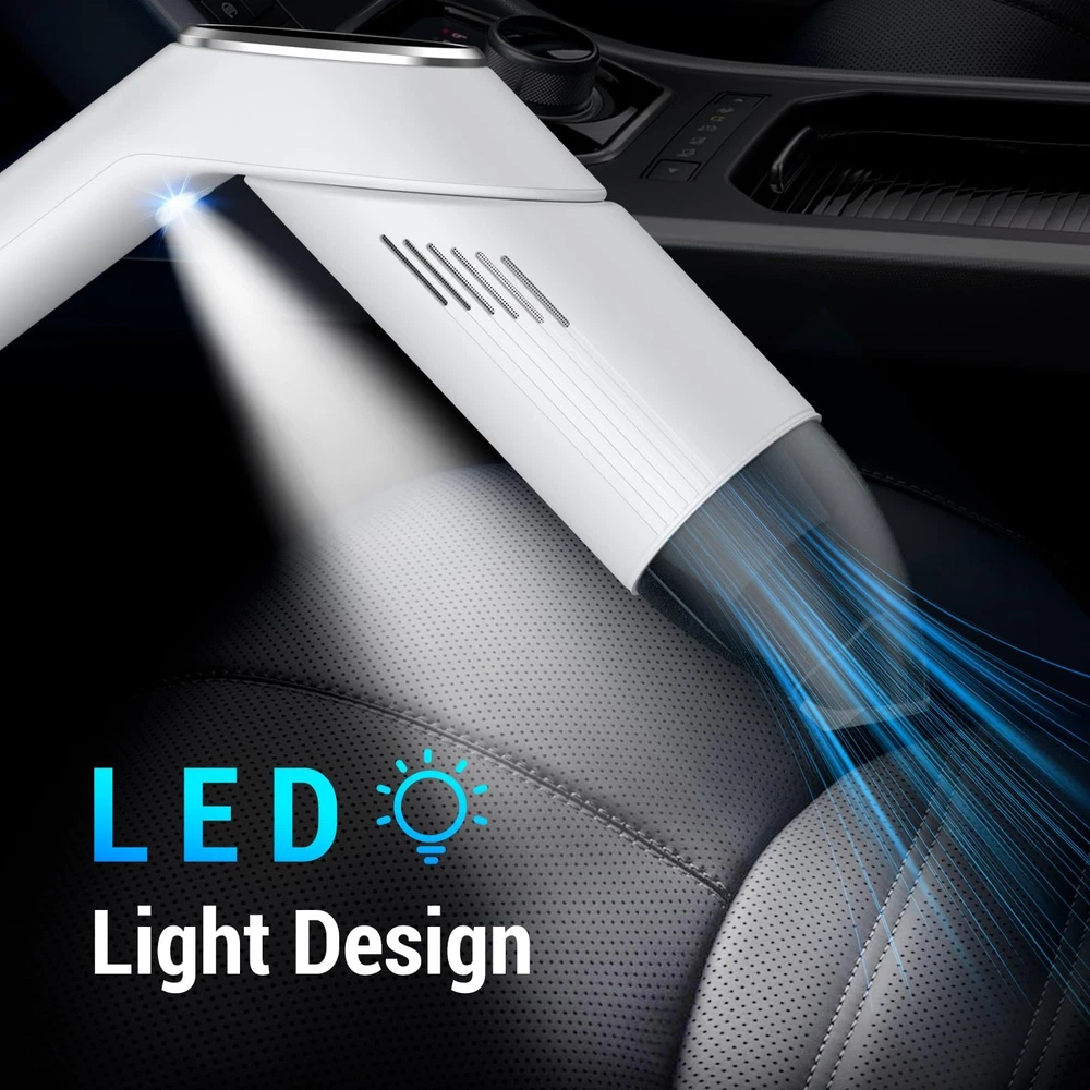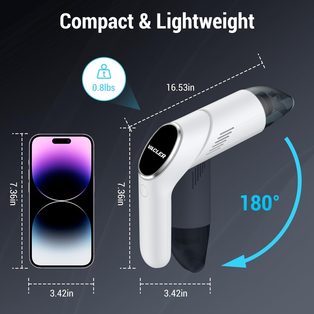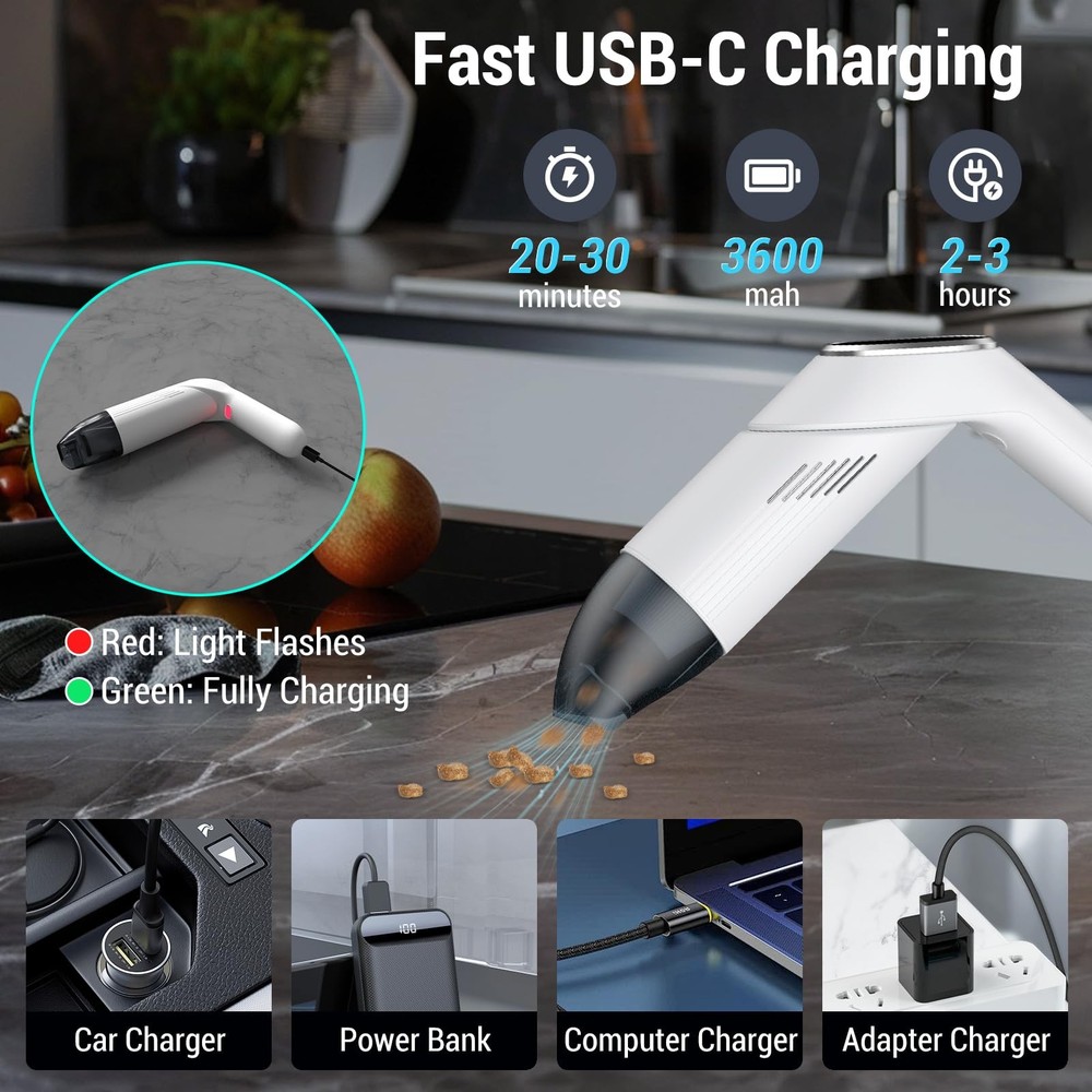 Handheld Vacuum Cordless Cleaner 【12KPa Powerful Suction & Dual Modes】Lightweight cordless handheld vacuum cleaner designed for pet hair and car debris! Equipped with a 120W high-speed motor, this cordless vacuum delivers 12KPa max suction power to remove stubborn dust, crumbs, and pet hair from sofas, carpets, and car seats. switch between standard and max modes for flexible cleaning 【Lightweight & Ergonomic Design】car mini vacuum cleaner Weighs only 0.8lbs (lighter than a water bottle!) with an anti-slip handle for one-handed cleaning. Perfect for reaching tight corners, keyboards, curtains, and car interiors effortlessly – no more bulky vacuums! Convenience making it ideal for quick on-the-go cleaning in your car and home 【30-Min Runtime & USB-C Fast Charging】 : Features USB-C fast charging (full charge in 2 hours) and up to 30 minutes of runtime (standard mode) – enough to clean 3-5 cars! Portable and cordless for cleaning anytime, anywhere. 【180° Rotatable Nozzle & Large Dustbin】The small handheld vacuum cleaner 180° rotating head easily reaches under furniture and car seats, while the 120ml dustbin reduces emptying frequency. Washable filters ensure hassle-free maintenance 【2-in-1 Nozzles + HEPA Filtration*2】mini vac comes with a crevice nozzle (for narrow gaps) and soft brush nozzle (for delicate surfaces). The washable HEPA filter traps 99% of dust and allergens, perfect for pet owners