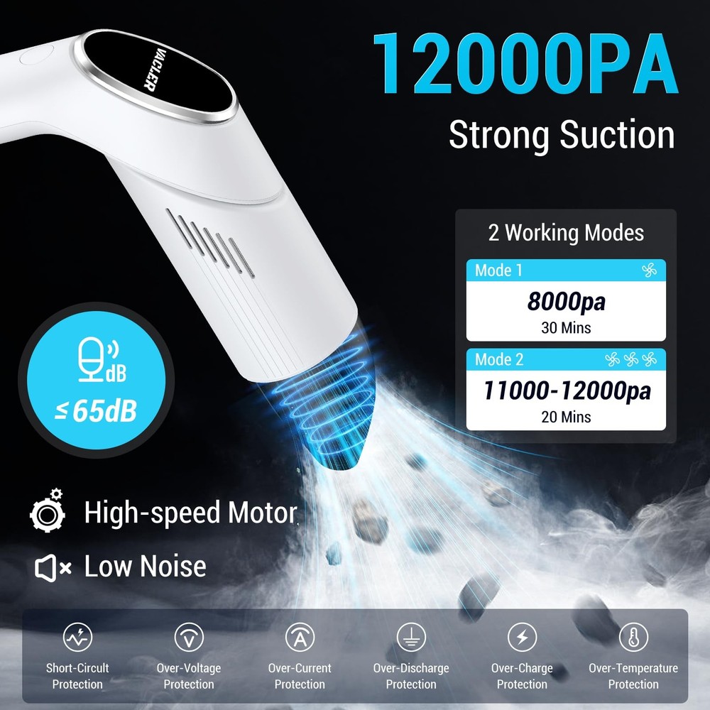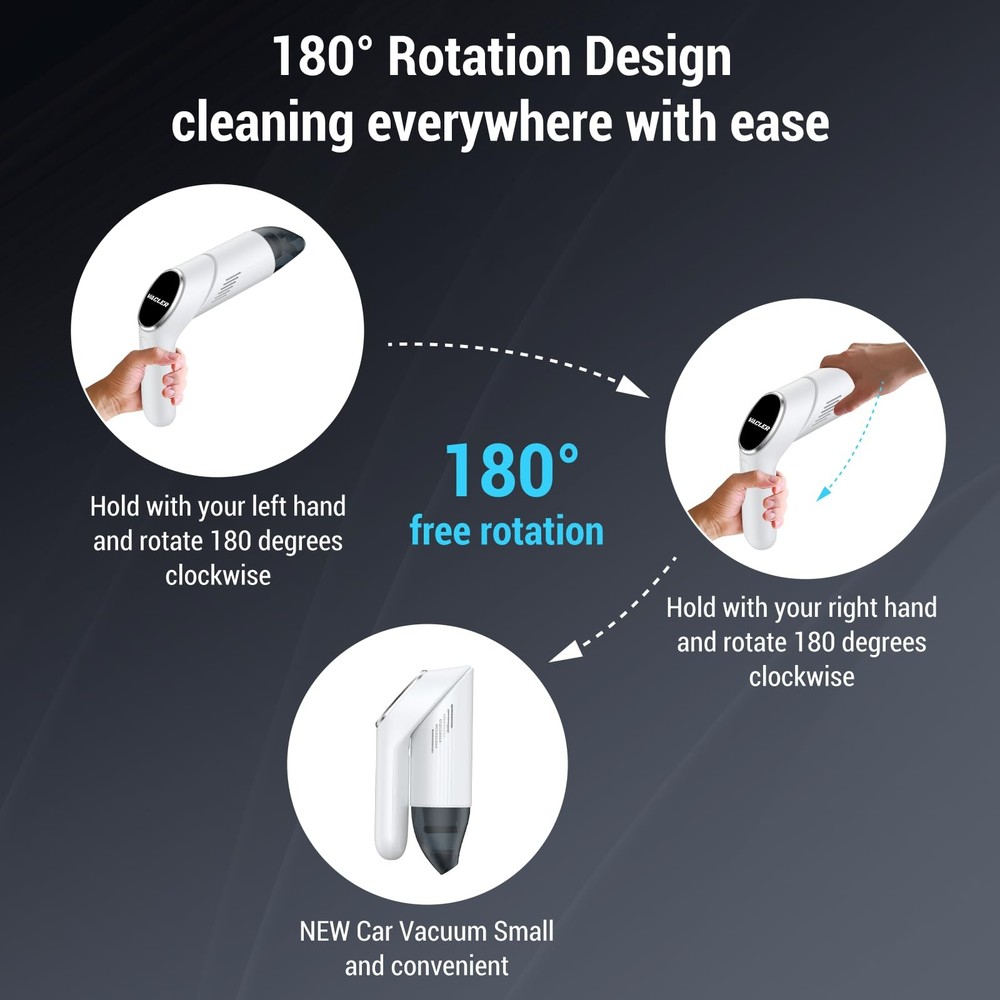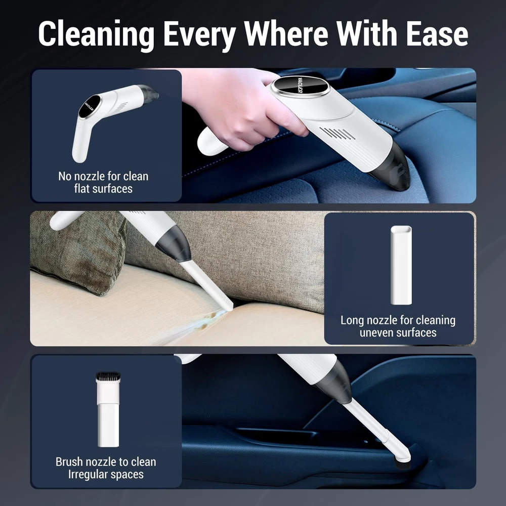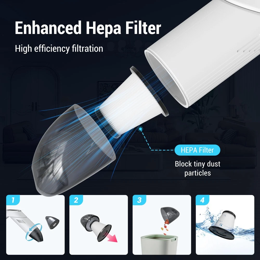 Handheld Vacuum Cordless Cleaner 【12KPa Powerful Suction & Dual Modes】Lightweight cordless handheld vacuum cleaner designed for pet hair and car debris! Equipped with a 120W high-speed motor, this cordless vacuum delivers 12KPa max suction power to remove stubborn dust, crumbs, and pet hair from sofas, carpets, and car seats. switch between standard and max modes for flexible cleaning 【Lightweight & Ergonomic Design】car mini vacuum cleaner Weighs only 0.8lbs (lighter than a water bottle!) with an anti-slip handle for one-handed cleaning. Perfect for reaching tight corners, keyboards, curtains, and car interiors effortlessly – no more bulky vacuums! Convenience making it ideal for quick on-the-go cleaning in your car and home 【30-Min Runtime & USB-C Fast Charging】 : Features USB-C fast charging (full charge in 2 hours) and up to 30 minutes of runtime (standard mode) – enough to clean 3-5 cars! Portable and cordless for cleaning anytime, anywhere. 【180° Rotatable Nozzle & Large Dustbin】The small handheld vacuum cleaner 180° rotating head easily reaches under furniture and car seats, while the 120ml dustbin reduces emptying frequency. Washable filters ensure hassle-free maintenance 【2-in-1 Nozzles + HEPA Filtration*2】mini vac comes with a crevice nozzle (for narrow gaps) and soft brush nozzle (for delicate surfaces). The washable HEPA filter traps 99% of dust and allergens, perfect for pet owners