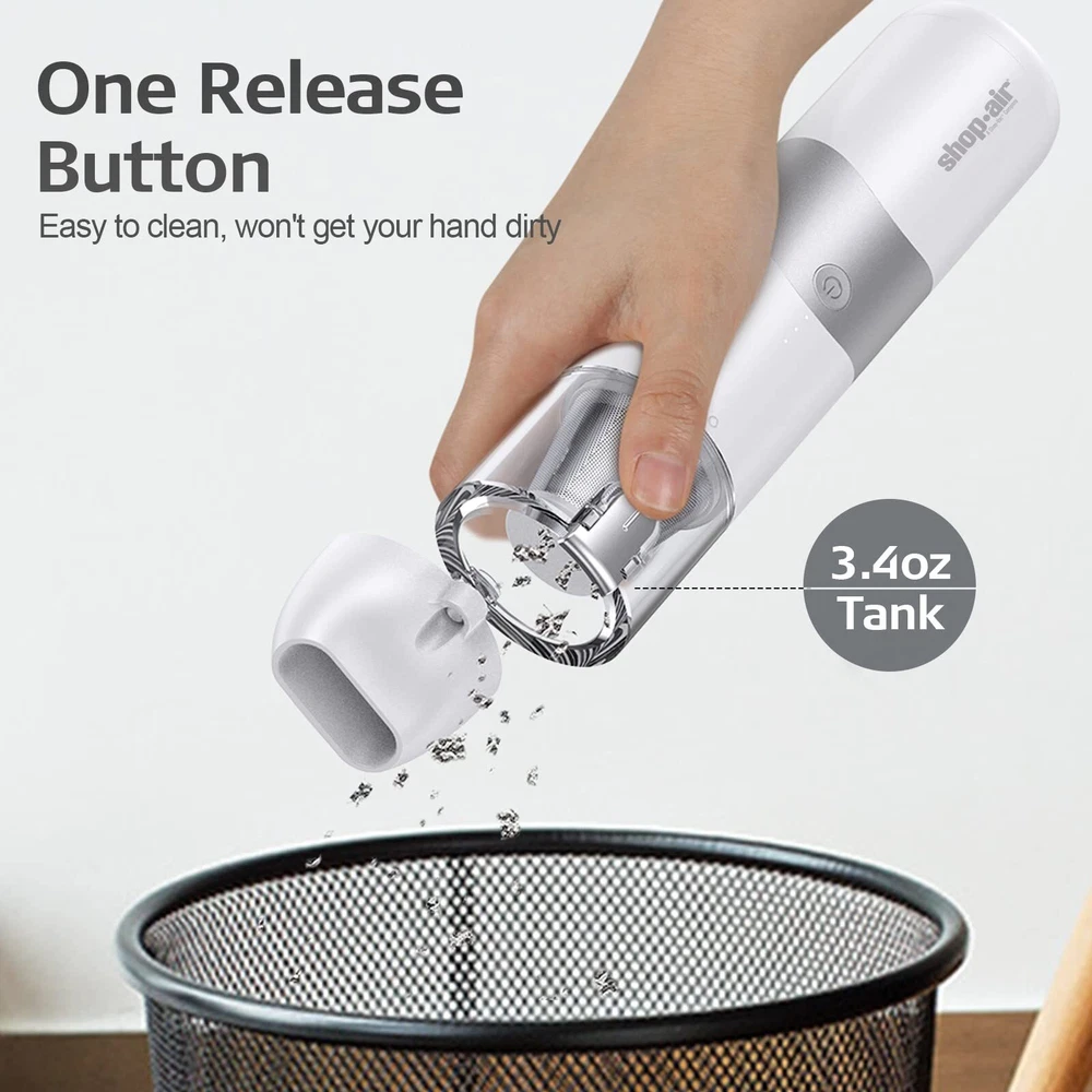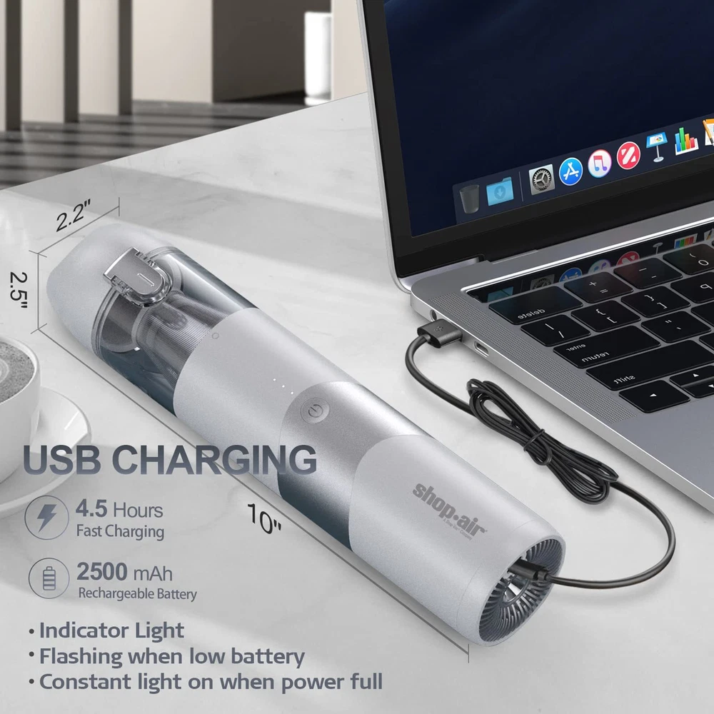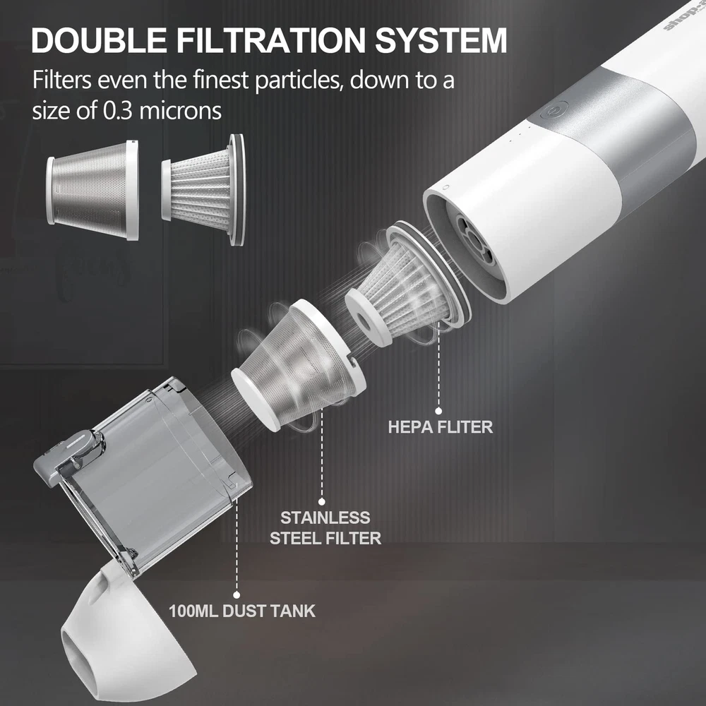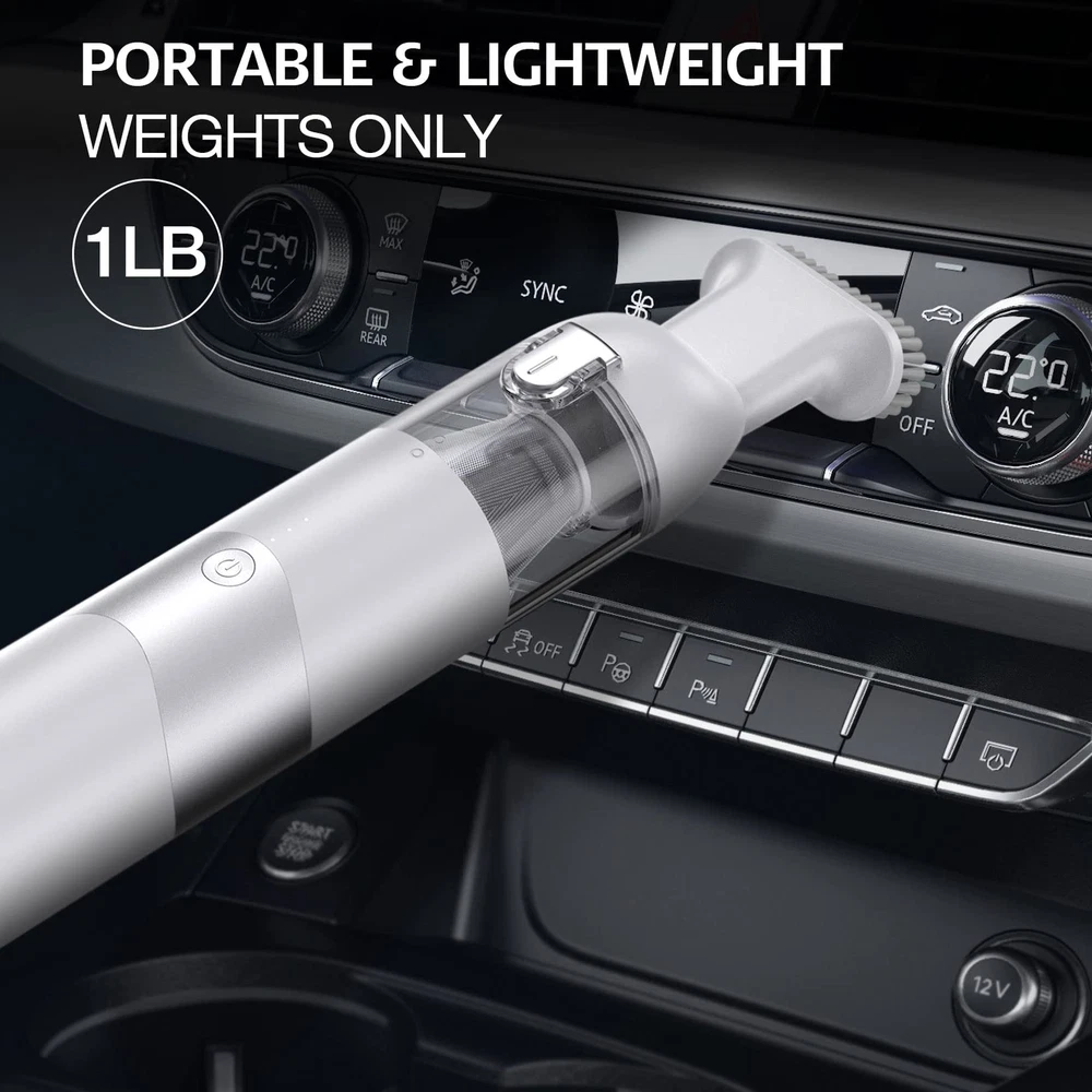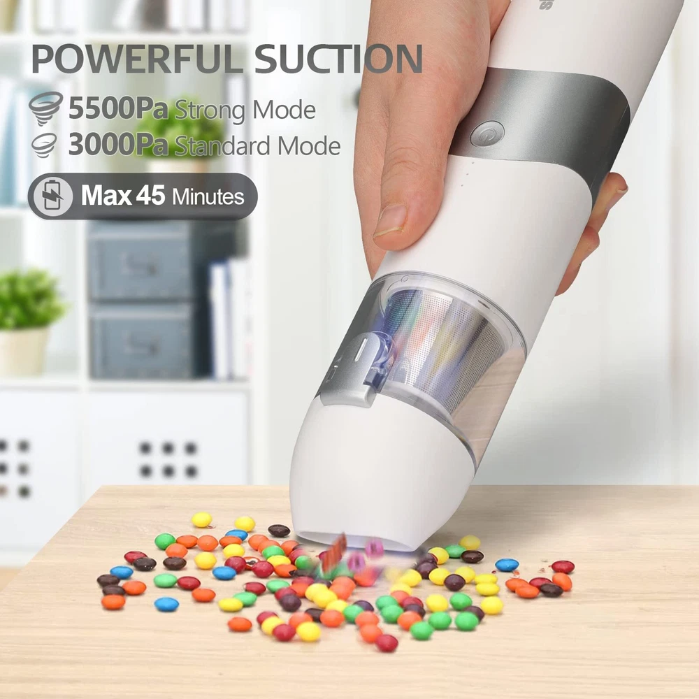 POWERFUL SUCTION:portable vacuum cleaner is equipped with an upgraded 65W motor for stronger suction. The vacuum cleaner is equipped with a 44000r/min motor and provides suction of 5500Pa, good for cleaning dust, paper, particles. PORTABLE VACUUM:cordless vacuum is compact in size (10"x2.5"x2.2") and weighs only 1.0 pounds, making it easy to carry around and use outdoors. Working noise can be lower than 80bB, suitable for car, home and other occasions. LASTING POWER & FAST CHARGING: Equipped with a 2,500mah lithium-ion battery and quick-charging technology, the handheld vacuum lasts for 45 minutes at low suction and 30 minutes at high suction after a full charge of 4.5 hours. USB charge. ONE-CLICK DUMPING ALL & WASHABLE FILTER: Hand-held vacuum cleaner has 100ml (3.4oz) dust collection tank. The button on the dust tank,one click to dump the garbage, more convenient to use. The dust tank and HEPA filter of the vacuum cleaner are both washable. Please put it back after completely drying to maintain excellent suction and effect. MULTIFUNCTIONAL ATTACHMENTS: cordless vacuum cleaner comes with a brush nozzle and a crevice nozzle that can easily clean messes around your home, car and office.