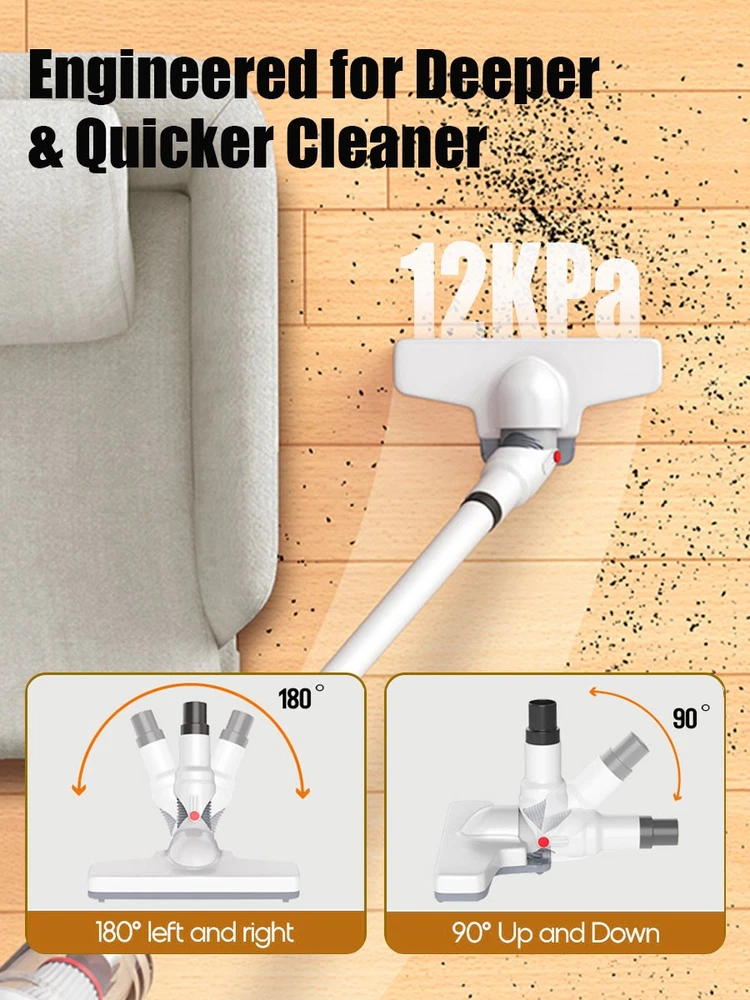 Wireless Vacuum Cleaner 12000Pa Suction Handheld Powerful Vacuum Cleaner Low Noise Multiple Accessories to Meet Your Needs Function : 1. A variety of accessories, suitable for a variety of vacuuming scenes 2. Simple and convenient installation 3. About 12000pa suction power, easy to suck away the dirt and dust. 4. Wireless vacuum cleaner 5. Low noise Specificati ons : Net weight: 1000g or 2.2lb Gross weight:1475g or 3.25lb Rated voltage:12V Vacuum degree: about 12000pa Rated speed: 35500rpm Battery capacity: 6000mAh Charging method: USB Rated power: 120W Noise: ≤70dB Operating temperature: -20℃~+50℃ Battery life: about 30 minutes Pack a ge list: 1 x Vacuum cleaner 2 x Connecting pipe 1 x Floor brush 1 x Brush 1 x Extension hose 1 x Lo-ng mouth 1 x Charging cable 1 x Manual Please Kindly N otice : 1.Please allow 1-3 cm difference due to manual measurement and 3-5 g for the difference between different colors. 2.Due the screen difference, the color may be a little difference from what you expect, please allow it. 3.Please leave 5-star feedback if you're satisfied with our products and service, we will appreciate it(Item as Described 5 stars, Communication 5 stars, Shipping time 5-stars). 4. If the products you received was damaged or wrong styles, please don't leave any negative feedback first, please contact messages, we will deal with it and work out the best solutions, your satisfaction is our motivation to do better. Wireless Vac uum Cl eaner Can handheld/Push rod seal Wireless aspiration-Release of interior space Wireless to flow is not blocked, strong aspiration skills easy clean household =========================================================================================== F eatures : [Vacuum + Cleaning 2-in-1 Design] Simultaneous Vacuuming and Cleaning: The floor brush features a micro-water seepage system, saving up to 70% of housework time. [Strong suction] 12kpa, bag less cleaner with cordless; The advanced Double Swirl filtration system can effectively remove the dust of the engine, maintain the suction of 12kPa, prolong the service life of the engine and thoroughly clean it at the same time.