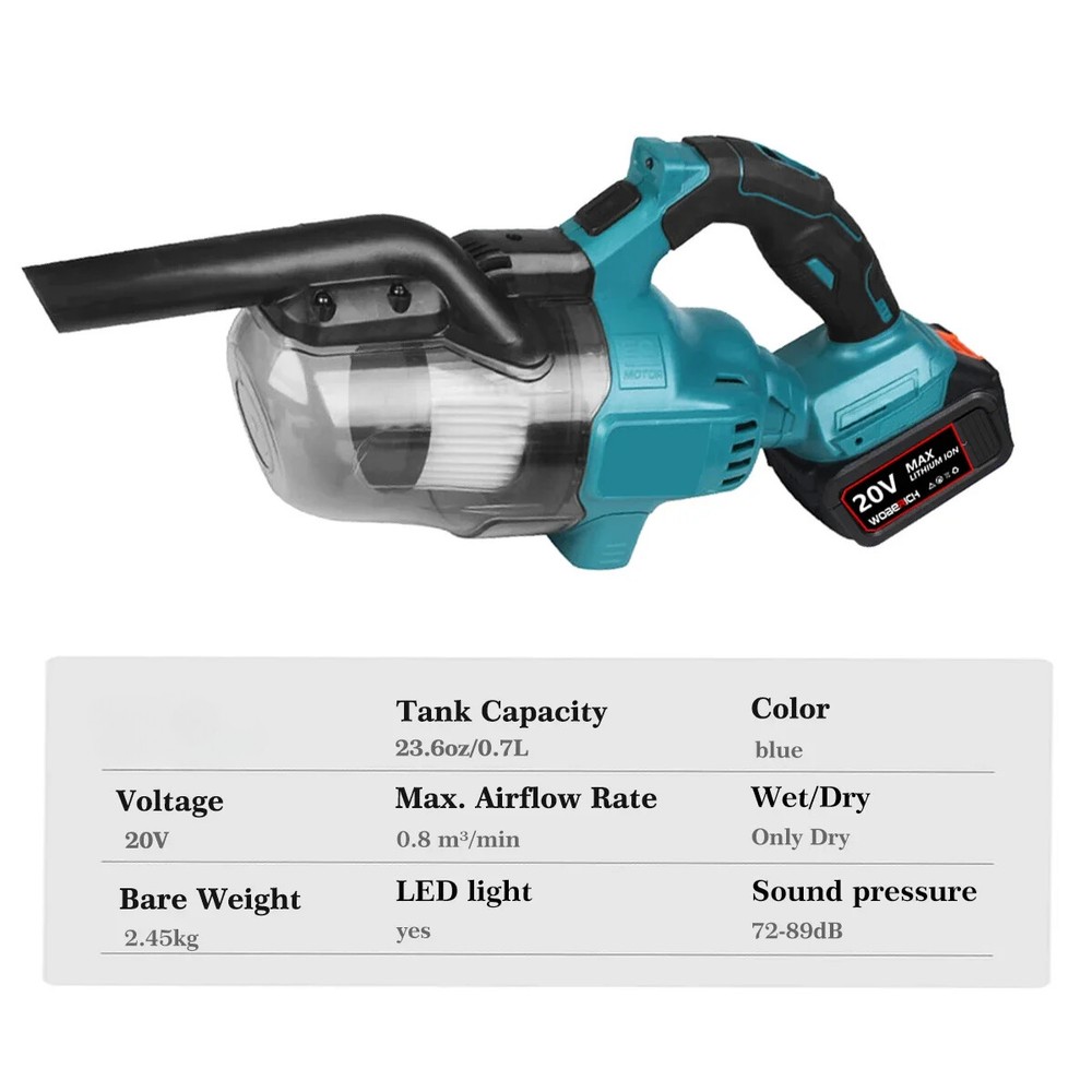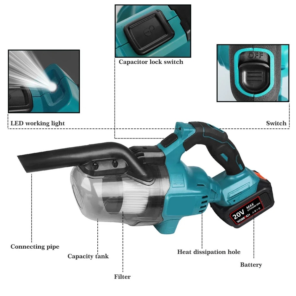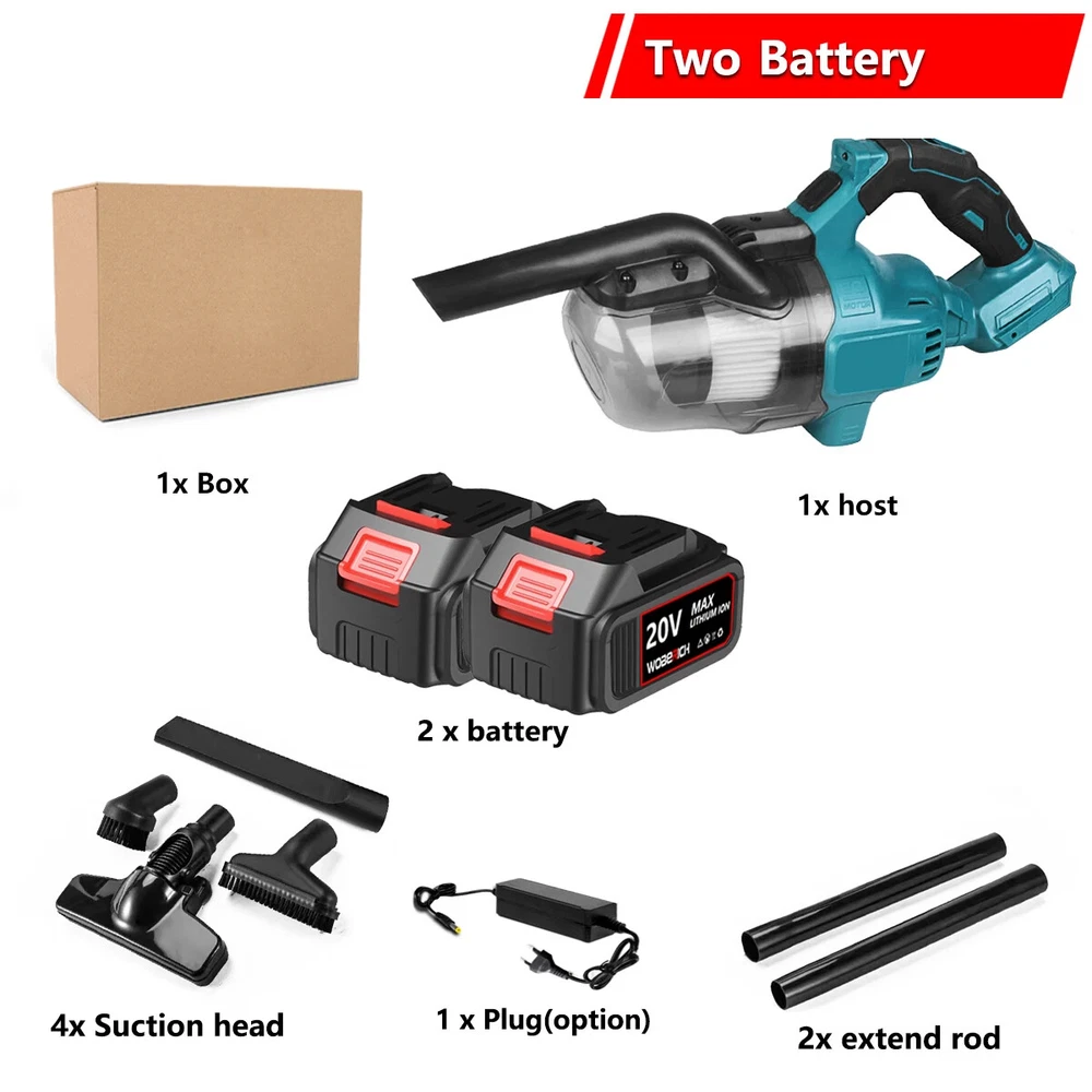 Please note: 1. Some options do not include batteries. please prepare the batteries by yourself. 2.In transit, the carton may be slightly broken or the product will have slight scratches, which is normal. Please do not place an order if you mind. 3.If there are any issues with the received product, please contact us as soon as possible, and we can help you solve the problem.Thank you Package Included:Please pay attention to the images of different options Specifications: Color: Blue Tank Capactity:23.6oz/0.7L Max.airflow rate:0.8m³/min Led Light:yes Bare weight:2.45kg Sound pressure:72-89dB Features: 1.High-horsepower copper core motor provides powerful suction 2.0.7L Tank Capacity allows for maximum debris pick up without the need for regular tank empties Replaceable/Washable Filters guarantees filter can be kept clean and working at full efficiency over longer periods of time 3.Cordless design, ergonomic design and pleasant handle, our vacuum cleaner gives you complete and comfortable mobility. 4.Cyclonic Action ensures debris is directed away from the filter ensuring maximum suction performance is maintained over longer periods of use 5.Easy Clean indoor indoor and outdoor. clean dust/hair waste from bedding, corners, car,bed bottoms, carpets, furniture, etc. Notice: 1.Please allow 1-2cm error due to manual measurement. 2.The colors may have different as the difference display,please understand.