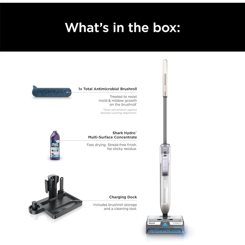About this item EFFICIENT CLEANING: Picks up debris, mops, and scrubs – all at once. Tackle both wet and dry everyday messes with ease. ON-DEMAND SPRAY: Spray as much or as little cleaning solution as needed with a targeted spray. DRY-ONLY CLEANING: Quickly capture dry messes, crumbs, and debris without having to wet your floors. CORDLESS CONVENIENCE: Lightweight. Quiet. No pre-sweeping. Faster than a vacuum and mop alone - Based on cleaning simulation in area of 300 sq. ft. DIRT-REVEAL TECHNOLOGY: Illuminates hidden debris and residue so you never miss a spot, for a more thorough and time-saving clean. STARTS CLEAN. STAYS CLEAN: Self-cleaning brushroll continuously clears itself of debris and grime as it rotates, so you never spread the mess. REDUCES ODORS: Hydro Multi-Surface Concentrate deep cleans and removes odors from hard floors. Fast drying. Streak-free. No sticky residue. MESS-FREE MAINTENANCE: Wet and dry debris is separated and trapped in the quick-empty tray that easily detaches and empties in seconds, for easy disposal. USE ON ALL SEALED HARD FLOORS: Designed for use on all sealed hard floors, including hardwood, laminate, tile, stone, marble, and vinyl. WHAT'S INCLUDED: 1x HydroDuo cordless hard floor cleaner, 1x 12oz. Hydro Multi-Surface Concentrate, 1x Charging dock with brushroll storage and cleaning tool, 1x Total Antimicrobial Brushroll. Treated to resist mold and mildew growth on the brushroll - Does not protect against disease-causing organisms. Brand: Color: Stone Metallic Item Weight: 5 Pounds Product Dimensions: 9. 5"D x 6. 5"W x 44. 5"H Style: HydroDuo with Dirt-Reveal Tech