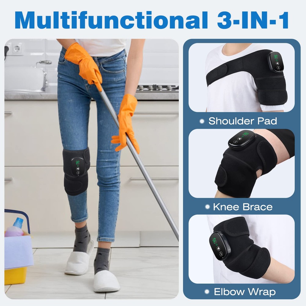 HEATING AND VIBRATION MASSAGE: The heated knee massager has 3 heating levels:113℉/122℉/140℉and 3 vibration modes, providing relax knee and injury recovery. The heating function can boosts circulation, further relieves cramps CORDLESS DESIGN: With built-in 5000mAh rechargeable battery, our knee heating pad allows you to wear it anywhere, instead of staying near the socket all the time. It's convenient to relieve discomfort when doing housework, resting, gardening, working KNEE/SHOULDER/ELBOW MASSAGER: 3 In 1 heated massager wrap pad is not only used for knees, but also for elbow and shoulder. Heated knee brace is equipped with extension straps, which means you can use it to heat your arms, thighs, knees, calves, ankles EASY OPERATION: Long press the button for 3 seconds to turn ON/OFF. Fix knee warmer at the knee/elbow/shoulder position. Choose the temperature or vibration function as needed. These two functios can be used alone or at the same time DELICATE CHOICE: Our knee massager is your choice for families, friends, teachers, beloved ones, and more. Show gratitude and care for people you love