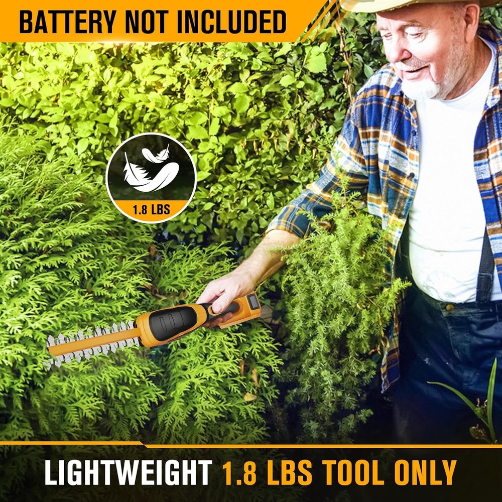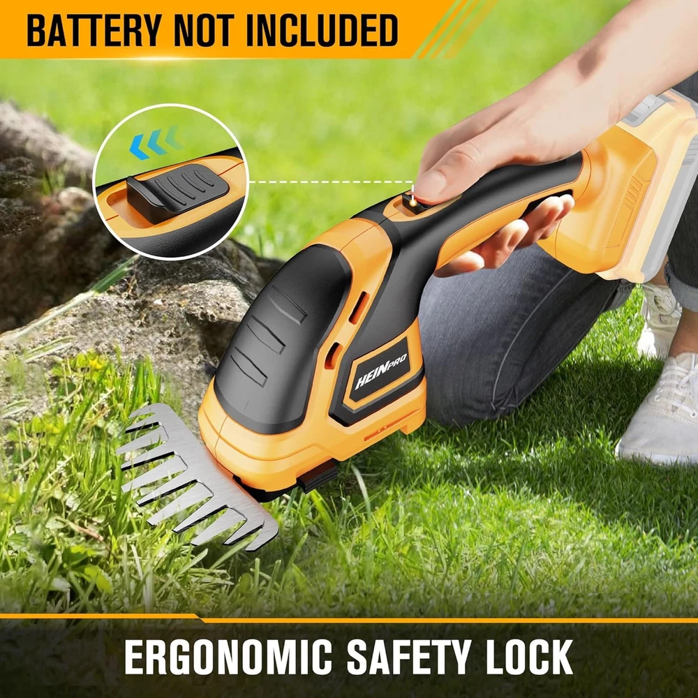 Hedge Trimmer Cordless Compatible with Yellow (With 2 Blades) Description Features: ⚠️NOTE: Battery and charger not included! Tool only! [Compatible with DeWalt Batteries] HEINPRO battery powered hedge trimmer compatible with DeWALT 20V MAX lithium-ion batteries, for DCB200 DCB201 DCB203 DCB204 DCB205 DCB206 DCB207 DCB208 DCB210 DCB230 DCB240, etc. Giving professionals who already own a DeWalt 20V battery the flexibility to use their preferred battery. [Specialized 2-in-1 Tool] HEINPRO mini hedge trimmer is configured with 3 blades, 2*Hedge trimmer blades and 1*Grass shear blade, making it easy and quick to switch from hedge trimmer to grass shear. The short blade (4.7 inches in width) is designed for cutting the grass, edge cutting in small lawns, and the long blade (8.7 inches in length) is designed for fine buds on hedges, trees, and ornamental shrubs. [Three major design upgrades] HEINPRO power hedge trimmers have upgraded copper wire motor to improve power and stability. Upgraded powder metallurgy gears are more durable, which are pre-coated with grease to reduce wear and tear and are not easily damaged. The long blade is upgraded with an aluminum bar to improve safety and stability. [Extra Long Run Time] HEINPRO small hedge trimmer cordless was tested using a DEWALT 20V 2.0Ah battery, the short blade can run up to 120 minutes without load, and the long blade can run up to 80 minutes without load. Product Details: Brand: HEINPRO Power Source: Battery Powered (Battery and Charger not Included) Color: Yellow (With 2 Hedge Trimmer Blades) Product Dimensions: 19.7"L x 2.95"W x 4.7"H Item Weight: 1.8 Pounds Blade Length: 8.7 Inches Material: Copper, Aluminum, Steel Blade Material: Copper, Aluminum, Steel Cutting Width: 4.7 Inches Item Weight: 1.8 pounds Manufacturer: HEINPRO Country of Origin: China Handling We will ship all orders within 1 business day of payment. Delivery We Do Not Ship Outside of the Continental US. Return Policy All items qualify for returns within 30 days of receipt. Buyer is responsible for return shipping on any item that is not damaged. Feedback We take our reputation seriously, we buy and sell online, so we understand the value of trust. If you are unsatisfied with your order, please contact us and we will work with you to resolve it to your satisfaction.