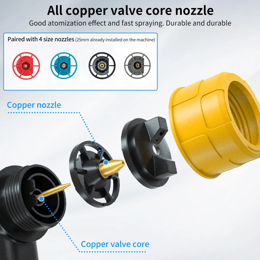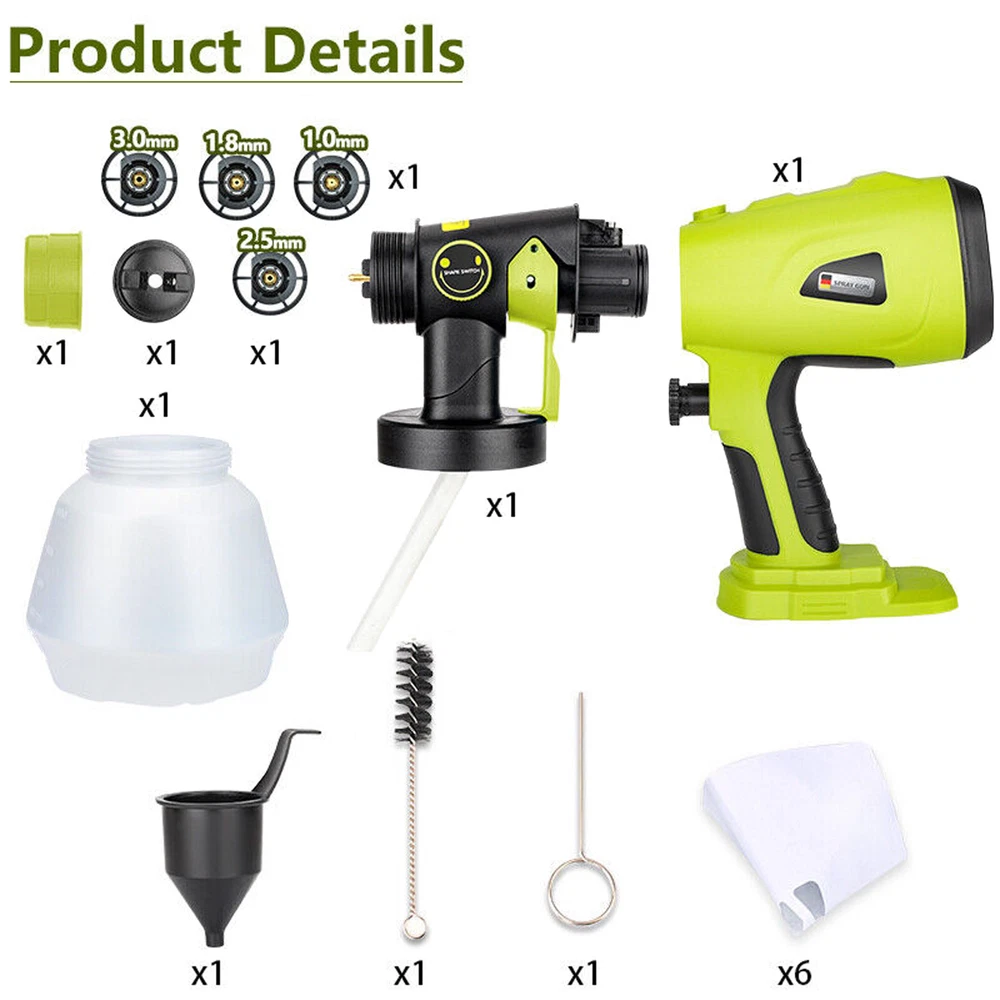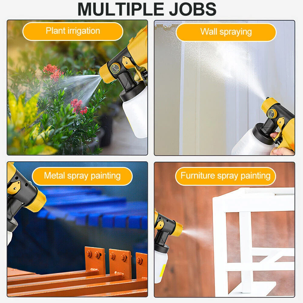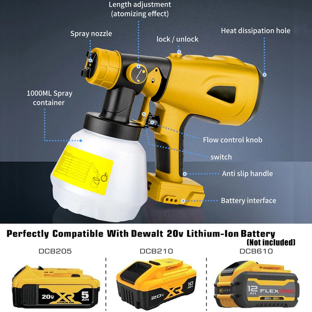 Features: Cordless Paint Sprayer By Battery: The cordless paint sprayer is Compatible with DEWALT 20V Battery DCB203 DCB204 DCB205 DCB206 DCBP034 DCB606 DCB609 etc (Battery NOT Included).Enjoy the convenience of outdoor operation without being limited by wires. 3 Spray patterns & 4 nozzle:360 ° rotation, precise control of spray painting area, and flexible rotation for multi angle spraying,There are three different spraying modes: horizontal, vertical, and circular spray patterns. The machine is equipped with four nozzle sizes (1.0mm, 1.8mm, and 3.0mm), which are placed in the box. The machine comes with a pre-installed 2.5mm nozzle. Wide Applications:Allows you to spray a variety of projects such as interiors and exteriors, crafts, walls, ceilings, furniture, fences, cabinets, floors, cabinets, home furniture. Adjustable Design:The spray width can be adjusted according to your heart, and rotating left and right can change the spray width,Rotable flow control valve to control atomized particles and flow size, saving costs. Powerful Motor:High power brushless motor, easy to spray latex paint, even and delicate for long-term use without burning the machine, handheld paint sprayer flow rate is 160L /min, control valve knob to adjust the thickness of the paint output to adjust the flow rate. Specification: Input voltage: 20V Output power: 200W Spray foot distance: 200-250mm Motor speed: 39000RPM/MIN Air flow rate: 160L/MIN Spray width: 200-300mm Note:Only Compatible with DEWALT 20V Max Battery(Battery not included) Package Included: 1*Cordless Paint Sprayer 4*Size Nozzles 1*Cleaning Brush 1*Viscosity cup 6*Paint Filter