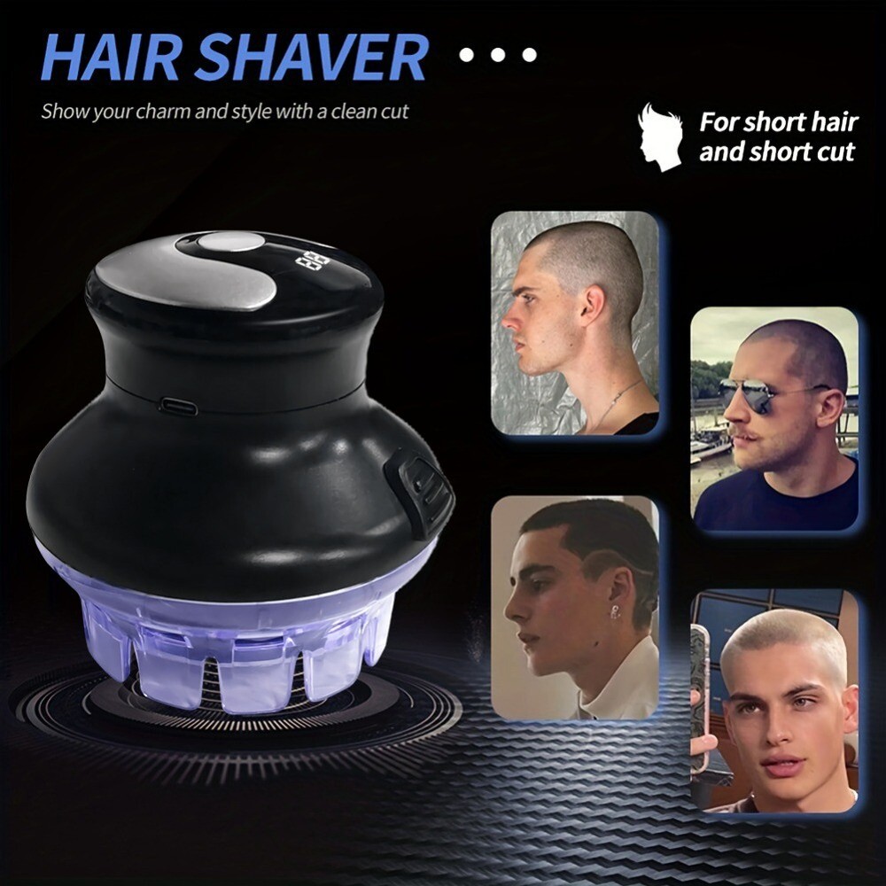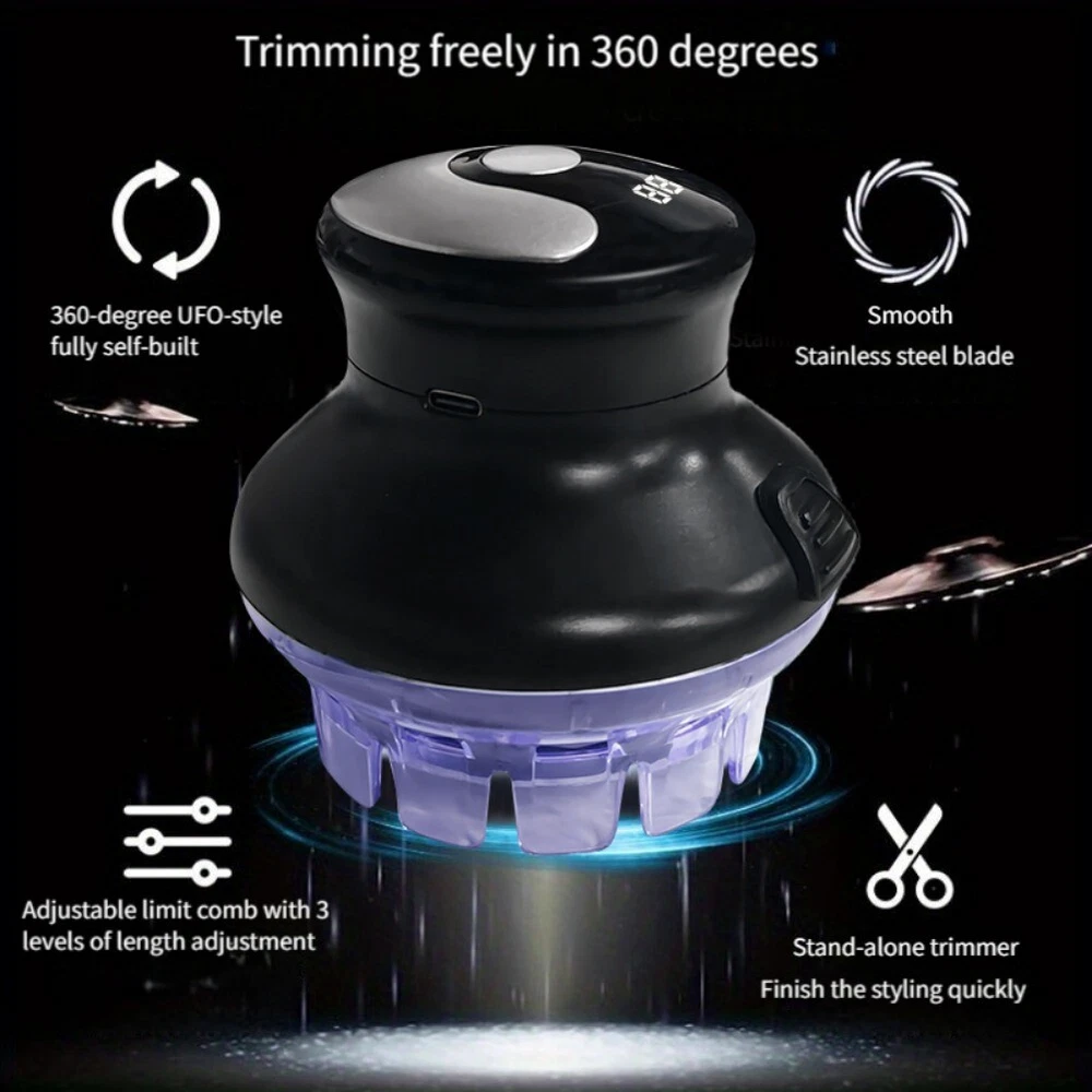 Product Description: Automatic Hair Trimmer 360 Rotating Hair Clipper LED Display Portable Shaved Head Artifact UFO Flying Saucer Cutter Head Feature: 1. Precision Cutting Technology: This electric hair trimmer features circular quick cut technology, allowing for smooth and efficient hair cutting, perfect for maintaining a stylish short haircut at home. 2. Water-Resistant Design: Built to withstand splashes and easy to clean, this water-resistant clipper ensures a hassle- grooming experience, making it ideal for use in the shower or sink. 3. USB Rechargeable Convenience: With a USB rechargeable battery, this hair clipper the convenience of cordless use, providing flexibility for home grooming without being tethered to an outlet. 4. User-Friendly LED Display: The integrated LED display keeps you informed about battery life and charging status, ensuring you never run out of power unexpectedly during your grooming routine. 5. Versatile for All Hair Types: Designed for bald men and short hairstyles alike, this hair clipper is suitable for a variety of hair types, making it a versatile addition to any grooming kit. Package Includes: 1x Hair Clipper for Men Circular Easy to Use Hair clippers are compact in size and modern in appearance, which makes them easy to use for home or beauty salon self-care. 360 Flying Saucer Blade ABS Material: The hair clipper is made of ABS material, which has high resistance, scratch resistance and shape stability, and can be used for a . USB charging Hair clippers can be charged worldwide with a USB charger and a Type-C charging interface, which makes charging at home or on the more convenient. Top About this item Questions Reviews