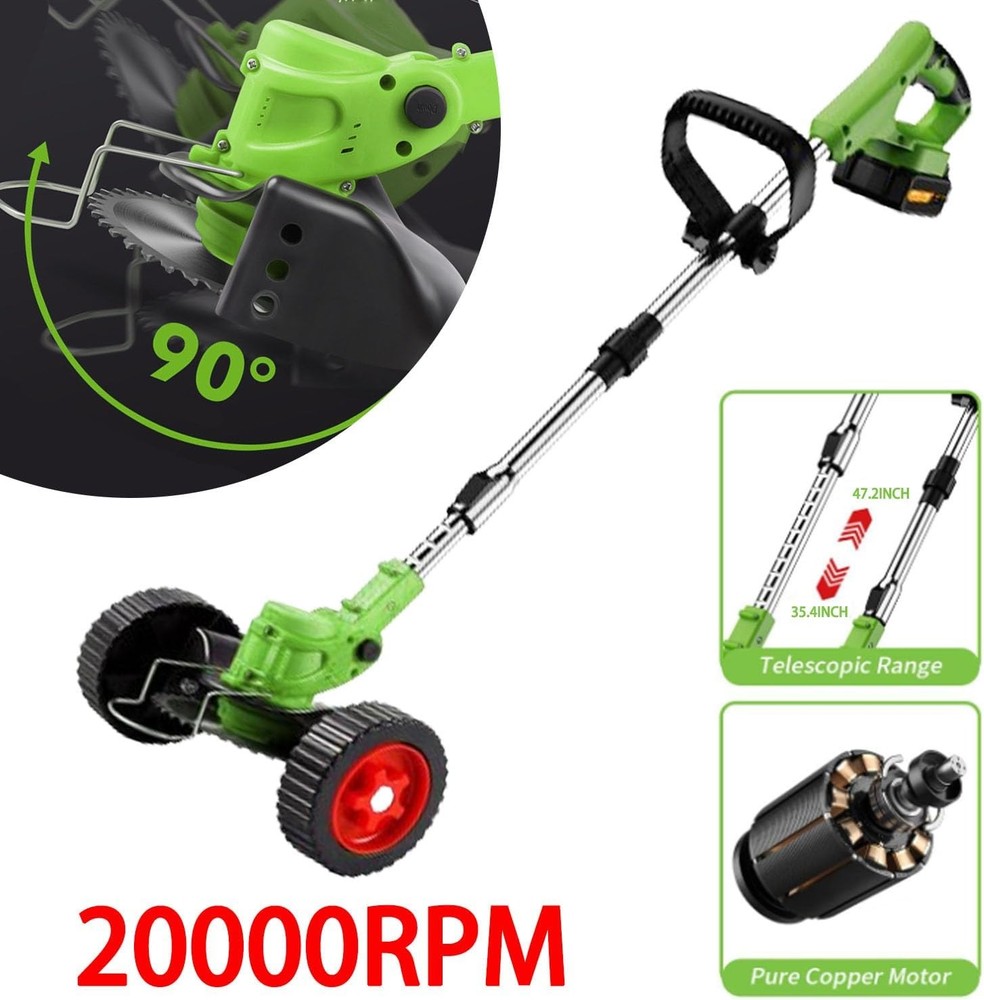 Product Description About this item ✂️【3 In 1 Garden Strimmer Cordless】3-In-1 Grass Strimmer/Edge Trimmer/Brush cutter, Features low noise, waterproof and easy to clean, very suitable for lawn trimming, weed removal, gardening pruning, etc. Grass Trimmers with 850W high power pure copper motor, 20000 rpm no-load speed, with a superior run-time to ensure smooth mowing, allowing you to complete the garden lawn weeding work easily. 🌳【Multi-Function Brush Cutter Blades】The strimmer cordless has three blades that can easily cope with various situations. ① The nylon blade acts like a heavy-duty rope and is ideal for soft grass; ② The metal blade is great for trimming weeds, reeds, etc.; ③ The manganese steel circular saw blade is used to cut small shrubs and branches. The garden strimmer plastic blade is suitable for trimming young grass. If your garden grass is thicker, you can simply use the metal blade. 🔩【Adjustable Height & Flexible Trimming】The cordless grass trimmers battery operated has an adjustable telescopic pole that can adjust the length from 33 to 47 inches. Provide the required length for all people without bending over. 90° Head Rotation, allowing you to care for every corner and cranny easily. It is an efficient and reliable grass cutter for keeping lawns, paths, and flower beds clean, as well as for mowing lush grass brushes for yards or gardens. 🌿【Lightweight Design】Cordless lawn mower with removable wheels. The weeding work can be achieved by pushing the grass trimmer after installing the wheels. It can save a lot of effort when using it to achieve the effect of easy weeding. With the wheels removed, adjust the angle of the grass trimmer head to easily cut corners and edge weeds. An ergonomic soft handle improves comfort and control. Ideal for trimming around yards and bushes. Low noise and vibration ideal for use in residential areas ⚙️【Safe & Comfortable Design】The electric lawn trimmer with double safety button design, you need to press the safety lock and trigger at the same time to start the battery strimmer, preventing accidental activation, especially by children. Anti-collision iron bars don't fear damage when they touch hard stones or walls. Its rotating baffle prevents water splashes during weeding. Gloves and glasses are also included to protect your hands and eyes. 🔋【Cordless Strimmer with Battery and Charger】 This Lawn Trimmer Weed Wacker is equipped with a 2 x 2000mAh lithium battery, which can be used Use about 90-150 minutes(charging time: 2-3 hours), effectively solving the problem of short battery life. Two batteries can be replaced, so you don't need to wait to charge when gardening. Please fully charge it before first use to get the expected working time. 📧【Warm Tip】Please fully charge the battery before using the strimmer for the first time to provide a better user experience. This product requires you to install the blades and other accessories yourself. Before starting the weed eater, tighten the nuts that hold the blades in place and install the entire machine correctly. 21V Cordless Strimmer Grass Trimmer with 20000 RPM and 850W Motor Garden Strimmer Cordless with 2 * 2.0Ah Batteries is the Perfect Partner for all Your Garden & Lawn Care Needs If you're overwhelmed by an overgrown garden, don't worry Our Cordless Lawn Trimmer Weed Wacker is designed for cutting private lawns and small areas of grass. It can also be used to trim the edges of lawns and flowerbeds helping you to solve the gardening labor easily! This cordless mower has many advantages over traditional mowers. First of all, it is cordless, making it easier for you to use, and you no longer have to worry about the cord not being long enough or out of reach. Secondly, it is equipped with 2*2.0Ah battery, which increases the working time by 20% compared with the traditional lawn mowers, saving your energy and effort. 21v Lawn Mower Grass Cutter Machine with a double safety button design, you need to press the safety lock and trigger at the same time to start the brush cutter, ensuring your safety. The angle of the machine head rotation 0-90° is freely adjustable at will to ensure that it can be suitable for most complex working environments. Ergonomically designed handle for long hours of work without feeling tired. This garden strimmer is versatile and can be used for gardening, park landscaping, mowing gardens, and lawn mowing Product attributes: Material: aluminum + plastic Color: black + green Voltage: 21V Battery capacity: 2000mah Speed: 20000 U/min Power: 850W Telescopic tube: 90cm/35.4 inches ~120cm/47.2 inches Circular blade diameter: 15 cm/5.9 inches Straight blade diameter: 14.6 cm/5.74 inches Power type: 2 lithium batteries No-load running time: 90-150 minutes Product List: 1 x Lawn mower 2 x Batteries 2 x Rectangular alloy saw blades 2 x Circular alloy saw blades 5 x Plastic saw blades 2 x Detachable wheels 1 x Baffle 1 x Wrench 1 x Charger 1 x User Manual