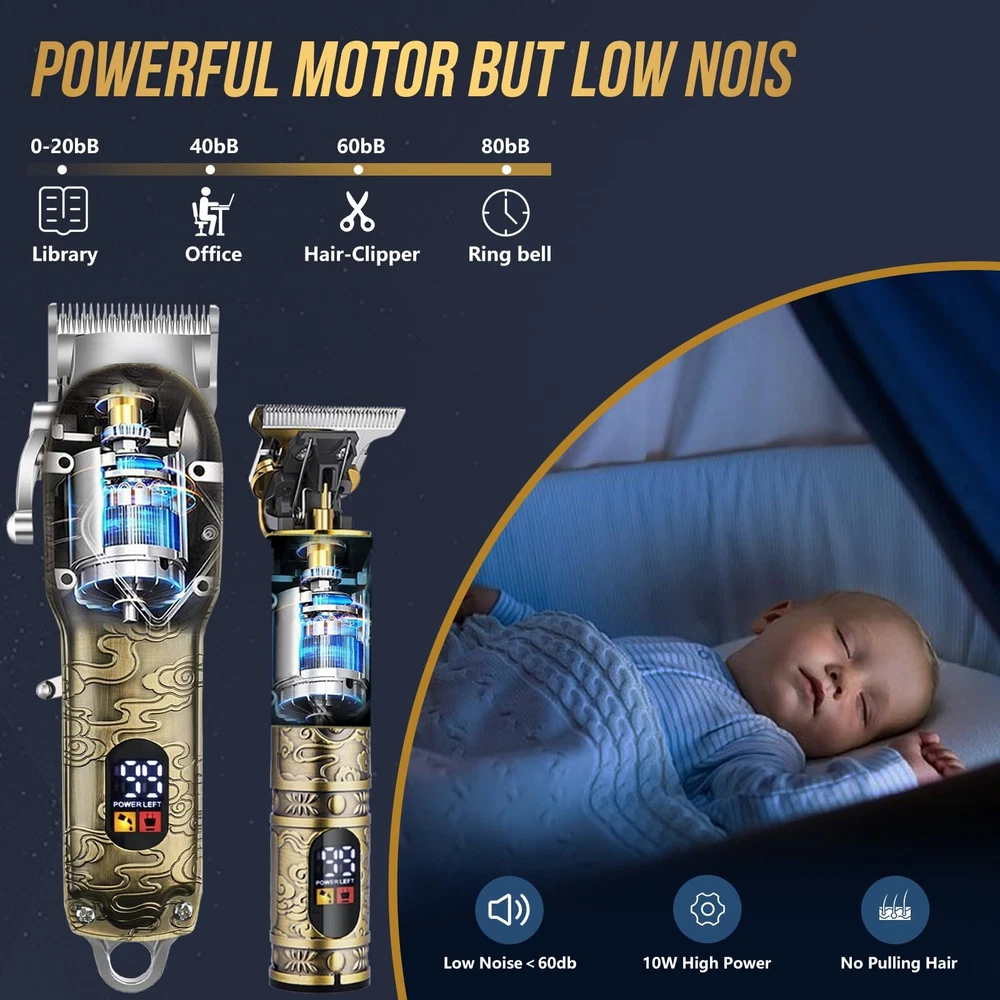 hairtrimmer Upgrade Hair Clippers Set: professional cordless hair clipper kit include Hair clippers, T-blade Hair trimmer, Foil shavers, Ear and Nose Hair Trimmer,barber's comb, 4 USB charging cables, 1 cleaning brush, 1 replacement head, 1 barber cape, as well as 11 guide combs of different lengths. Through adjustable taper rods and guide combs, you can precisely control the length of your hair and trim various hairstyles Large Capacity Battery Aad LCD Display: The LCD display clearly shows power left, oiling reminder, and charging reminder. Hair clippers charging 3 hours delivers over 180 minutes of nonstop run time, Hair trimmer charging 1.5 hours delivers over 90 minutes of nonstop run time, Foil shavers charge 1.5 hours to enjoy 60 minutes of trimming, nose hair trimmer charge 1.5 hour use time 150 minutes Versatile Aad Portable: Professional Clippers / Trimmer Set design for beard, face, hair, sideburns, ear, and even body hair. This hair cutting kit contains everything you need to have a professional cut right in the comfort of your own home. USB charging port, you can connect USB adapter, laptop, car charger, The noise is less than 60 DB during operation,which won't bother you and your family at all All Metal Body Design: the shells are all made of metal, which is sturdy with a new cool engraving, exquisite and comfortable grip, The non-slip knight pattern on the handle, Ergonomically designed for easy grip and helps alleviate wrist and arm fatigue. With one-button design,both beginner or professional barber can find it convenient to use The Best for Men: Exquisite and compact for comfortable grip.all-metal body, non-slip skeleton, stylish black diamond-shaped texture, which can be carried around, The hanging T-blade is to cut when you shave, and cut hair is easy to clean without a backlog.Suitable for oil head, carving, vintage hair style,Bald. you can give it to the person you love the most