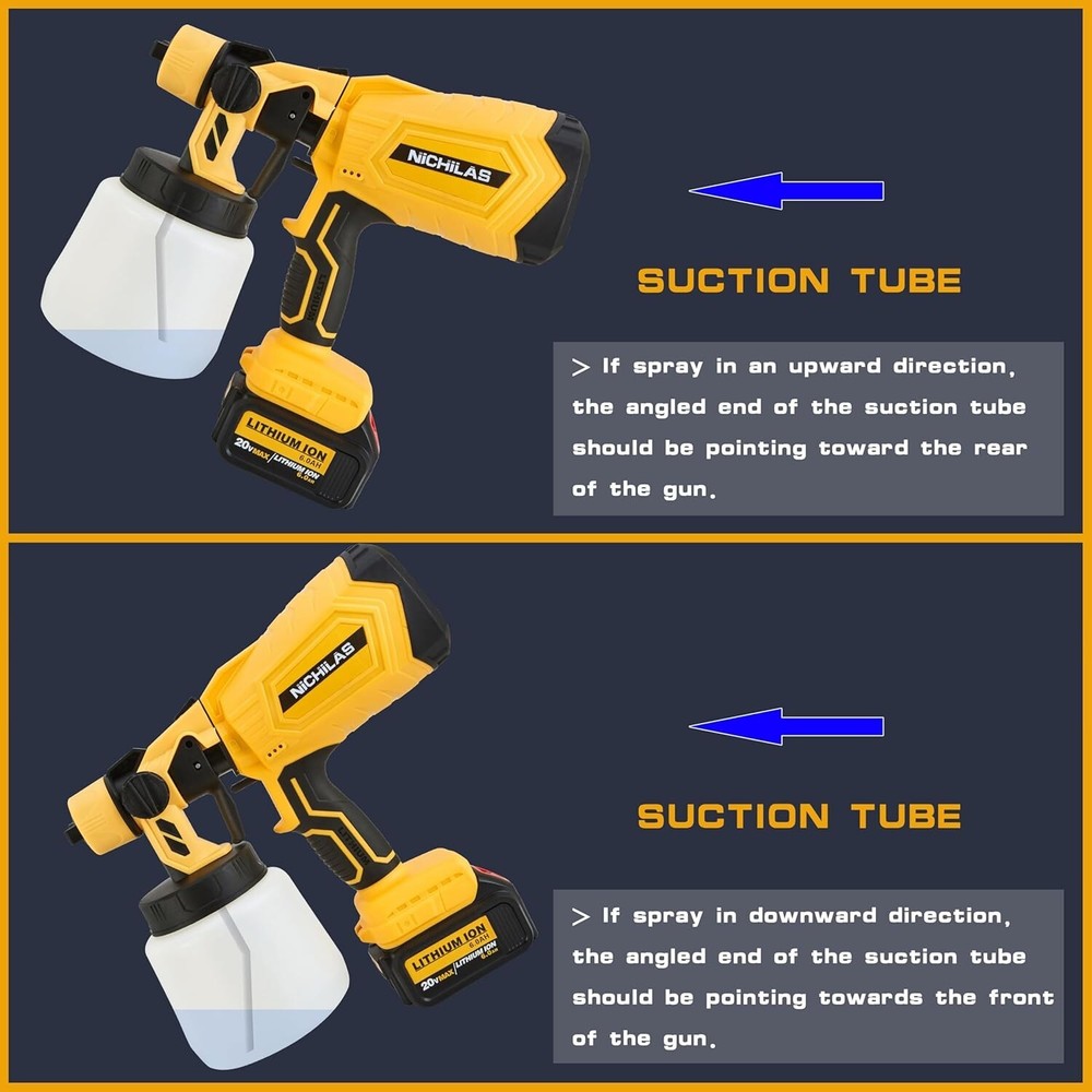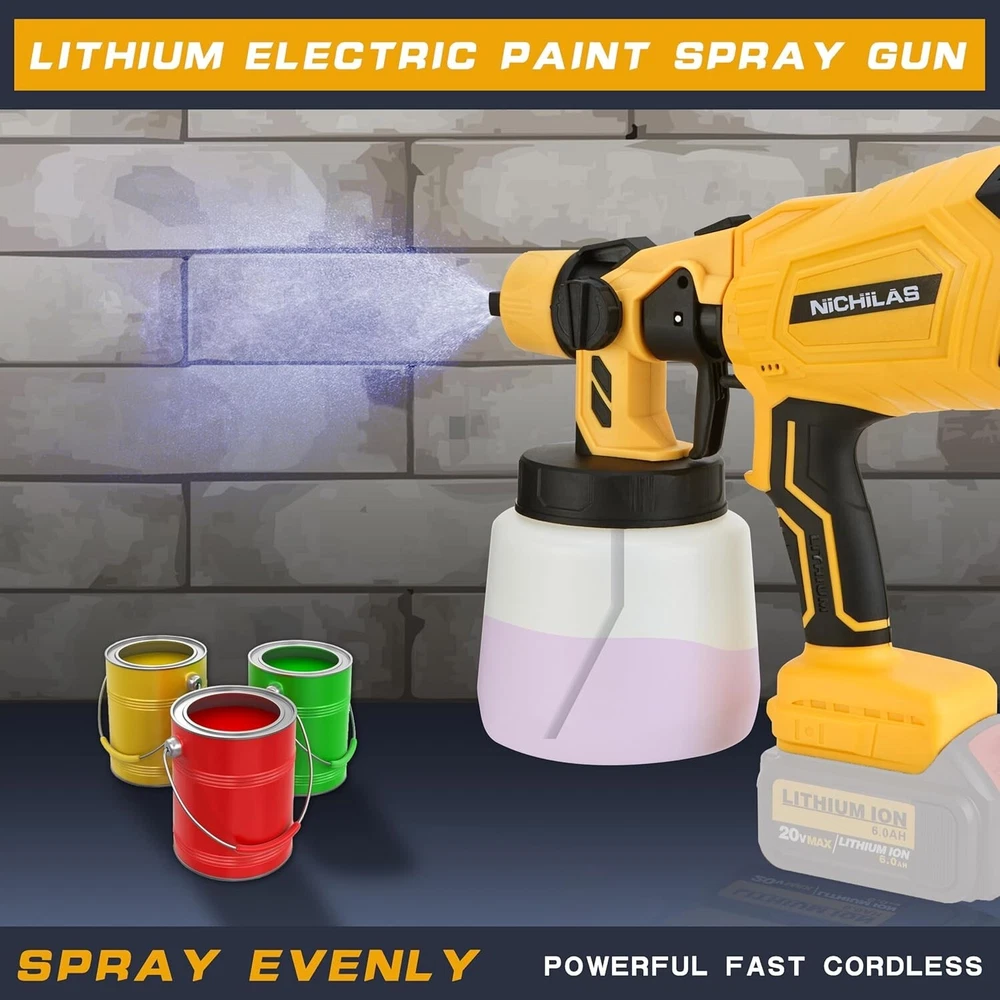 About this item: Cordless Paint Sprayer Tank Volume 1000 Milliliters Color Cordless Paint Sprayer Recommended Uses For Product Painting Material Plastic NOTE : This paint sprayer compatible with DEWALT 20V MAX Batteries. (BATTERY NOT INCLUDE) HVLP & 3 PATTERNS : HVLP spray gun cordless with 3 different spraying methods (horizontal, vertical and circular spraying), you can choose the most suitable one according to spraying environment. COPPER SEALS & SAVE PAINT: Spray paint gun is well-known that paint corrodes plastic. The painting will render the plastic seal useless, leading to paint leakage and clogging. With our copper seals, you get the most out of every ounce of paint! In addition, the anti-backflow design allows you to work as you wish. VISCOSITY CUP: We include a viscosity cup with the paint sprayer to help you ensure the paint viscosity. The maximum paint viscosity our paint sprayer can spray is 50-60 DIN. Fill the viscosity cup with paint. The paint does not need dilution if it can all pass through the viscosity cup within 20-40 seconds. 4 COPPER NOZZLES FOR WIDE APPLICATION: Cordless Paint Sprayer with 4 different nozzles 1.0mm/1.5mm/2.5mm and 1.8mm put in the Sprayer. Suitable for coating doors, windows, walls, fences, decking, ceilings, floors, cabinets, home furniture and other objects.