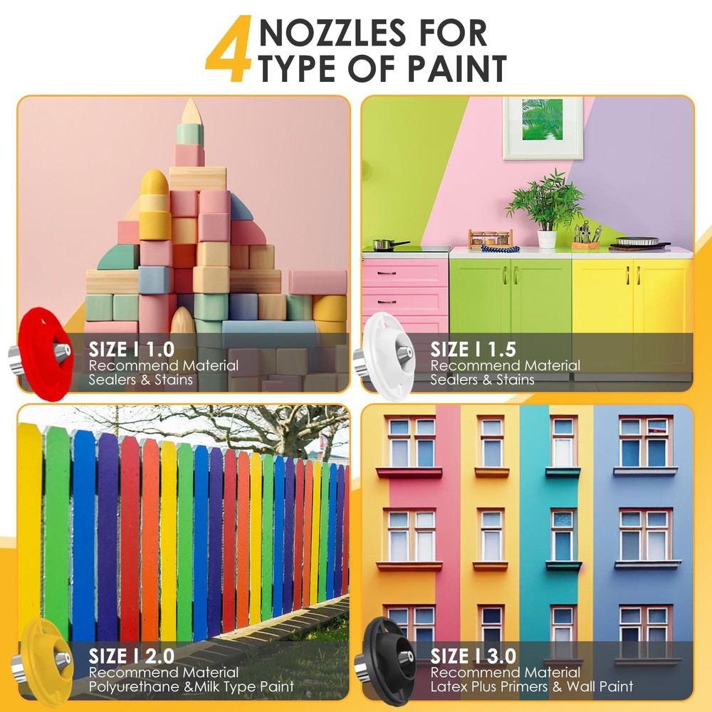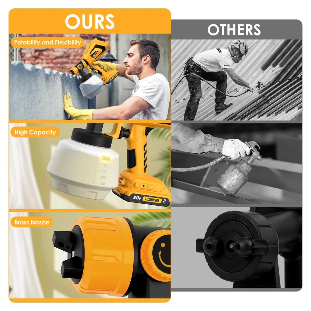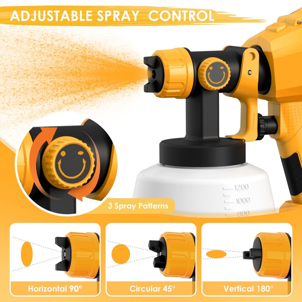 Introducing our Cordless Paint Sprayer, a versatile and convenient tool designed to make your painting projects a breeze. This sprayer is compatible with DE-WALT/MILWAUKEE batteries, allowing you to use it both indoors and outdoors without worrying about cord length or socket safety. With its wireless functionality, you can easily move around and use it wherever you need. Equipped with four different spray nozzles, this paint sprayer enables you to pair it with various types of paints for different applications. Additionally, a professional user manual is provided, making it effortless for users to obtain the correct dilution ratios. Featuring three spraying modes, this sprayer caters to different angles and requirements, giving you the flexibility to achieve professional-quality results at home. Its user-friendly design makes it simple and worry-free to operate, even for beginners. To enhance convenience, we have added a hanging hook design, allowing for easy storage when not in use. Our aim is to provide you with a seamless and enjoyable shopping experience, both through our product and our customer service. If you have any questions or concerns, our team is committed to addressing them with a positive attitude and working together to overcome any difficulties. We hope that our Cordless Paint Sprayer will bring you joy and ease as you embark on your painting ventures. 【Cordless Paint Sprayer】Compatible with Dewalt 20V MAX batteries and other Cordless Tool Battery Packs with the similar port(Battery NOT Included). The portable desgin without troublesome of cords and outlets, you can enjoy the convenience of spraying operation everywhere indoor and outdoor. 【Adjustable Spray Nozzles】:This electric spray paint machine comes with 4 nozzles, measuring 3.0 mm, 2.0 mm, 1.5 mm, and 1.0 mm.Easily switch between different spray modes to accommodate various materials and surfaces,ensuring optimal coverage and finish with every use.Made of pure copper, these nozzles not only prevent paint corrosion but also extend the lifespan of the spray machine. 【3 Spray Patterns】cordless paint sprayer equipped with 3 adjustable spray patterns to meet various spraying scenarios and materials. Such as garden,fence,furniture,walls,doors,windows,household appliances,auto parts spraying,furniture and wood product renovations,etc. 【Easy to Use & Clean】 Simple installation for everyone. It's easy to clean by soaking the parts into the water(paint thinner) and using the brush and needle to clean the left painting. Note:The Motor device is forbidden to use water clean. 【What You Will Get】1X Paint Sprayer, 4X Nozzles, 5 X Paint Filters, 1X Filter Funnel, 1X Nozzle Cleaning Needle, 1X Cleaning Brush,1X User Manual. If you have any questions on your product or order,please contact us via your order.