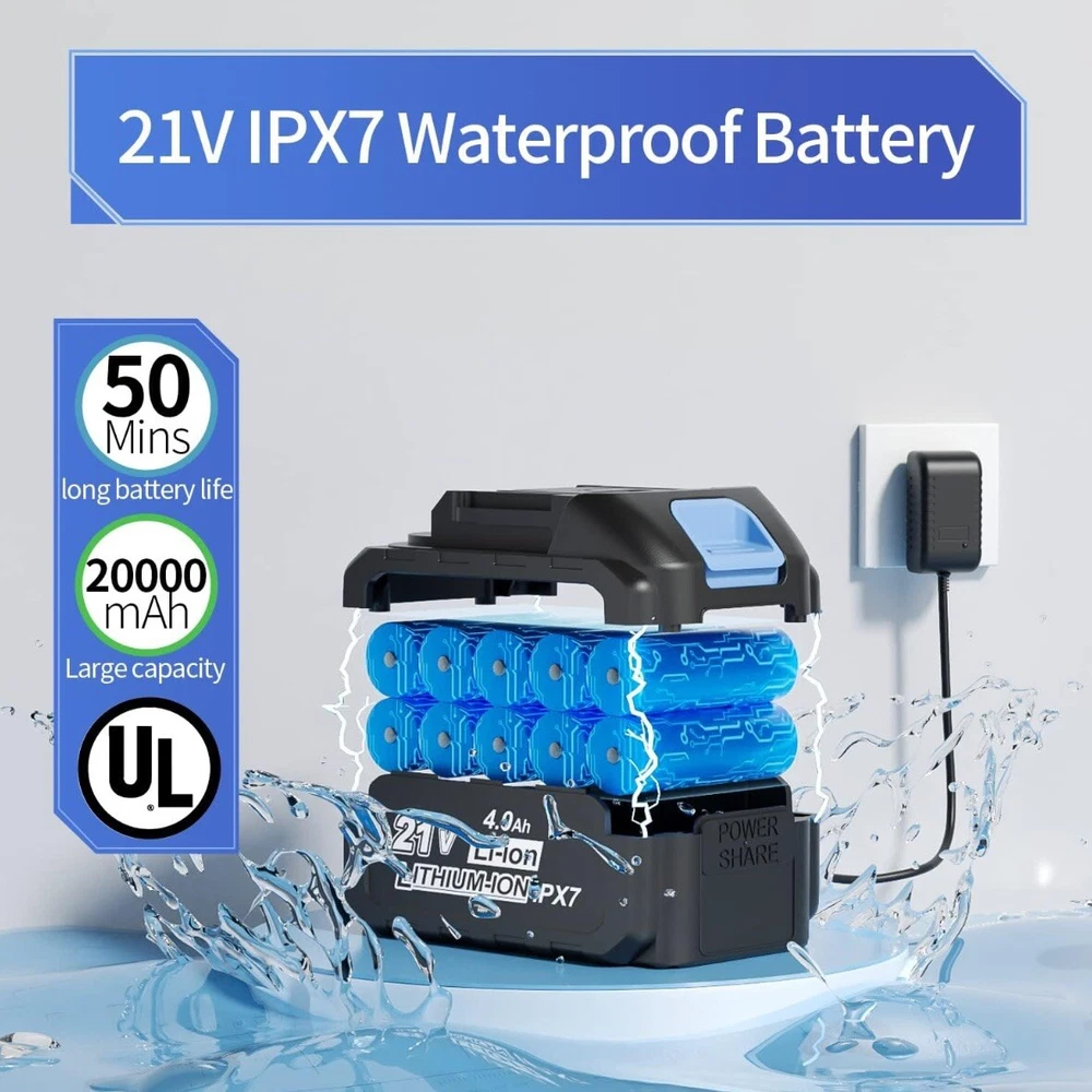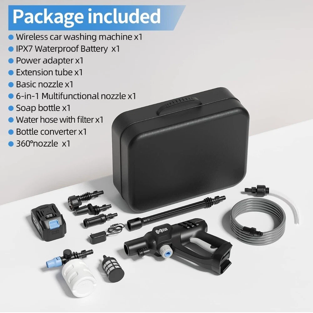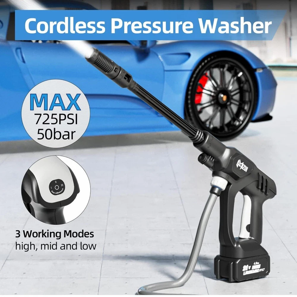 Get your outdoor cleaning tasks done with ease using this cordless portable high pressure spray water gun. This powerful motor gun offers a shooting range of 4-6m and can generate a maximum pressure of 725 psi, making it perfect for cleaning your car, garden, and outdoor areas. The gun comes with a 5-meter water inlet hose, on-board accessory storage, and a quick connect feature for added convenience. Other features of this high pressure water spray gun include a powerful motor, different water spray modes, a telescopic handle, and a 6 IN 1 adjustable nozzle. It has a compact design, is lightweight, and comes with a rechargeable battery that lasts up to 45 minutes. The gun also has a soap tank, water inlet filter, and is made of durable ABS, plastic, and PVC materials.