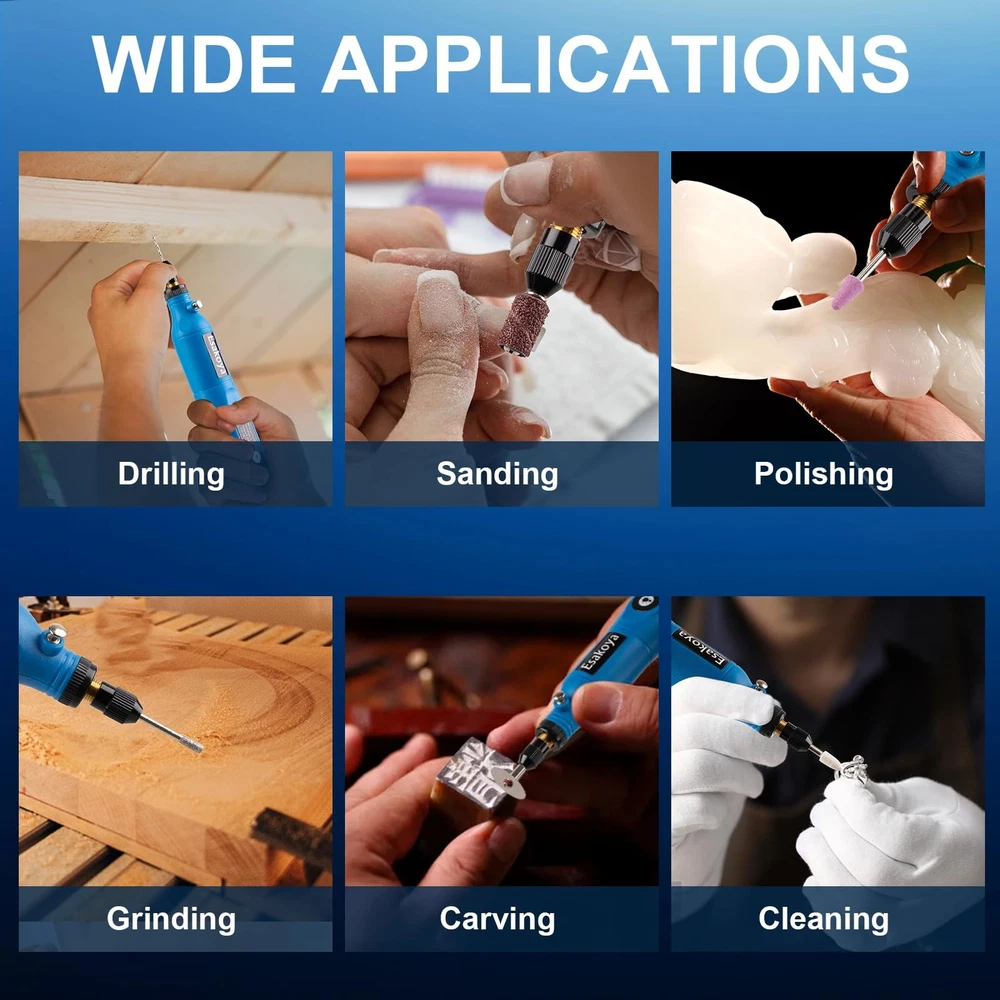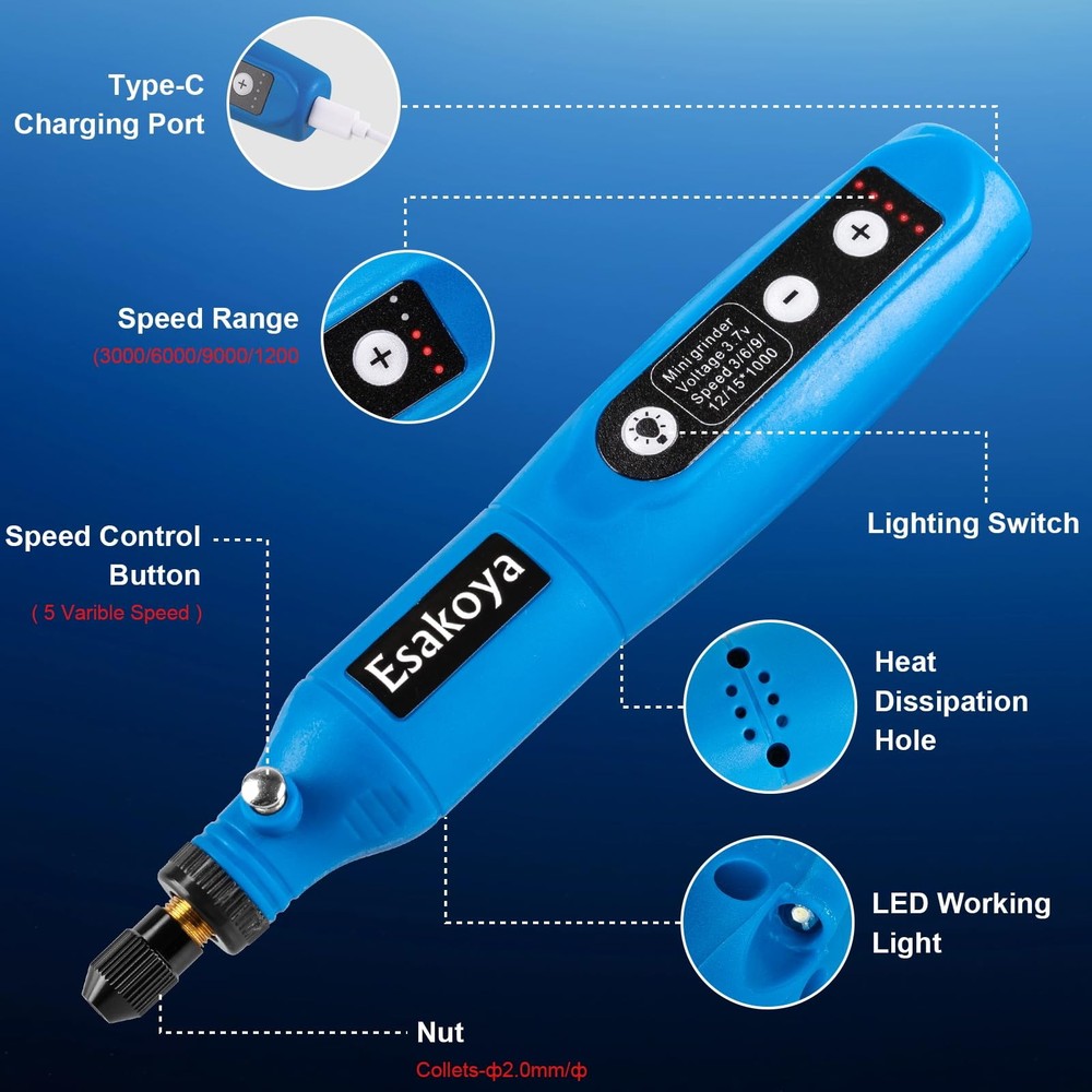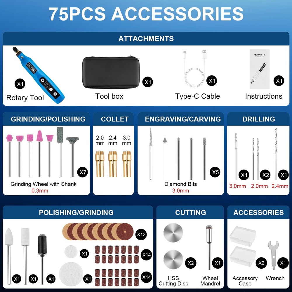 Cordless Rotary Tool, 5-Speed Mini Rotary Tool Kit with 70 Accessories, Multi-Purpose 3.7V Type-C Charging Rotary Tool for Engraving, Sanding, Polishing, Drilling, Grinding, Small DIY Crafts [Versatile Rotary Tool Kit]: Featuring high performance and low noise, this rotary tool is perfect for a variety of DIY projects and can be used on wood, metal, plastic, glass, and ceramics. Whether you're making handmade gifts, performing repairs, or indulging in a hobby, this tool offers the versatility and power you need to bring your ideas to life [5-Speed Settings]: The cordless rotary tool has five adjustable settings(3000/6000/9000/12000/15000RPM) that tailor your tool's speed to your project's needs with five adjustable settings, ensuring precision and control for tasks like sanding, polishing, drilling, etching, and engraving. Perfect for both intricate detailing and heavy-duty use, making it an essential addition to your DIY toolkit [Comprehensive 70-Piece Accessory Set]: This rotary tool kit includes 75 high-quality accessories, such as sanding bands, cutting discs, polishing pads, and engraving bits, allowing you to tackle a wide range of tasks. The versatile accessories are designed to meet all your crafting and repair needs, from smoothing rough edges to adding intricate designs [Large-Capacity Rechargeable Battery]: The cordless tool enjoys extended usage with a 3.7V high-capacity lithium battery, ensuring consistent performance for all your DIY projects and detailed tasks. Recharge quickly and efficiently with the USB-C charging port, making it easy to keep your tool powered up and ready to go anytime, anywhere [Upgraded LED Light & Compact Lightweight Design]: Lightweight and cordless, the rotary tool is designed for ease of use and portability. This tool features an ergonomic design that fits comfortably in your hand, reducing fatigue during extended use. At the same time, it is equipped with LED lights, no dead angle lighting, easy-to-fill light, reduces backlight shadows, overcomes the adverse effects of dark areas on the use of rotary tools, and provides you with a better experience