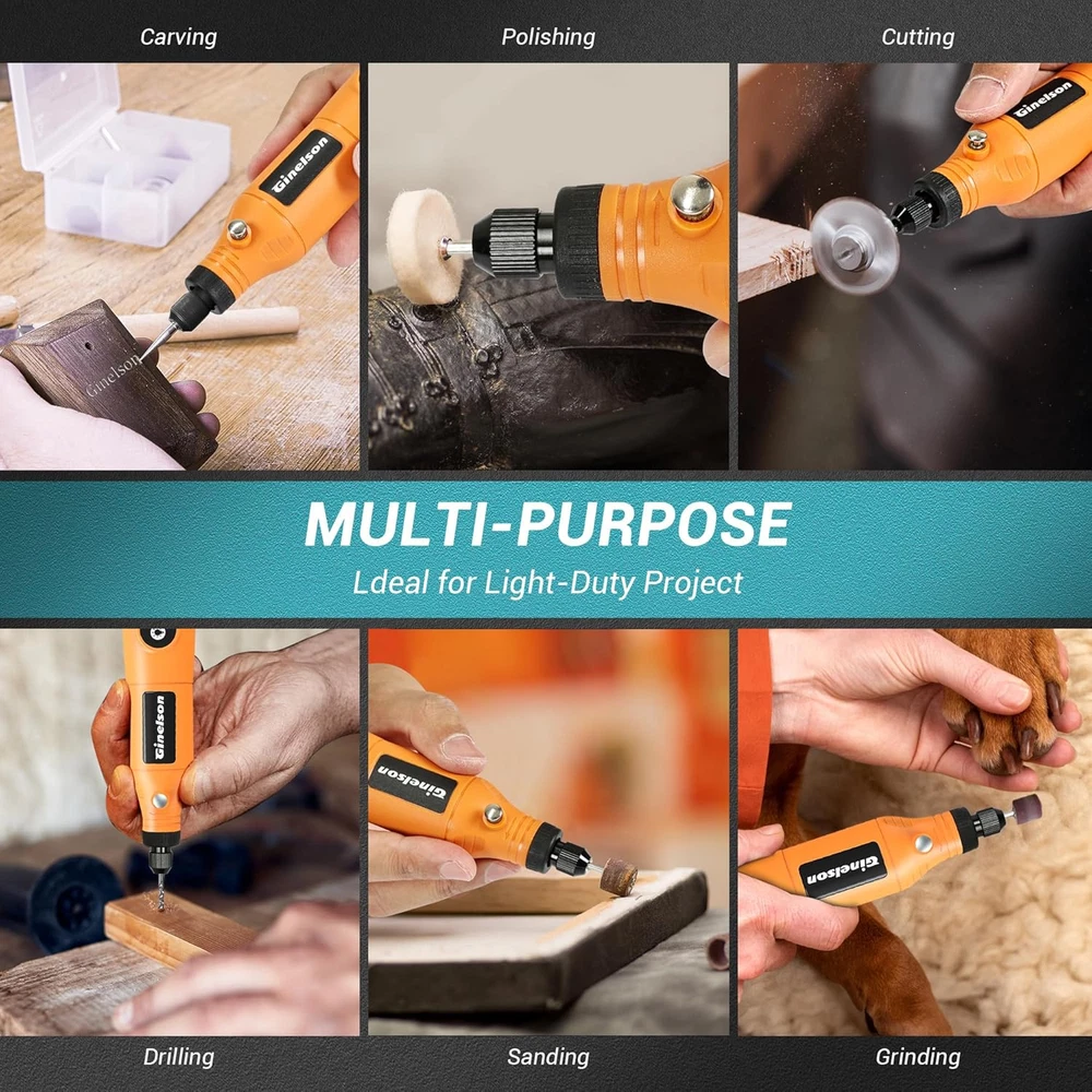 Store New Arrivals Add to Favorite View Feedback Contact Cordless Rotary Tool, 2000 Mah Battery Pack, 5-Speed and USB-C Charging Rotary Tool Kit with 70 Accessories, Multi-Purpose 3.7V Power Rotary Tool for Sanding, Polishing, Engraving, DIY Crafts Description Item model number YJ007 Style Easy to used,Cordless,Mini,Rotary Tool Power Source Battery Powered Battery Cell Type Lithium Batteries Included? No Batteries Required? No Product Dimensions 6.8 x 1.3 x 1.2 inches Minimum Speed 5000 RPM Number of Batteries 1 AA batteries required. Item Package Quantity 1 Item dimensions L x W x H 6.8 x 1.3 x 1.2 inches Item Weight 4.8 ounces Maximum Rotational Speed 18000 RPM Special Features Led Light, Lightweight, Variable Speed, Cordless, Multi Use Special Feature Led Light, Lightweight, Variable Speed, Cordless, Multi Use Part Number YJ007 Color Orange Batteries 1 AA batteries required. Voltage 3.7 Volts Recommended Uses For Product Cutting, DIY, Sanding, Deburring, Polishing, Grinding đăUSB-C Charging and Longer Running TimeăThe cordless rotary tool comes with a 3.7V rechargeable battery that can work continuously for 240 minutes. A single charge can be used multiple times, making it stress-free and convenient. Battery-powered rotary tool allows you to work for a long time. (The indicator light will turn green when fully charged) đă5-Speed SettingăThe cordless rotary tool can realize 5-speed adjustment(5000/8000/11000/14000/18000 RPM) for easier speed control and meet the power demands of different tasks. This allows for safe and careful sanding in stages, even for beginners who can easily control the speed, convenient for creations. Note: It is not suitable for heavy-duty projects đăSMALL SIZEă Small size allows you to get closer to your workpiece and provides maximum control in precision etching, engraving, polishing and sanding applications đăQUIETăCompact motor is perfect for home use, more comfortable in your hand while using the tool đăRotary Tool with LED IndicatorăThe upgraded small cordless rotary tool has a blind spot lighting LED design, which reduces backlight shadows and overcomes the adverse effects of dark areas on the use of the drill for resin. It provides you with a better experience and more precise work đăVersatile Rotary Tool SetăThis rotary tool set includes a high-performance and low-noise rotary tool with 70 of the most popular power rotary tool accessories for fine DIY work.It's like having a whole toolbox in one convenient package. Note: Not suitable for heavy-duty projects Product Description Ginelson 3.7V MINI CORDLESS ROTARY TOOL The Quick USB-C charging rotary tool kit with 70 accessories can realize 5-speed adjustment(5000/8000/11000/14000/18000 RPM), used for sanding, polishing, drilling, etching, engraving, DIY crafts. DESIGNING âFUNâ Our focus was on creating a tool that would be easier to enjoy while still being powerful. EASY TO USE Ginelson Cordless rotary tool are used not only by professionals but also by DIYers and hobbyists. TIPS FOR ENJOYING DIY Ginelson cordless rotary tool is a funny tool that lets you turn your creativity into designs. ABOUT US We offer the best prices around on high quality products. Our E-store includes media such as books, movies, music and games while offering electronics, toys, sporting apparel, clothing, tools, general home, garden items and more. SHIPPING We are always working hard to ensure your package arrives as soon as possible. Please understand that some factors like weather, high postal traffic, and the performance of shipping companies are outside of our control. We offer free shipping to the lower 48 states and ship within 2 business days of payment, usually sooner. We do not accept P.O. Boxes. Please provide a physical address. For shipping outside of the continental USA, we only use eBay's Global Shipping Program.The item is shipped to KY and then sent to the rest of the world. International customers are responsible for all duties and taxes. Continue to check out in order to calculate costs for shipping the item to your country. Messages regarding eBay's Global Shipping Program MUST be directed at eBay EXCLUSIVELY. RETURNS We offer a 30-Day Return Policy on items which you are not completely satisfied with. You have the option for a full-refund or an exchange of the item. No returns are available on items shipped outside of the USA. PAYMENT We accept PayPal. CONTACT US This page content is yet to come Please ad us to your favorite seller and visit again later Thank You CUSTOMER SATISFACTION We try our very best to make sure every customer is completely satisfied. If there's a problem, message us! We're happy to help. WE ACCEPT Copyright © 2021 AutoDS. | All Rights Reserved