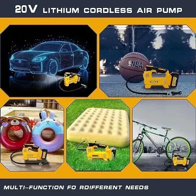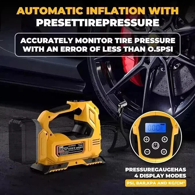 About this item Compatible with Dual Power: The YAWV portable air compressor is compatible with De-Walt 20V max Lithium Battery, powerstack battery, suitable for DCB203、DCB204、DCB206 and more. At the same time, our tire inflator comes with an 11FT long 12V car cigarette lighter plug and supports car power supply, which is perfect for use indoors and during travel. 25 Cylinder Powerful and Fast Inflation: The tire inflator is equipped with a high-performance 550 pure copper motor, which outputs strong power and has a stable air flow of 35L/MIN. It can inflate 215/55 R17 car tires from 0 to 36psi in 4 minutes, and it only takes 1 minute to quickly inflate 29-36psi. , return your tires to their best condition in a short time. Please note that after 20 minutes of continuous use, please allow the air compressor to fully rest and cool down before continuing to use it. Automatic inflation with preset tire pressure: No more manually checking tire pressure or worrying about over-inflation. Our air pump is equipped with an advanced sensing chip so that it has an intelligent preset function and can accurately monitor tire pressure with an error of less than 0.5psi. You only need to set the required tire pressure and the air pump will automatically inflate and stop to ensure that the tire pressure reaches the maximum Best level. Digital Display and LED Lighting: The portable tire inflator is equipped with a high-precision, high-brightness display to help you detect tire pressure in real time. And the air compressor pressure gauge has four display modes, which can display pressure in PSI, BAR, KPA and KG/CM². 4 bright LED lights allow you to use it easily even in the dark. Convenient Storage: The tire inflator has an integrated accessory storage compartment and is equipped with different specifications of valves, compatible with SUVs, cars, motorcycles, bicycles and other sports equipment. The pump tube storage slots designed on both sides of the base allow you to store and carry it easily and concisely. This package includes: YAWV air pump, 12V power cord, three nozzles and a user manual.