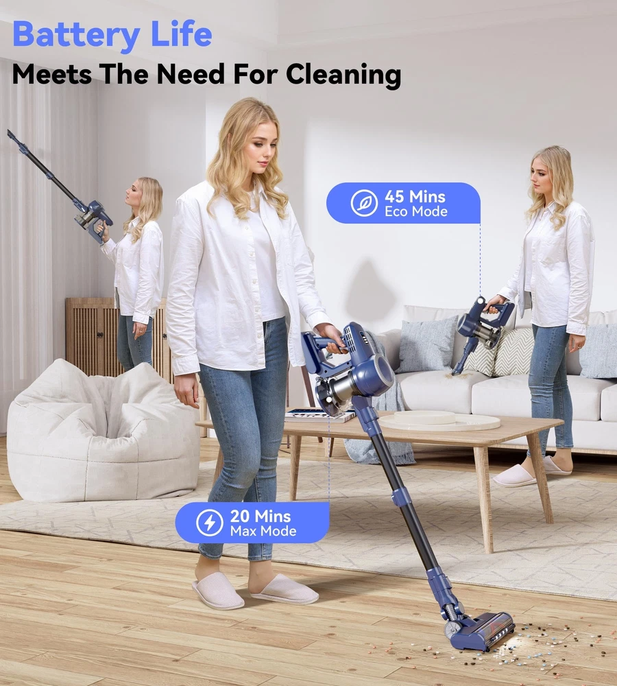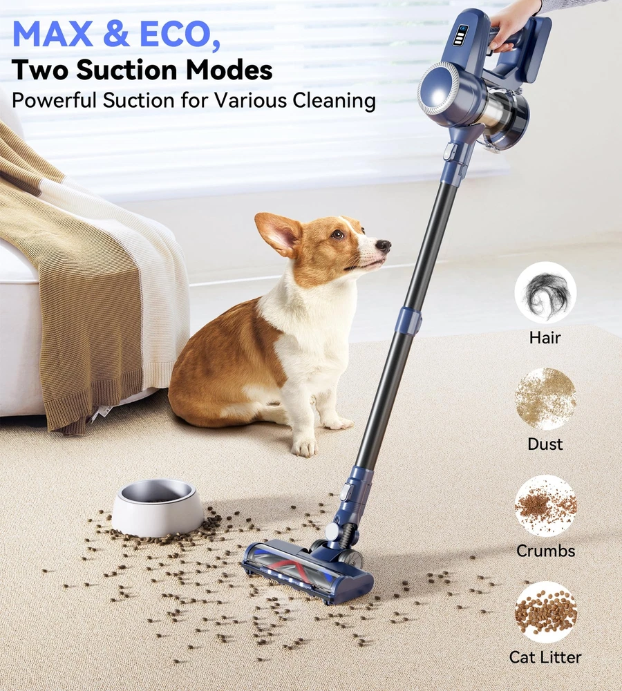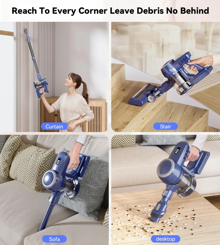 ๐ฟใ๐๐๐ญ๐ญ๐๐ซ๐ฒ ๐๐ง๐๐ฎ๐ซ๐๐ง๐๐ ๐๐ญ๐ซ๐๐ญ๐๐ ๐ฒใThe VC2207 Cordless Stick Vacuum features a removable 6*2200mAh lithium-ion battery pack. With a mere 4 hours of charging, it delivers 20 minutes of runtime in MAX mode and 45 minutes in Eco mode, ensuring ample battery endurance to fulfill your daily cleaning needs. ๐ฟใ๐ ๐๐ฉ๐ญ๐ข๐จ๐ง๐๐ฅ ๐๐ฎ๐๐ญ๐ข๐จ๐ง ๐๐จ๐๐๐ฌใThe VC2207 cordless vacuum cleaner features an advanced 180W motor for enhanced performance. Delivering a powerful 26kPa suction in MAX mode, it efficiently captures various debris, including pet hair, dust, grains, and cat litter. Ideal for hardwood floors, low pile carpets, tile floors, marble floors, and stairs. ๐ฟใ๐๐ง๐ญ๐ข-๐๐๐ง๐ ๐ฅ๐ ๐๐ซ๐ฎ๐ฌ๐ก & ๐ ๐๐๐ ๐๐ข๐ ๐ก๐ญ๐ฌใThe VC2207 Home Vacuum Cleaners showcase an innovative V-shaped roller brush, blending hard and soft bristles to minimize hair tangling and effortlessly clean hardwood floors and low-pile carpets. Moreover, its 180ยฐ rotating brush head, equipped with four powerful LED lights, illuminates dust beneath furniture and in corners, ensuring a thorough cleaning, leaving your home immaculate. ๐ฟใ๐๐๐๐ ๐ ๐ข๐ฅ๐ญ๐ซ๐๐ญ๐ข๐จ๐ง ๐๐ฒ๐ฌ๐ญ๐๐ฆใThe VC2207 Vacuum cleaner boasts a fully sealed 5-stage high-efficiency filtration system, capturing 99.99% of dust particles as small as 0.1 micron, ensuring fresher air for you and your family. Its removable and washable HEPA filter adds convenience to maintenance. ๐ฟใ โ๐๐๐ฌ๐ฒ ๐๐ฎ๐ฆ๐ฉ๐ข๐ง๐ " ๐๐ฎ๐ฌ๐ญ ๐๐ฎ๐ฉใThe VC2207 Vacuum cleaners boast a spacious 1.5L dust cup, while their cyclonic airflow design facilitates efficient rotation of particles and hair with the airflow, minimizing suction loss. Featuring a convenient "one-touch dust dumping" design, emptying is hassle-free. Note: Regular filter cleaning prevents suction weakening and clogging.