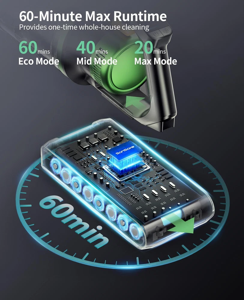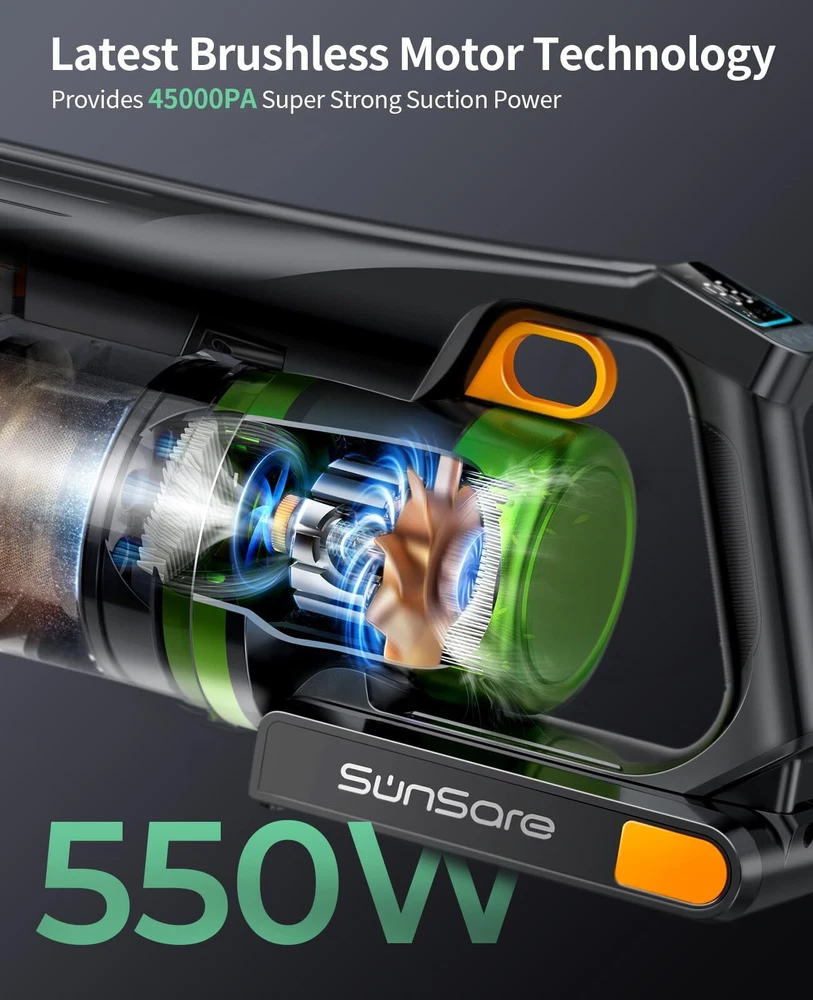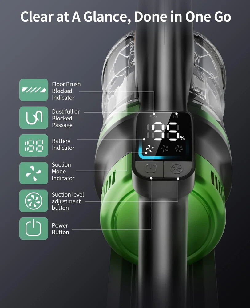 【Green LED Laser Illumination】Upgrade your cleaning routine with the Vacuum Cleaner featuring a green LED brush head. The precise laser makes invisible dust visible on hard floors. 【High Efficiency Filtration & Fresh Fragrance】Advanced whole-machine filtration traps 99.99% of fine dust. It has a built-in aromatherapy tablet that leaves a light fragrance in every room it touches. 【One-pull Dust Cup Emptying】Hygienic bin emptying: No need to touch the dirt. The large 1.5L dust cup capacity holds more trash, reducing the need for frequent emptying. 【Upgraded Battery】The rechargeable battery, built with 8 lithium-ion batteries (2800 mAh), provides up to 60 minutes of fade-free power. Thanks to smart chip protection, it has overcharge and over-discharge protection. Quick 4-hour charging time. 【Strong Suction】Cordless stick vacuum cleaner with a 550W brushless digital motor. It features more power, less noise, and longer battery life. Strong suction for whole-home deep cleaning. Converts to a handheld for cleaning cars, stairs, and upholstery. 【Displays Mode】The cordless vacuum adopts a smart screen, allowing you to monitor the indicators and status of the vacuum cleaner in real-time. Displays power mode, run time countdown, and maintenance alerts. The LED screen shows the 3 suction power modes in real-time.
