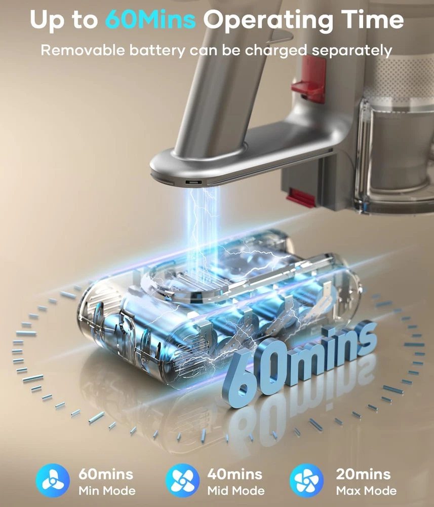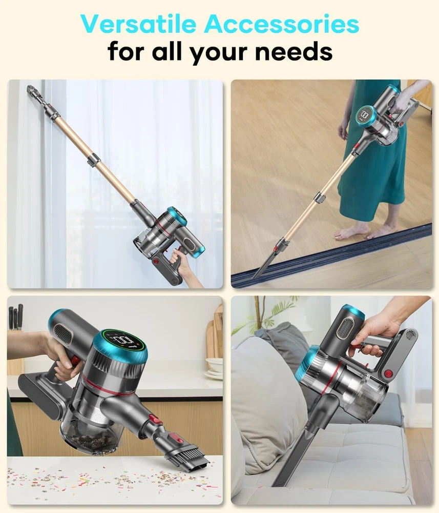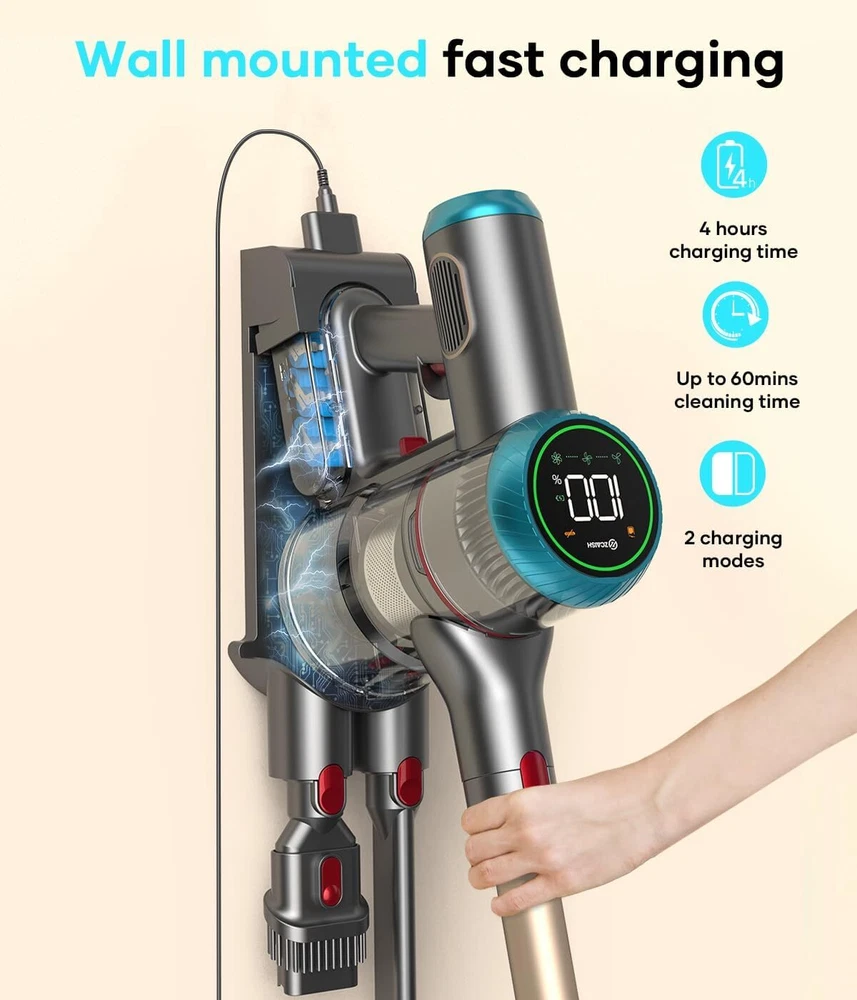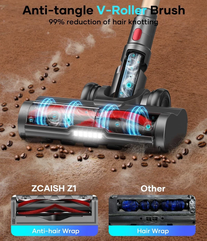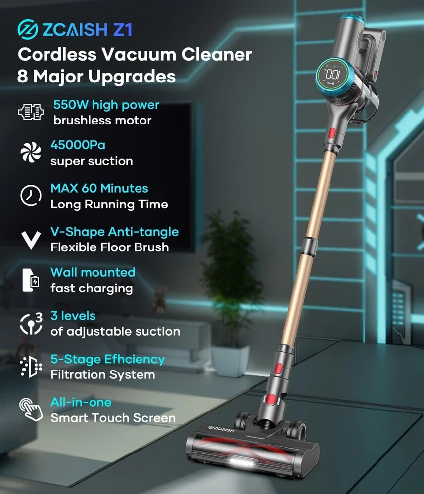 Cordless Vacuum Cleaner, 550W/45Kpa Stick with Smart Display, MAX Gold Product Details Brand: ZCAISH Special Feature: Intelligent Touch Screen, MAX 60Mins Runtime, 7x 2500mAh battery, V-shape floor brush,High efficiency filtration system, 40Kpa strong suction power/500W brushless motor Filter Type: HEPA Filter Included Components: ZCAISH Z1 Cordless Vacuum Cleaner*1, Manual Instructions*1, Short Brush Head*1, Long Crevice Nozzle*1, Hair Cleaning Tool*1, Charging Wall Mount Plate, Replaceable HEPA filte*2 Is Cordless?: Yes Capacity: 1.5 Liters Wattage: 500 watts Runtime: 1 hour Charging Time: 4 Hours Maximum Suction: 44.5 Inches Recommended Uses For Product: Carpet, Hard Floor, Pet Hair Form Factor: Stick Color: Gold Model Name: Z01 vacuum cleaner Product Dimensions: 12"L x 10"W x 28"H Battery Description: Lithium-Ion Manufacturer: ZCAISH Number of Items: 1 Controller Type: Push Button Motor Horsepower: 0.737 horsepower Control Method: Touch Portable: Yes Number of Handles: 1 Number of Power Levels: 3 Series Number: 1 Indoor/Outdoor Usage: Indoor Finish Type: Smooth and Glossy Manufacture Year: 2024 Item Weight: 9 pounds Country of Origin: China Item model number: Z01-US2 Batteries: 1 Lithium Ion batteries required. (included) Finish types: Smooth and Glossy Batteries required: Yes Battery type: Lithium-Ion Special Feature: Intelligent Touch Screen, MAX 60Mins Runtime, 7x 2500mAh battery, V-shape floor brush,High efficiency filtration system, 40Kpa strong suction power/500W brushless motor Intelligent Touch Screen, MAX 60Mins Runtime, 7x 2500mAh battery, V-shape floor brush,High efficiency filtration system, 40Kpa strong suction power/500W brushless motorIntelligent Touch Screen, MAX 60Mins Runtime, 7x 2500mAh battery, V-shape floor brush,High efficiency filtration system, 40Kpa strong suction power/500W brushless motor See more Included Components: ZCAISH Z1 Cordless Vacuum Cleaner*1, Manual Instructions*1, Short Brush Head*1, Long Crevice Nozzle*1, Hair Cleaning Tool*1, Charging Wall Mount Plate, Replaceable HEPA filte*2 ZCAISH Z1 Cordless Vacuum Cleaner*1, Manual Instructions*1, Short Brush Head*1, Long Crevice Nozzle*1, Hair Cleaning Tool*1, Charging Wall Mount Plate, Replaceable HEPA filte*2ZCAISH Z1 Cordless Vacuum Cleaner*1, Manual Instructions*1, Short Brush Head*1, Long Crevice Nozzle*1, Hair Cleaning Tool*1, Charging Wall Mount Plate, Replaceable HEPA filte*2 See more Surface RecommendationPower Source: All floorsBattery Powered VoltageItem Weight: 25.9 Volts9 Pounds 【45Kpa/550W Cordless Vacuum Cleaner】:ZCAISH Z1 cordless vacuum cleaner is equipped with 2024 newly upgraded 550W brushless motor, which gives the vacuum cleaner 45Kpa powerful suction in max mode, which can instantly capture dust, pet hair, large crumbs, and deep dirt on carpets, hardwood floors, and tiles, and help you to deep clean efficiently and quickly 【MAX 60Mins Runtime】:The cordless stick vacuum is upgraded to 7*2500mAh cell batteries, which can run for 60 minutes at minimum suction, perfect for uninterrupted whole-house cleaning. The battery has no memory effect and runs up to 40% longer than other vacuums. The rechargeable wall mount combines storage and charging in one unit for easy charging and storage and it will be fully charged in 4 hours 【Intelligent Touch Screen】:The lightweight vacuum cleaner has a humanized design intelligent touch screen, through the touch screen can adjust cordless vacuum cleaner 3 suction modes, real-time monitoring to the remaining battery power, dust cup full of dust reminder and brush roll clogging reminder 【5-layer Filtration System with Fragrance】:The vacuum cleaner has a built-in 5-stage HEPA filtration system that captures dust particles as small as 0.1 micron in diameter, with a filtration efficiency of up to 99.99%. At the same time, the built-in aromatherapy tablet makes the cleaned room emit pleasant fragrance, which improves the quality of life while providing cleanliness 【V-Shape Anti-tangle Flexible Floor Brush】:The new V-shaped roller brush can effectively solve the hair-tangling problem common to traditional hardwood floor vacuum. The flexible floor brush can support 0° to 180° side-to-side and 0° to 90° up and down swivel steering. Bright LED headlight can illuminate the corners and hidden dust has nowhere to go 【1.5L Dust Cup & One-Button Empty】:This stick vacuum cordless 1.5L dust cup meets multiple cleaning without frequent emptying, one button emptying to avoid with touching the dust. Vacuum cleaner wireless and lightweight design, can be used anytime and anywhere, using accessories can be assembled into a multifunctional handheld vacuum cleaner