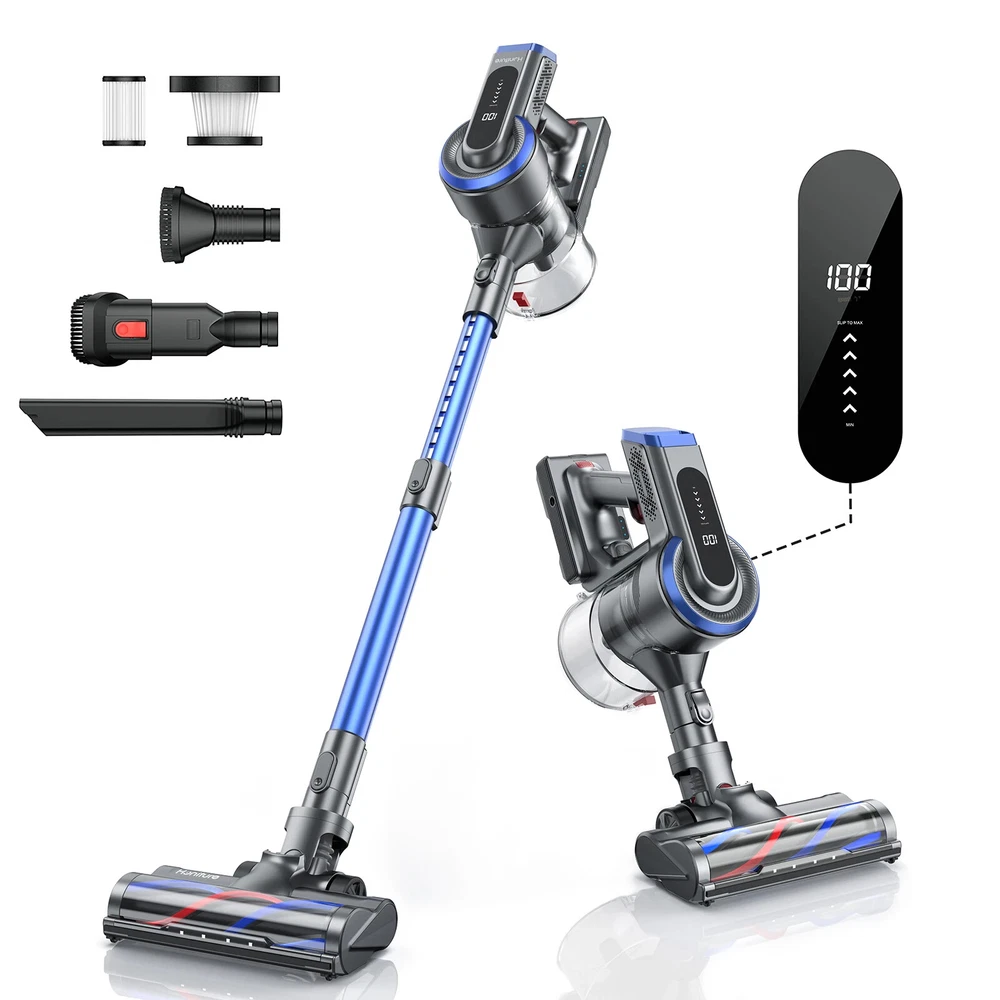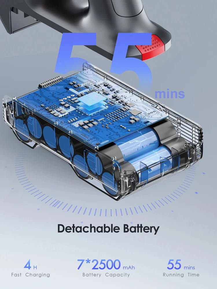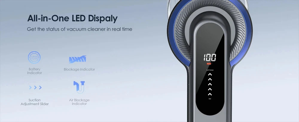 38000pa Brushless Motor Vacuum Cleaner: With a 450W brushless motor, it generates strong suction power of 15Kpa-38Kpa and 5 adjustable gears, it helps to clean dust, animal hair, cat litter, and mites, helping you thoroughly clean sofas, beds, carpets, and floors, bringing you a highly clean environment. The battery of this vacuum cleaner can be fully charged within 4-5 hours, with a 7 * 2500mAh battery and an intelligent battery protection chip to ensure battery life. 【 Ultra clear LED screen 】 You can control the 5 power settings of the vacuum cleaner on the screen and monitor its operation in real-time. The powerful vacuum cleaner features a 1.2-liter large capacity dust cup and a 5-layer cyclone filtration system, effectively reducing emptying frequency and interruptions. A 5-layer cyclone filtration system effectively separates and concentrates waste in the storage tank. Equipped with a 6C ground brush and an advanced V-shaped soft brush with bristles to prevent hair from tangled with the brush, it is highly efficient
