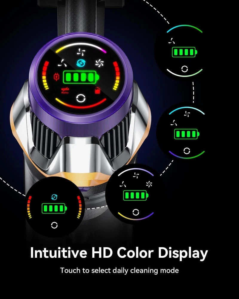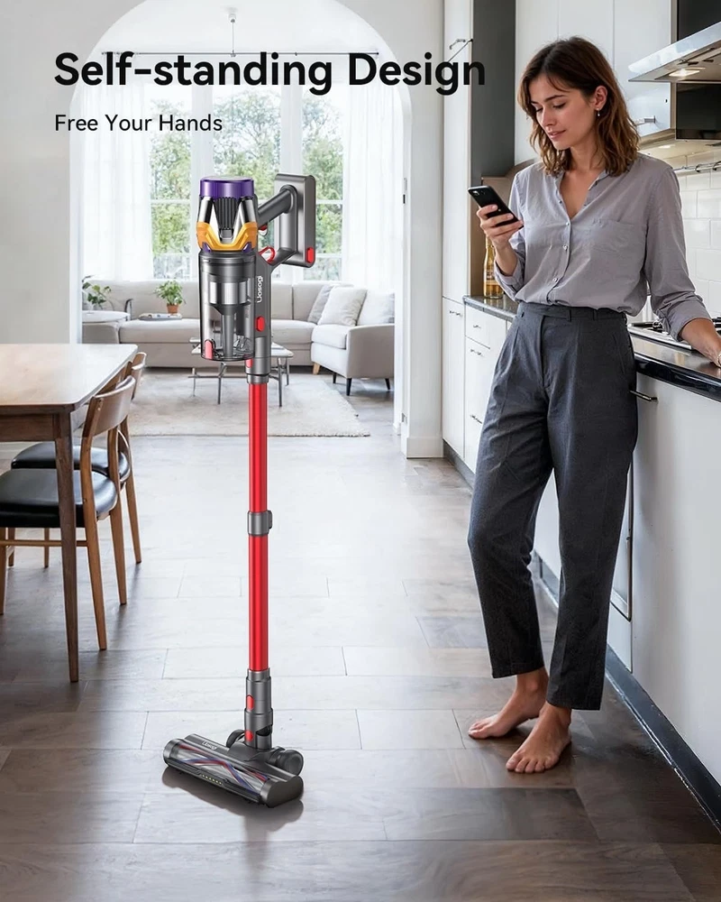 About this item [55KPa Suction & Hurricane Mode]: Powered by a market-leading 650W motor, this cordless vacuum delivers powerful suction up to 55KPa. With 3 adjustable power modes, it easily handles daily dust, large debris, and pet hair. For the toughest challenges, the innovative pull ring design lets you instantly activate the 4th Hurricane Mode, with a suction power of up to 60Kpa to tackle deep-seated carpet grime and stubborn pet hair with ease. [70-Min Battery Life & Wall-Mounted Charging]: Equipped with an 8x2800mAh battery pack, this vacuum delivers up to 70 mins of uninterrupted runtime—enough to thoroughly clean large spaces like living rooms and staircases in a single charge. The wall-mounted dock not only recharges but also stores the vacuum and all brush heads, keeping your cleaning system organized and always ready for use. (Please use the Uosogi original adapter for charging) [V-Shaped Anti-Tangle Brush]: Say goodbye to tangled pet hair. The innovative V-shaped brush head, with its integrated comb-teeth, actively prevents hair wrap for effortless cleanup. It also features grooved side brushes that rotate a full 270° and 6 bright LED lights that illuminate under furniture, ensuring no dust is left behind in corners, under beds, or around table legs and sofas. [High-Definition Color LED Display]: Adjust suction power effortlessly with the responsive touchscreen. Its oversized, high-resolution icons are intuitively designed for easy use by everyone, including those who are nearsighted or elderly. The panel displays real-time battery status to help you plan your cleaning, and will alert you instantly if maintenance is required. Everyone can enjoy the convenience and fun of smart cleaning! [Freestanding Design]: The X9 Turbo vacuum cleaner features a freestanding design for true hands-free convenience. It stands securely on its own, giving you the flexibility to answer calls, switch cleaning areas, or tidy up clutter. The adjustable telescopic tube comfortably adapts to users of any height, ensuring an ergonomic and comfortable cleaning experience. [99.99% High Efficiency Filtration]: This cordless stick vacuum cleaner utilizes 8 layers of precision filtration and a multi-vortex structure for highly efficient cyclonic separation, effectively blocking 99.99% of large and fine dust particles, delivering clean air. The 1.8L dust bin reduces maintenance frequency, while the one-touch emptying function makes disposal quick and hygienic. The Cordless Vacuum Cleaner is a powerful cleaning tool with a runtime of up to 70 minutes and a quick charge time of 3.5 hours. This upgraded model features a HEPA filter, 650W power, and a hurricane force suction power of 55KPA. It is cordless, lightweight, and bagless, making it easy to maneuver and empty. The sleek red color and inclusion of a filter accessory make it a convenient and efficient choice for keeping your home clean and tidy. Made in the United States, this vacuum cleaner provides reliable performance for all your cleaning needs.