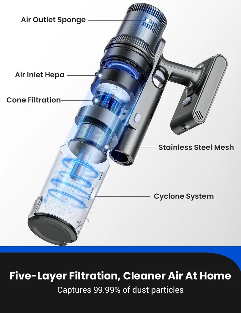 【Also a Mop & Detachable Mopping Base】The stick vacuum cleaner cordless boasts a detachable mopping base, elevating its functionality beyond mere vacuuming. Featuring a generous 340 mL water tank, it provides ample water for thorough floor mopping tasks. 【Deep & Ultra-Quiet Cleans Your Whole Home】The cordless vacuum boasts a high-performance, ultra-quiet digital motor, delivering an impressive 550W power output and 45kPa strong suction, perfect for picking up dust, dirt, and pet hair from both hard floors and carpets. Quickly transforms into a cordless handheld vacuum cleaner, with the 2-in-1 Dusting Brush / Crevice Tool – for all around your home and car.You can have a clean and quiet environment without being disturbed by noise. 【50-Minute Runtime with Visible Remaining Time】The vacuum cleaners for home features 2,200 mAh *8 detachable battery packs, offering up to 50 minutes of runtime on a single charge!The LED touchscreen monitors battery level, three cleaning modes and error messages for a smart hardwood floor cleaning experience. 【Powerful LED lights illuminate Hidden Debris 】These powerful LED lights illuminate hidden debris, making it easier to spot and clean even the most obscure dirt particles. Coupled with the versatile multi-surface brush design, this feature significantly enhances cleaning efficiency. 【Replaceable Battery, Flexible Charging】 The cordless stick vacuum’s detachable battery allows easy charging inside or outside the unit. With an additional battery (sold separately), you can instantly extend the cleaning time.