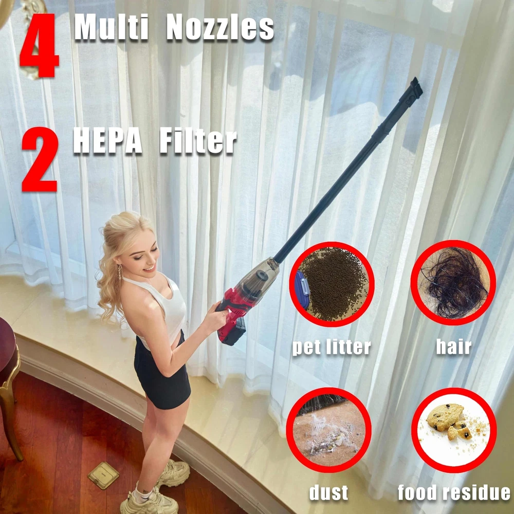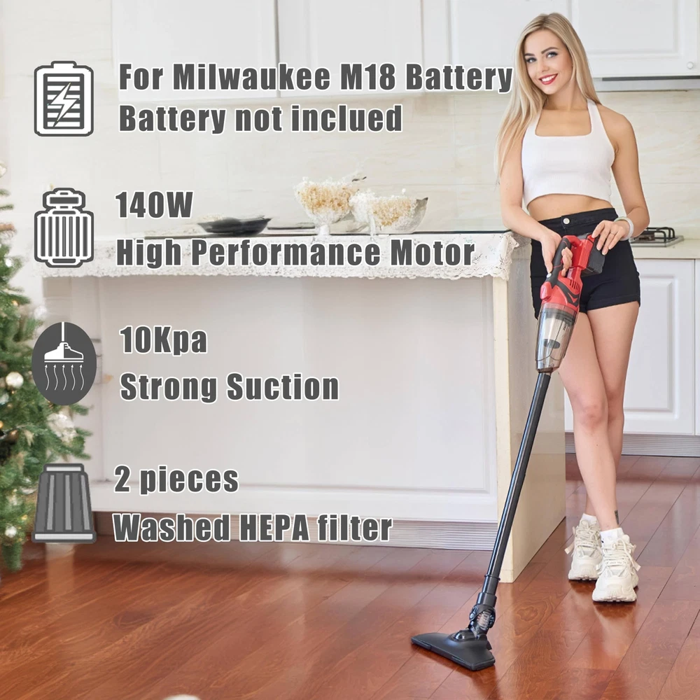 Cordless Vacuum Cleaner for Milwaukee M18 Battery,Wireless Handheld Power Vacuum Cleaner for Home, Boat, Workshop, Car, Pet Hair, Furniture(Tool Only No Battery) Product Details Brand: PMLYQ Special Feature: Wet/Dry, Cordless, HEPA Filter Type: HEPA Filter Included Components: 1 x Small Circular Brush, 1 x 2-in-1 Brush, 2 x HEPA Filter, 1 x Floor Brush, 1 x Sofa Brush Is Cordless?: Yes Brand: PMLYQ Special Feature: Wet/Dry, Cordless, HEPA Filter Type: HEPA Filter Included Components: 1 x Small Circular Brush, 1 x 2-in-1 Brush, 2 x HEPA Filter, 1 x Floor Brush, 1 x Sofa Brush Is Cordless?: Yes Capacity: 0.6 Liters Wattage: 140 watts Recommended Uses For Product: Home Form Factor: Handheld Color: Red Model Name: Cordless Vacuum Cleaner Product Dimensions: 18.6"L x 6.2"W x 6"H Battery Description: Lithium-Ion Manufacturer: PMLYQ Number of Items: 48 Controller Type: Push Button Motor Horsepower: 0.189 horsepower Control Method: Touch Style: Sleek Portable: Yes Number of Handles: 1 Number of Power Levels: 4 Indoor/Outdoor Usage: Indoor UPC: 727210840102 Item Weight: 3.3 pounds Country of Origin: China Item model number: MWQXCQ Batteries required: Yes Battery type: Lithium-Ion Compatible with Milwaukee M18 Battery: This cordless vacuum cleaner is specially designed to be compatible with Milwaukee batteries, providing users with a wider range of choices. Milwaukee batteries are known for their high quality and reliability, providing stable and long-lasting power support for vacuum cleaners. Users don't need to worry about battery life, just replace the battery and continue to enjoy efficient cleaning services Convenient Cordless Design: This handheld cordless vacuum cleaner brings users an unprecedented cleaning experience with its lightweight design and free mobility. Breaking free from the constraints of traditional vacuum cleaner wires, users can easily clean every corner of their home without worrying about the location of power sockets. The vacuum cleaner is equipped with a battery, maintaining a weight of 2-3 pounds, making cleaning easier and more enjoyable Efficient Vacuum Performance: This pet hair eraser wireless household upright vacuum cleaner adopts a 140W high-performance motor, which can easily remove dust, particles, hair and other debris from the ground. A 600 ml dustproof cup can hold more garbage and pet hair at once. Its powerful suction and precise filtration system ensure excellent cleaning effectiveness. Whether it's hardwood flooring, carpets, or tiles, it can easily handle it and make your home environment look brand new 4 Muti-Functional nozzles: This vacuum cleaner is equipped with 4 different nozzles, 2 extension tubes, and brushes. It is your best assistant when dealing with different situations. You can easily suck out dust, pet hair, sand, food residue, and even dirt hidden in the sofa. The extension tube can reach areas that are difficult to reach in your home or car. In addition, we also provide you with a free stack filter to keep you clean and worry free What's in the package box : This handheld vacuum cleaner just only tool,Not included battery. 1 x Vacuum Cleaner Tool; 2 x HEPA Filter; 1 x Floor Brush; 1 x Small Circular Brush; 1 x 2-in-1 Brush; 1 x Sofa Brush; 2 x Extension Tubes